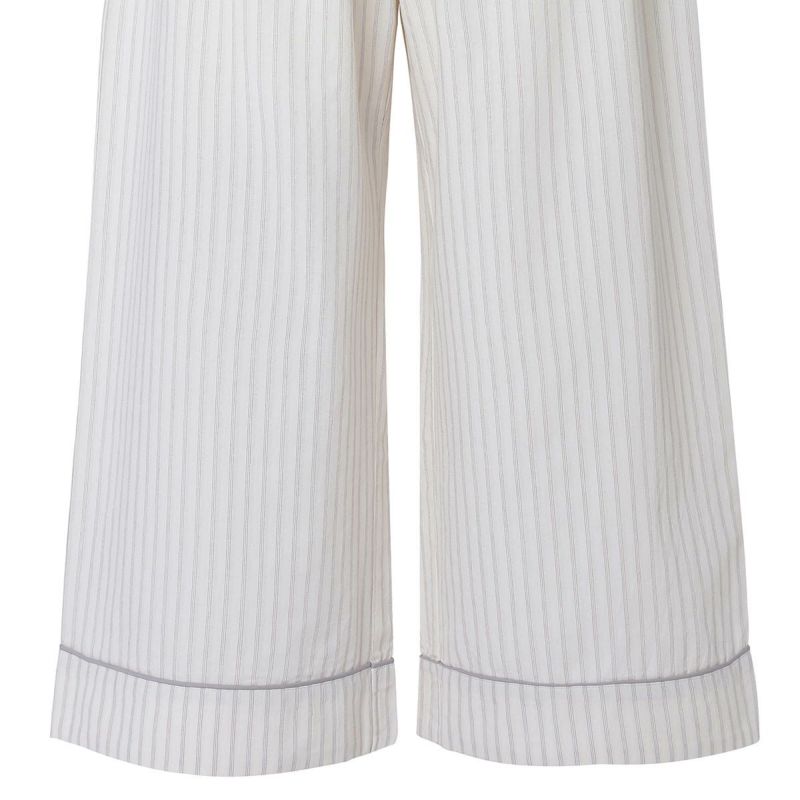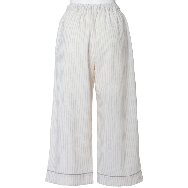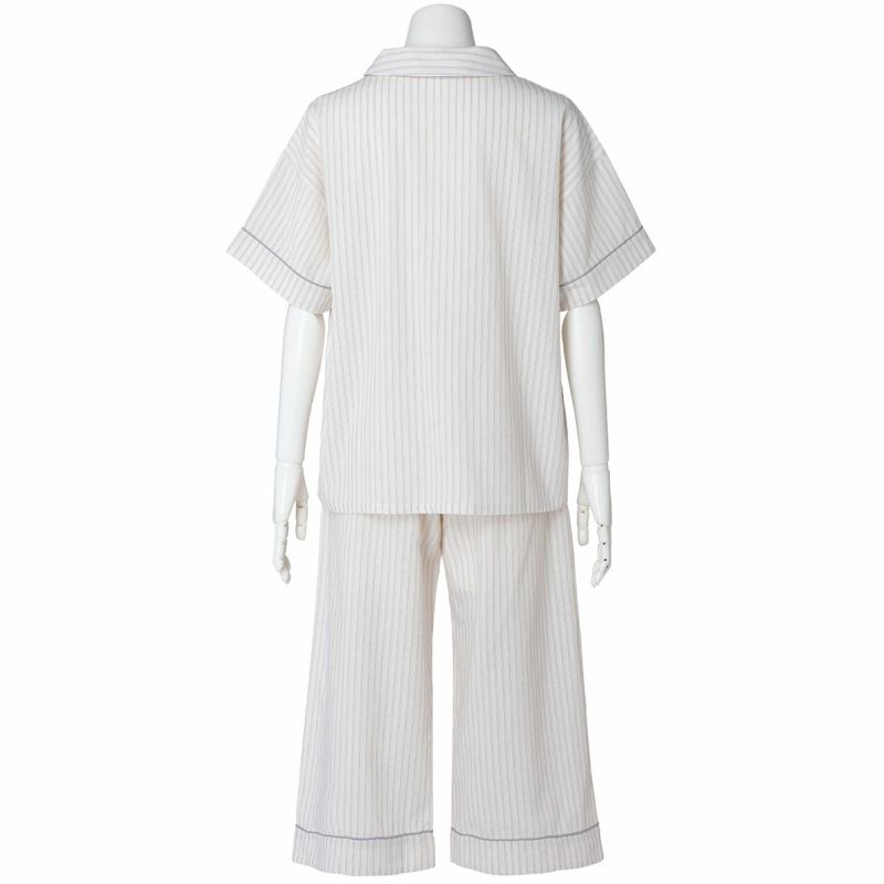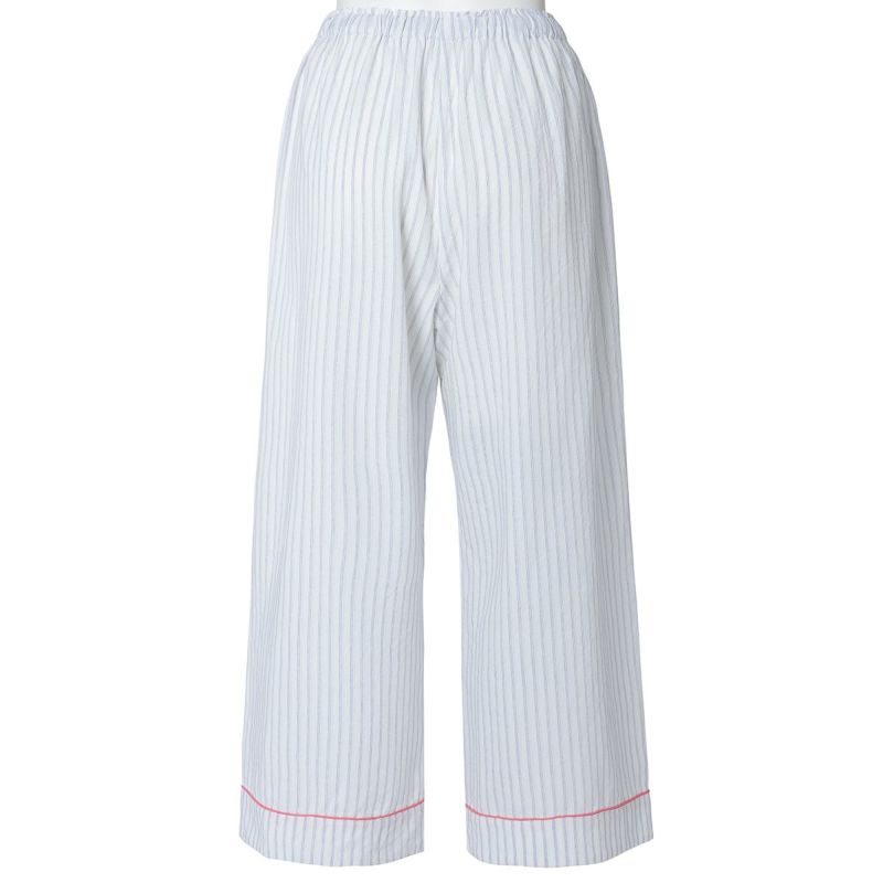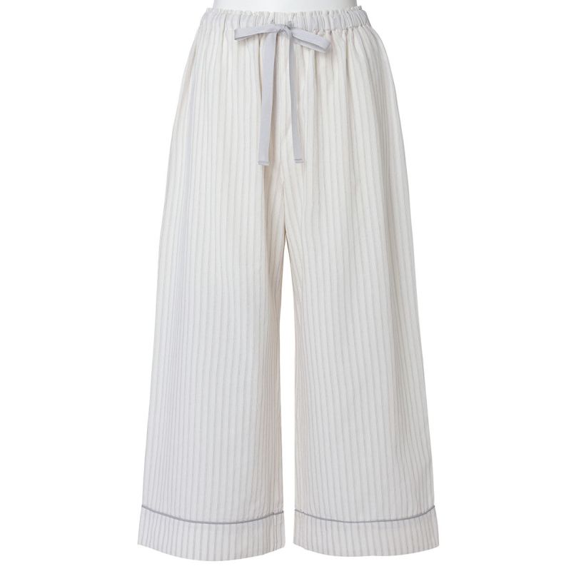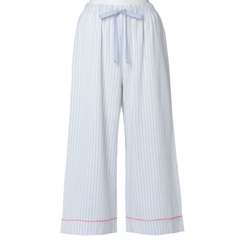 半袖パジャマは、小さめの襟がポイントのシャツデザイン。ボトムスは8分丈のセミワイドシルエット。パイピングとロゴが新鮮なアクセントになり、シンプルながらも洗練された印象に。おうち時間の気分を上げてくれる可愛らしい1着。