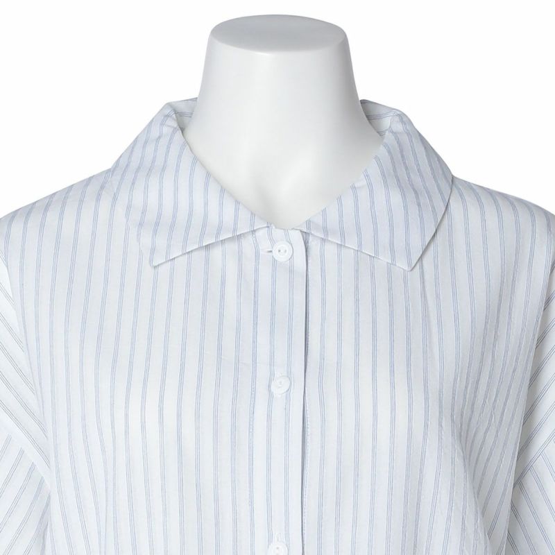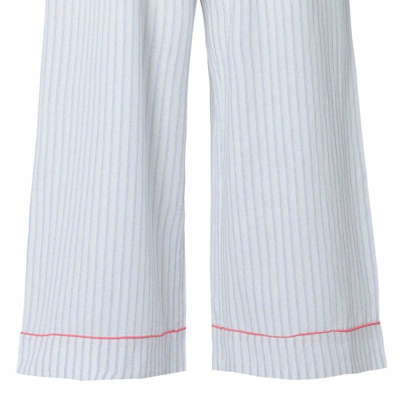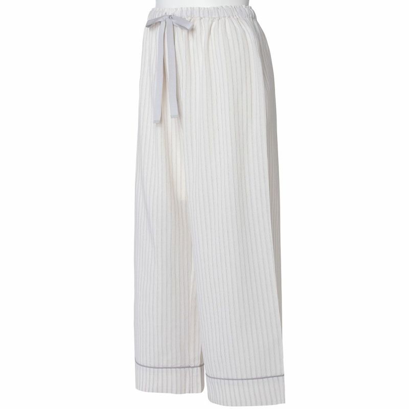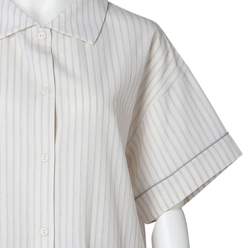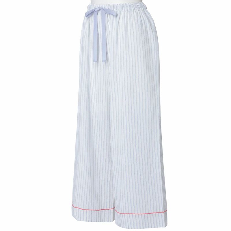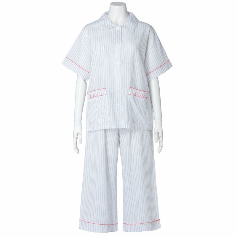 サッカー地のさりげない凹凸感のあるナイトウェアシリーズ。ストライプ方向にナチュラルな表情を生かした新素材。べたつかずさらっと着用できる。配色パイピングと配色ロゴ刺しゅうがデザインポイント◎