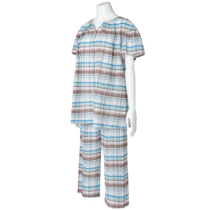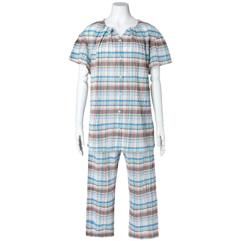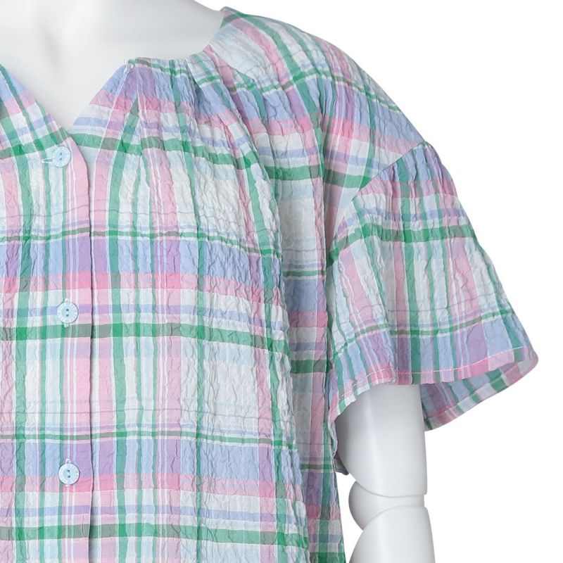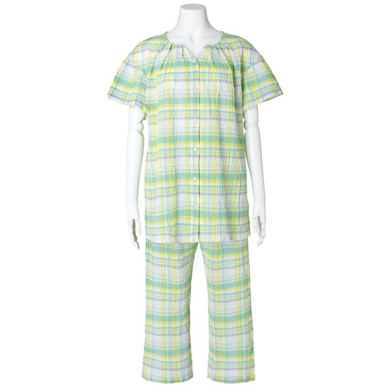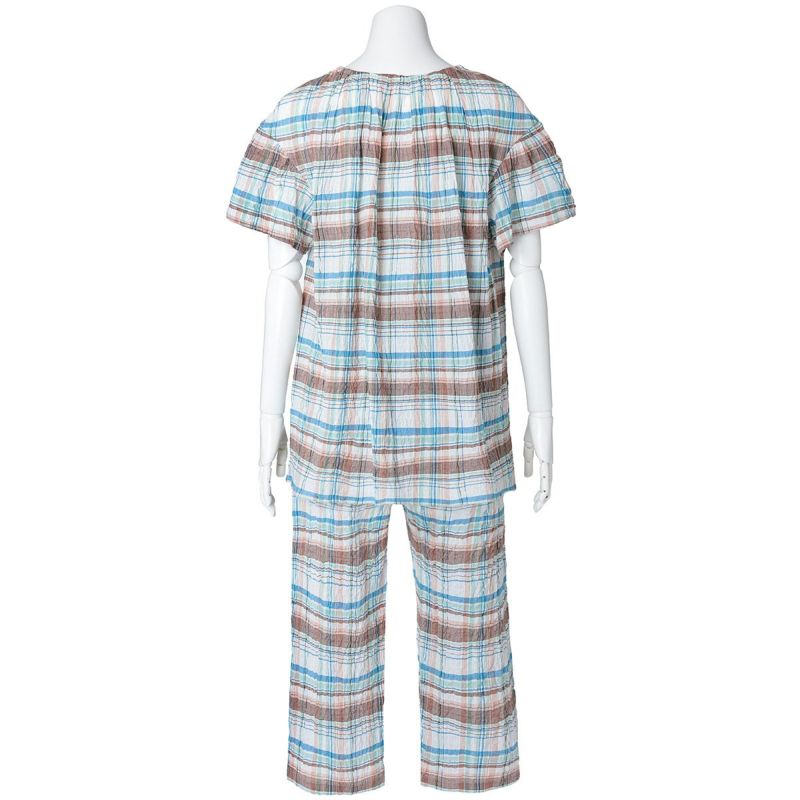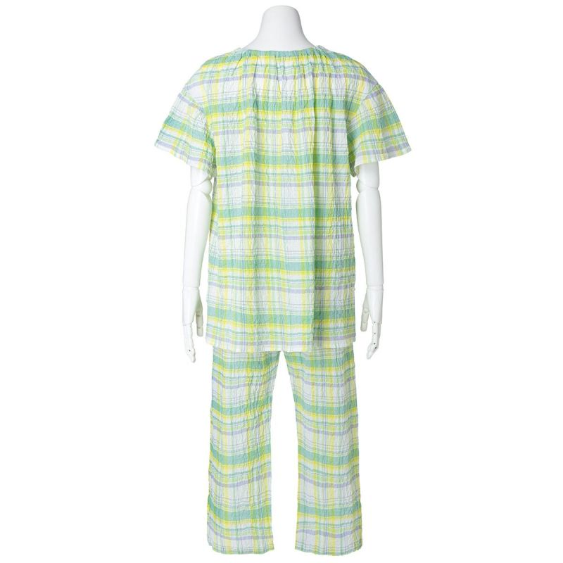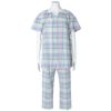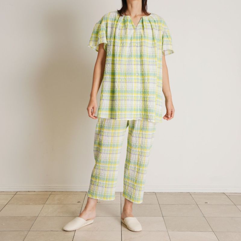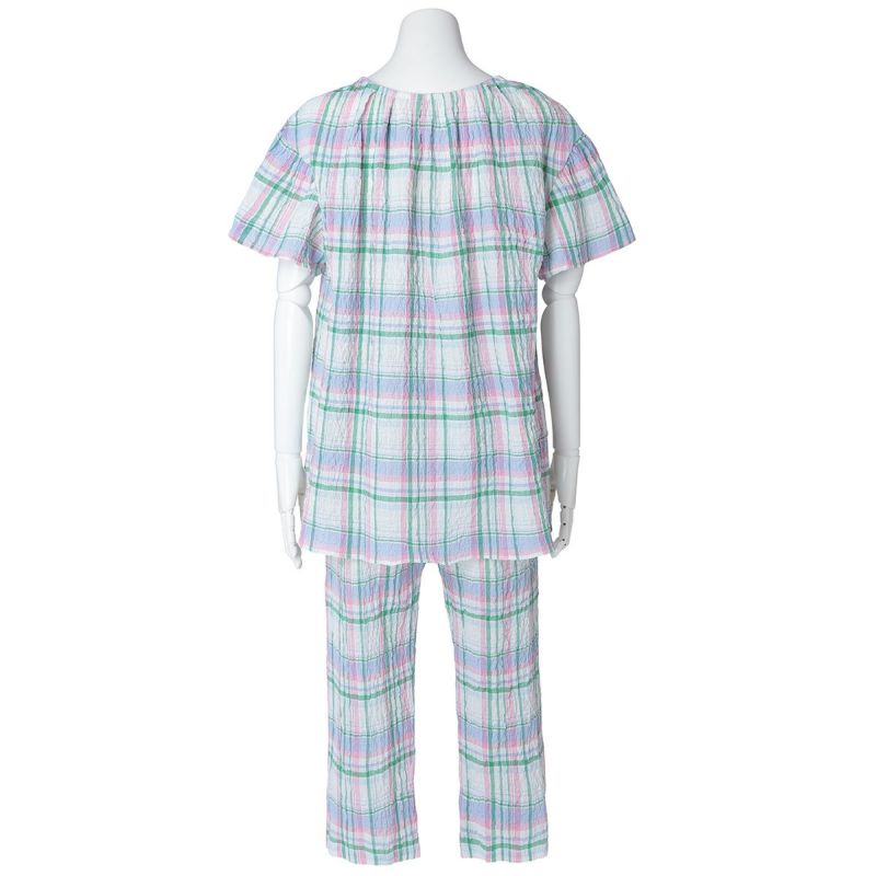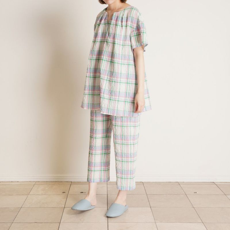 半袖パジャマは、ふんわりとしたAラインシルエットが可愛らしく肌離れの良いシルエット。首元はキーネックですっきりきれいに見せ、タックギャザーを寄せ軽やか。後ろ衿ぐりがインゴム仕様になっているのでボタンを外さなくても着脱しやすい。ボトムスは8分丈でトップスとバランスよく着こなせます。
