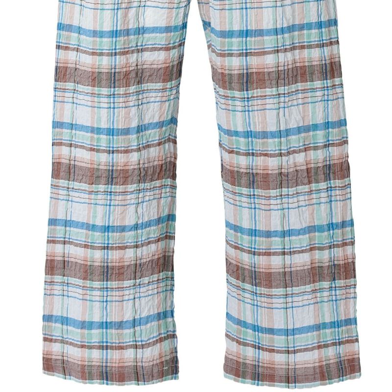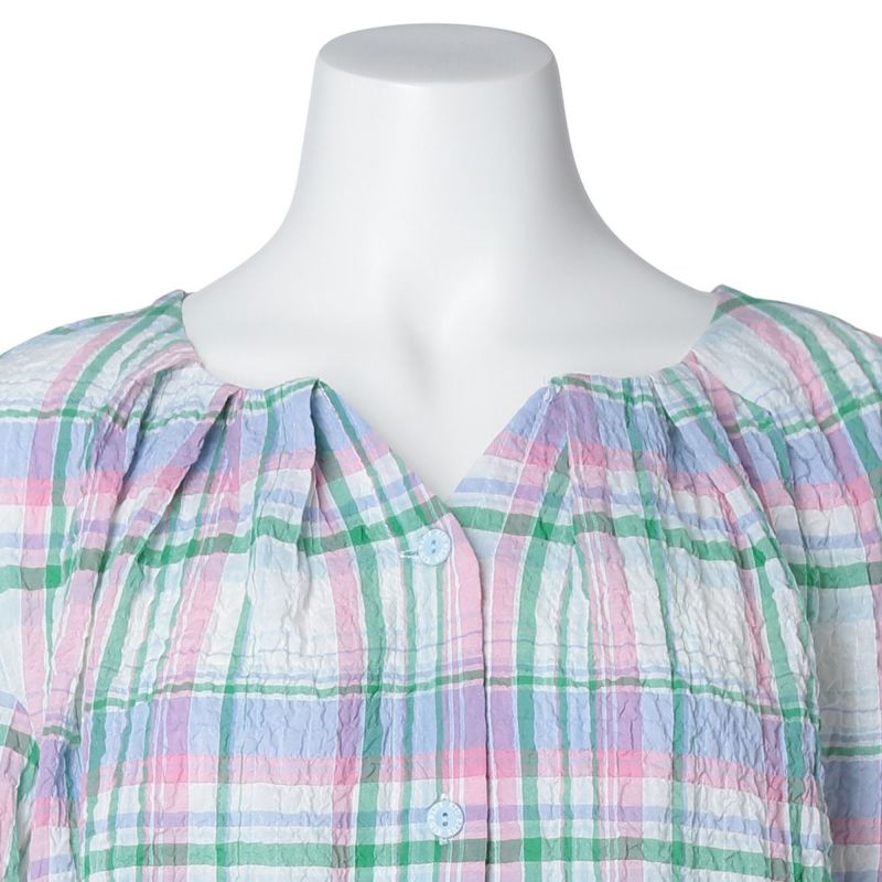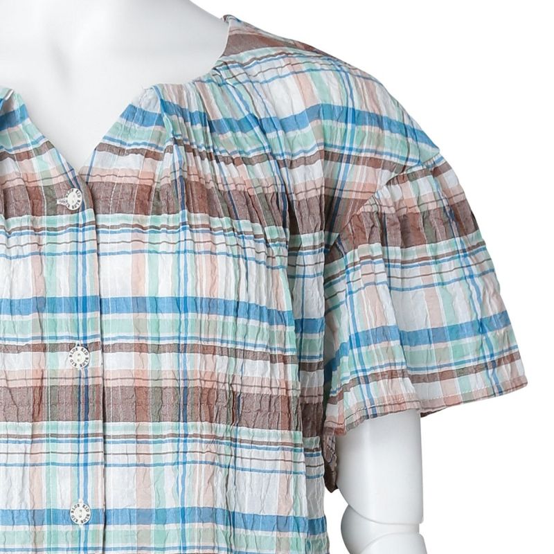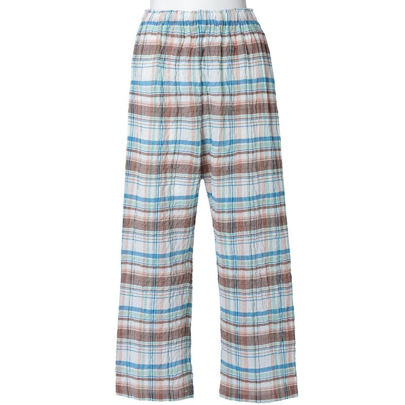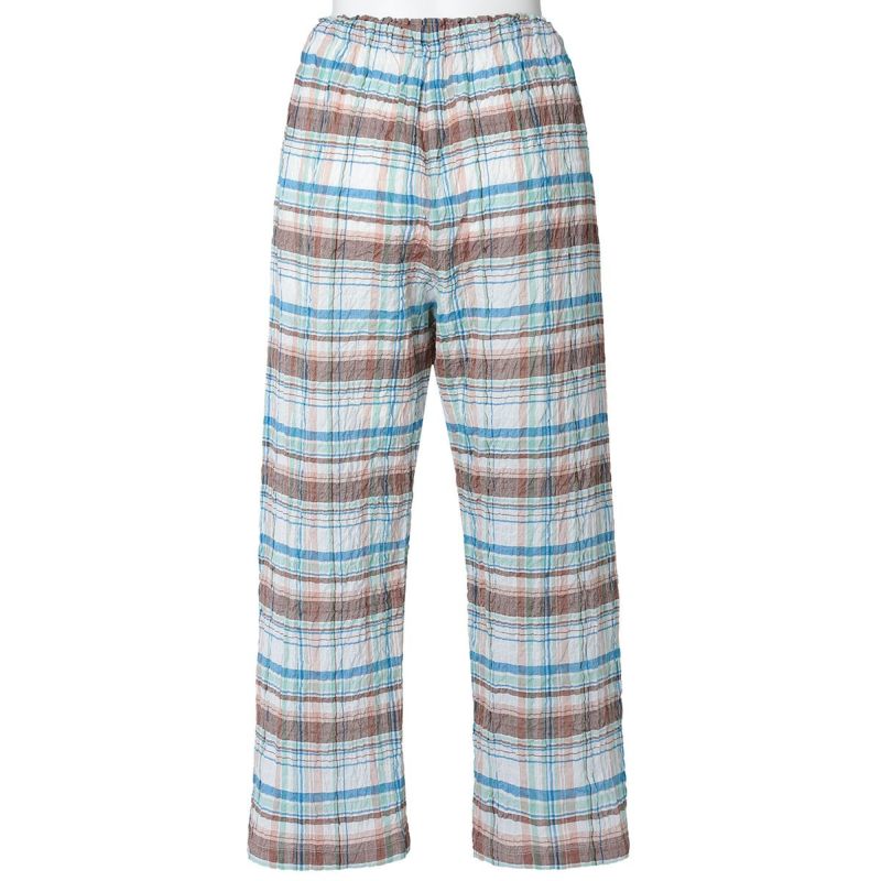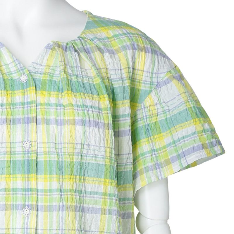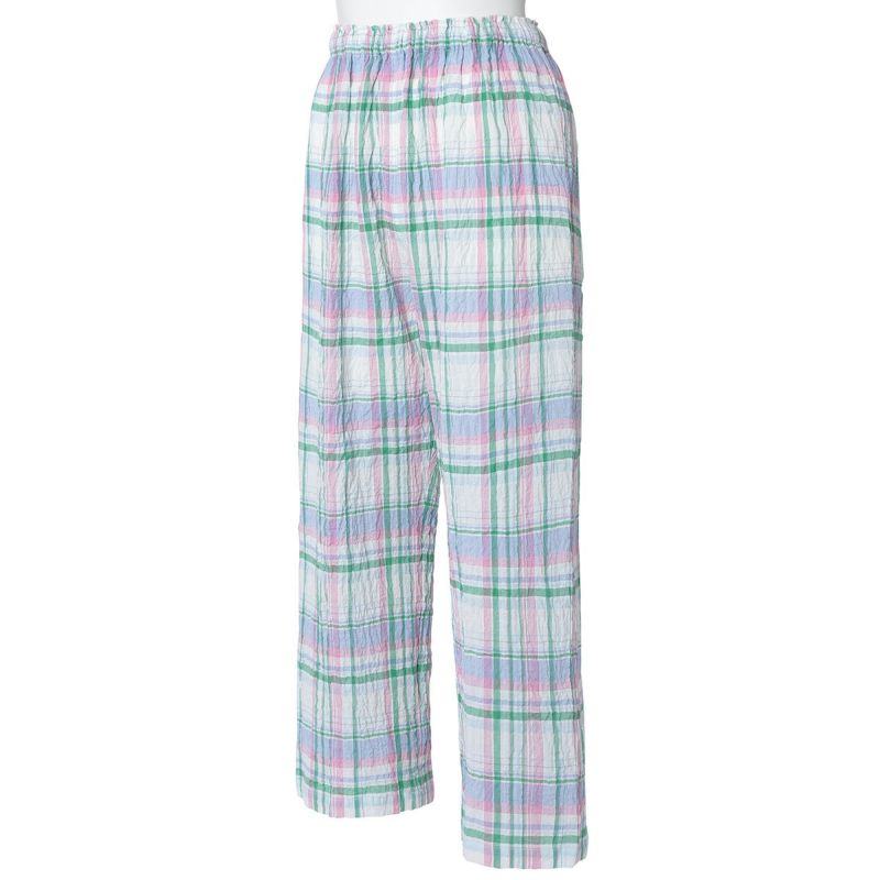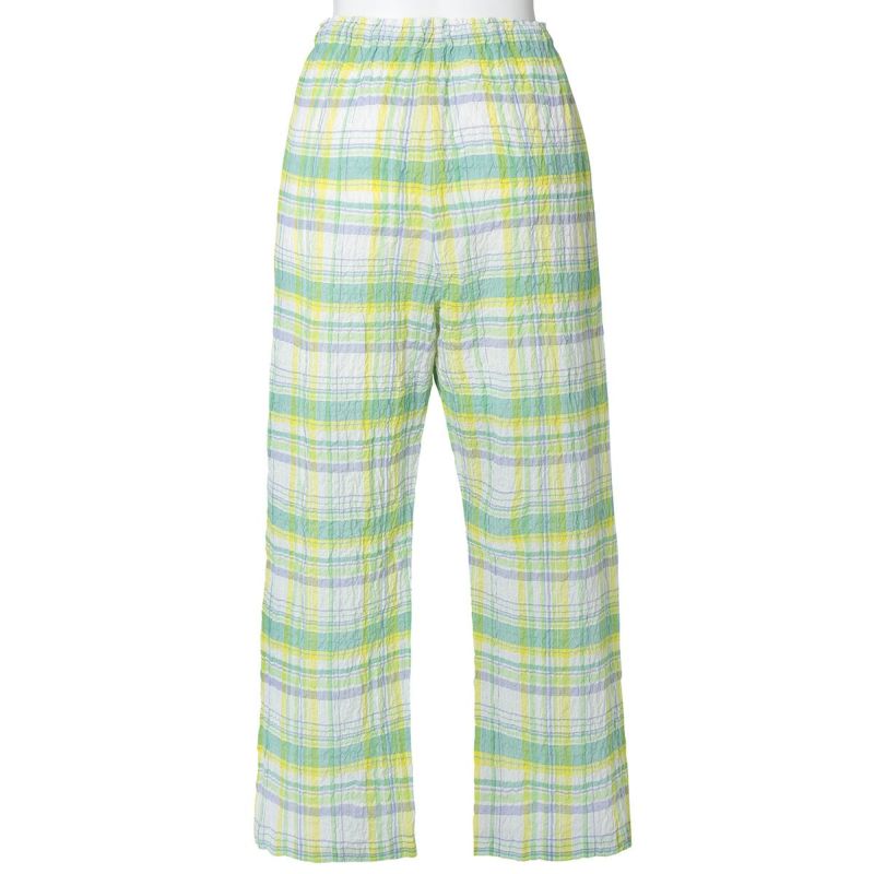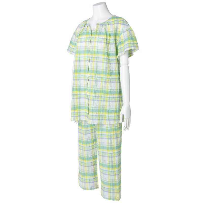 半袖パジャマは、ふんわりとしたAラインシルエットが可愛らしく肌離れの良いシルエット。首元はキーネックですっきりきれいに見せ、タックギャザーを寄せ軽やか。後ろ衿ぐりがインゴム仕様になっているのでボタンを外さなくても着脱しやすい。ボトムスは8分丈でトップスとバランスよく着こなせます。