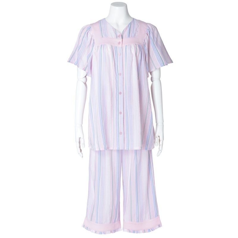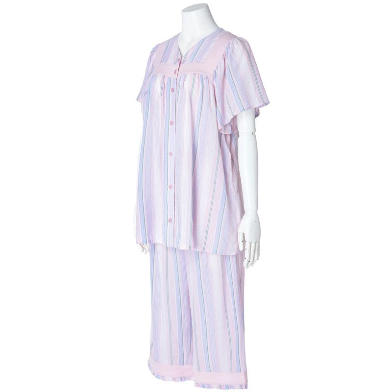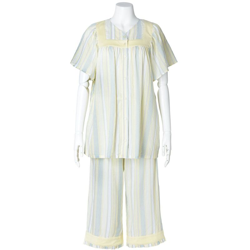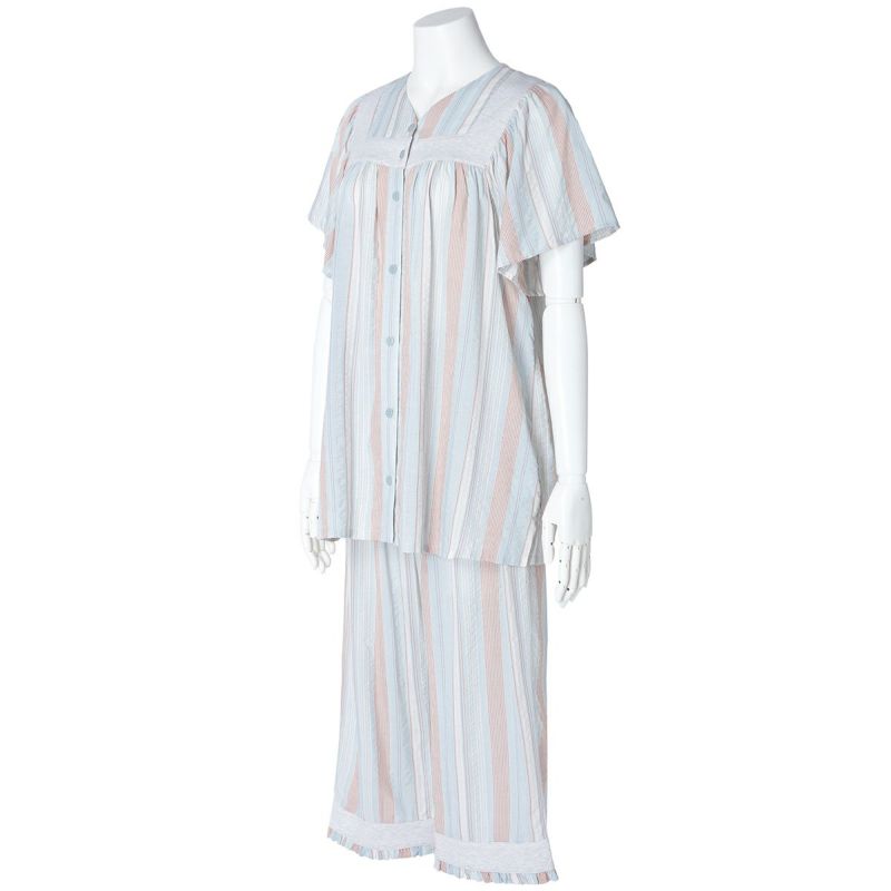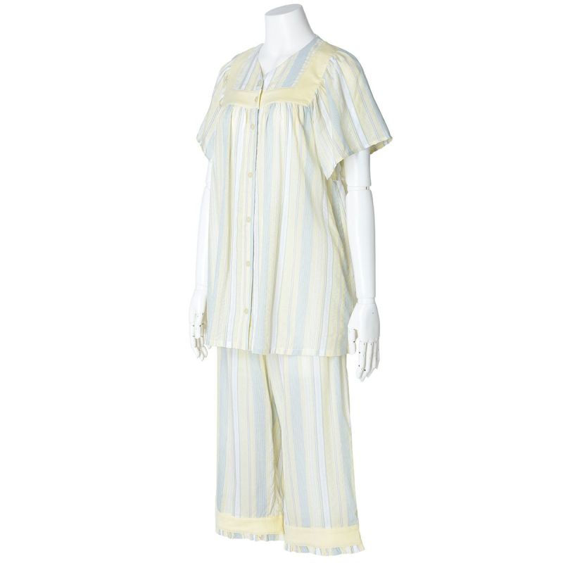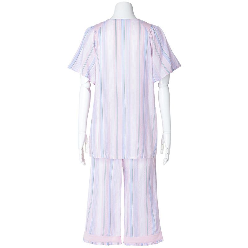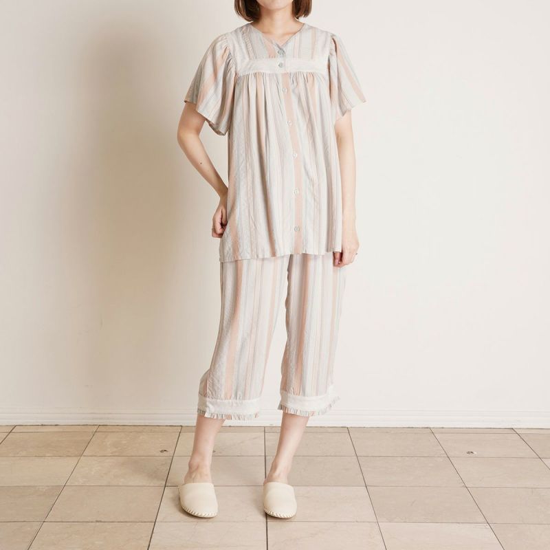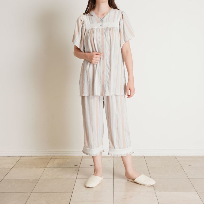 半袖パジャマは、前開きトップスと7分丈ボトムスのセット。トップスはすっきりしたVネックにフレアスリーブでほどよく二の腕が隠れる仕様。襟元や裾の切り替え天竺がデザインポイント。さらっと心地いい着用感が魅力で、おうち時間も快適に過ごせます。