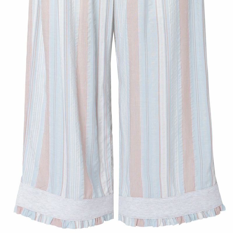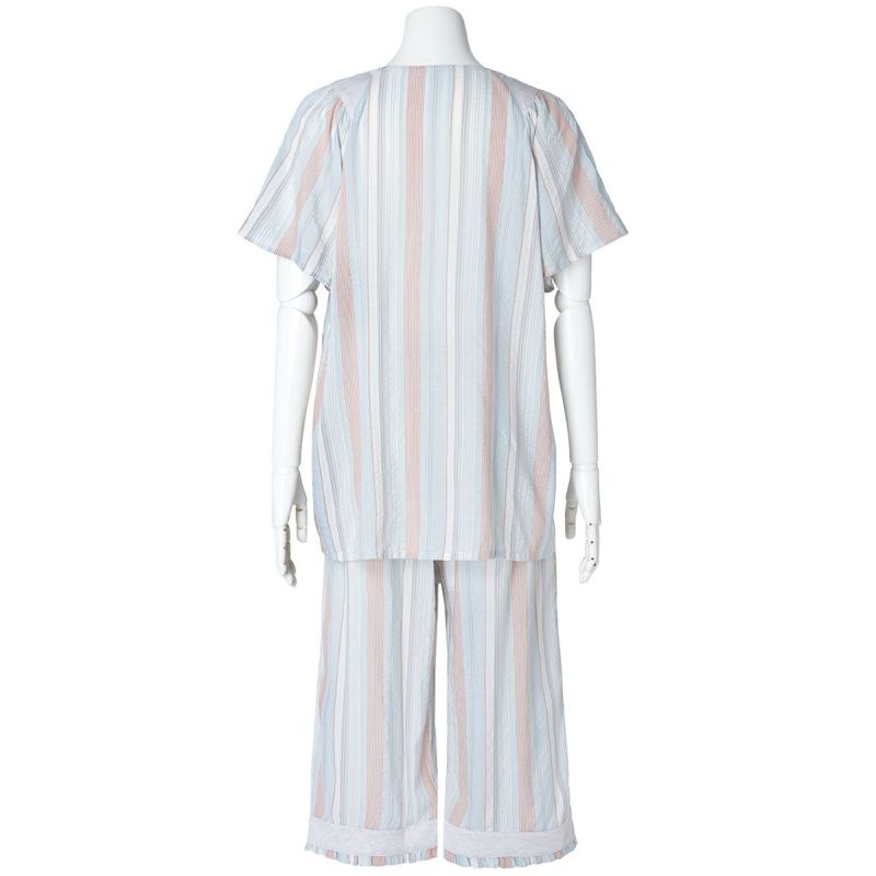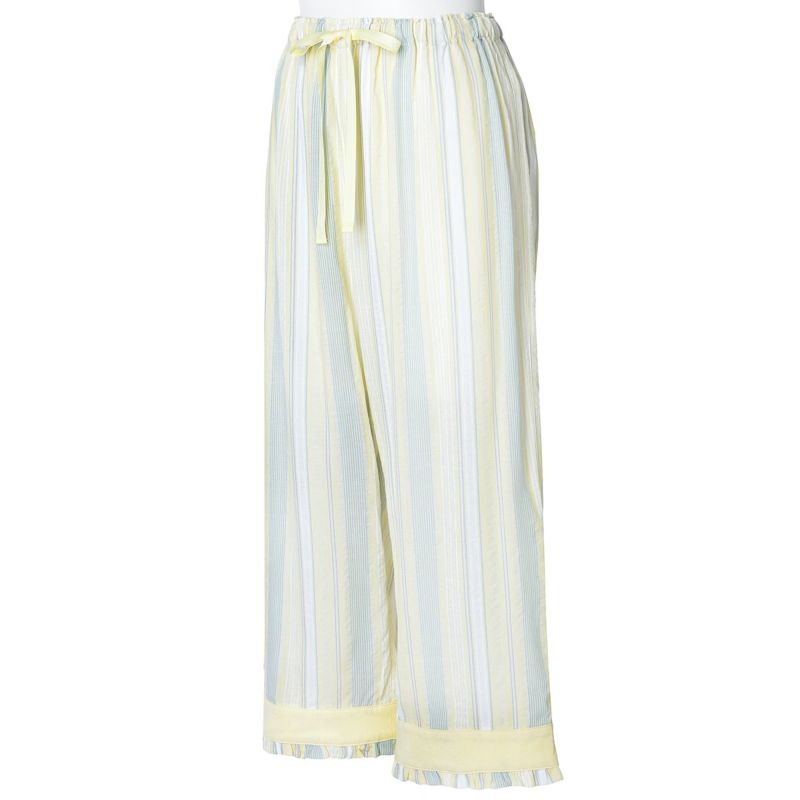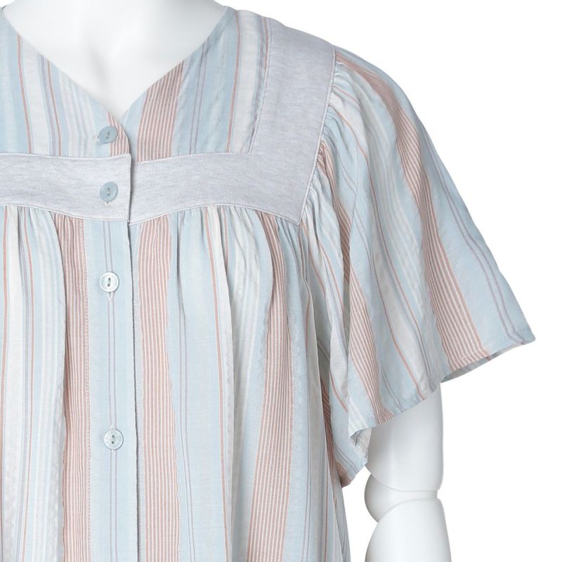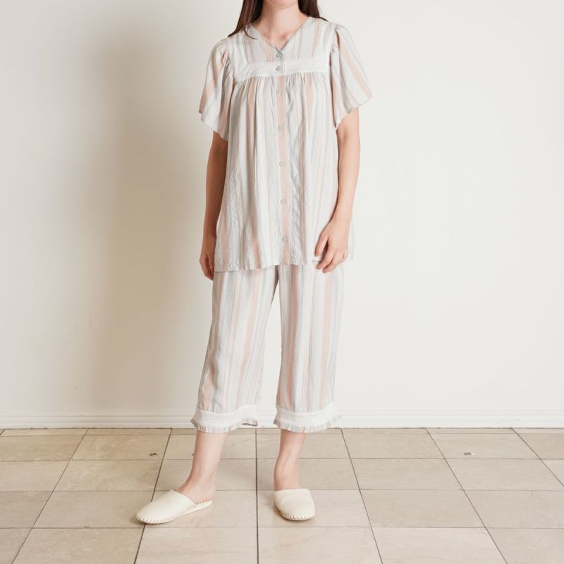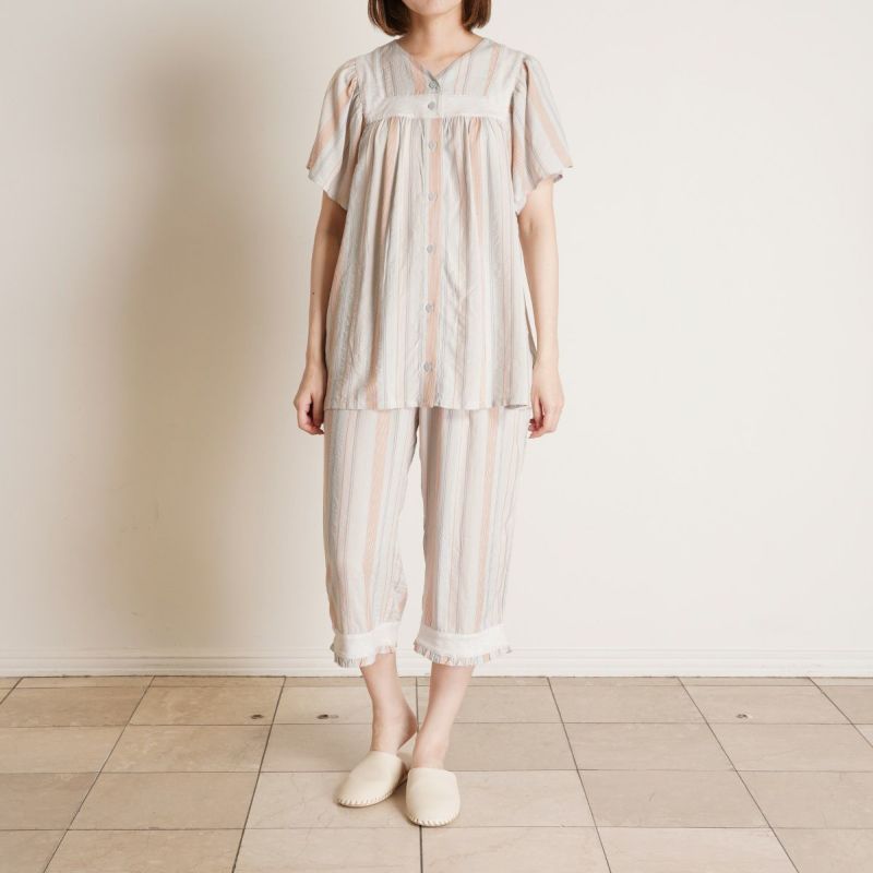 生地に凹凸を出したさらっと肌離れが良く春夏にちょうどいい素材のナイトウェアシリーズ。自然な落ち感が美しい。縦ラインを強調するオリジナルのストライプ柄は細見え効果も嬉しい。