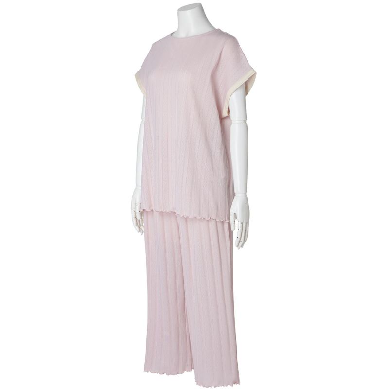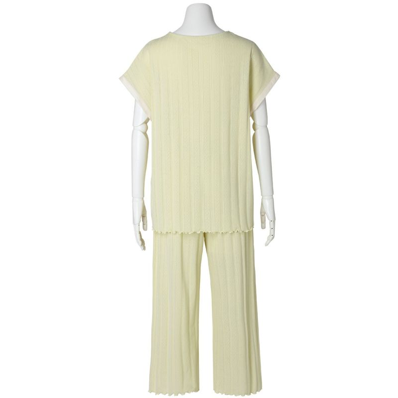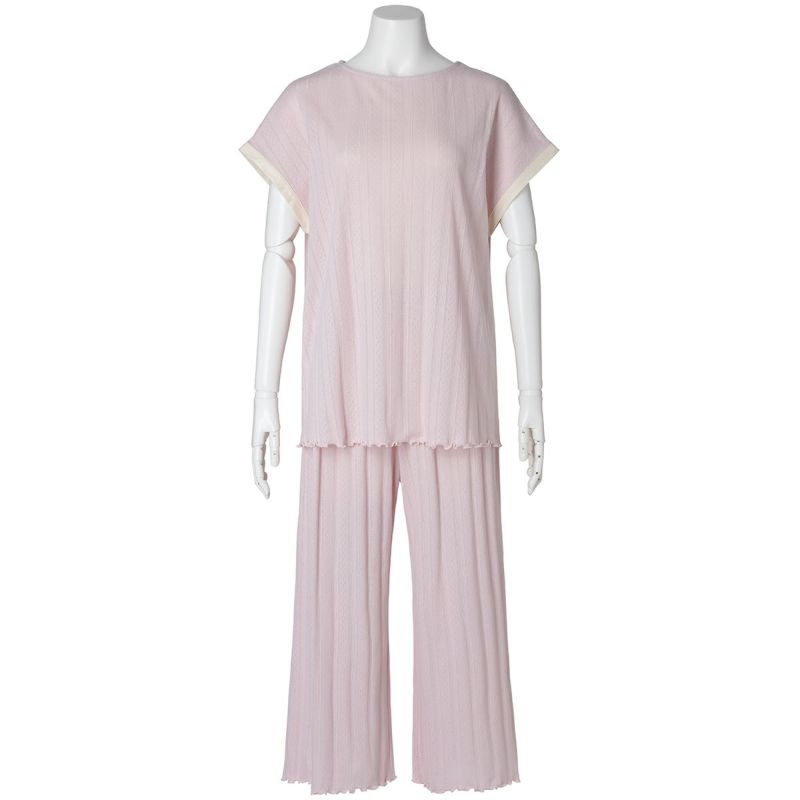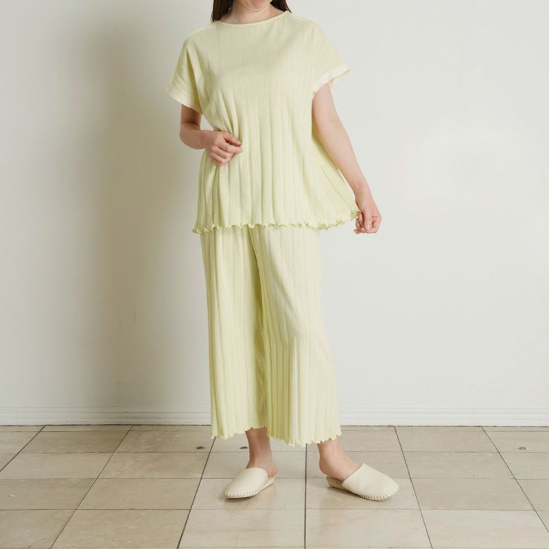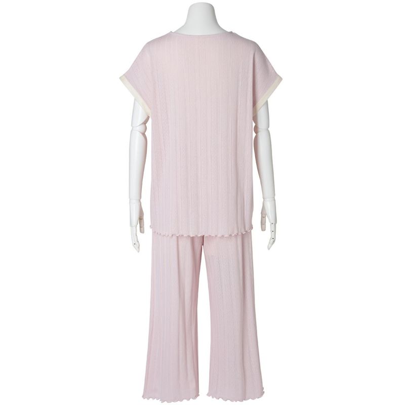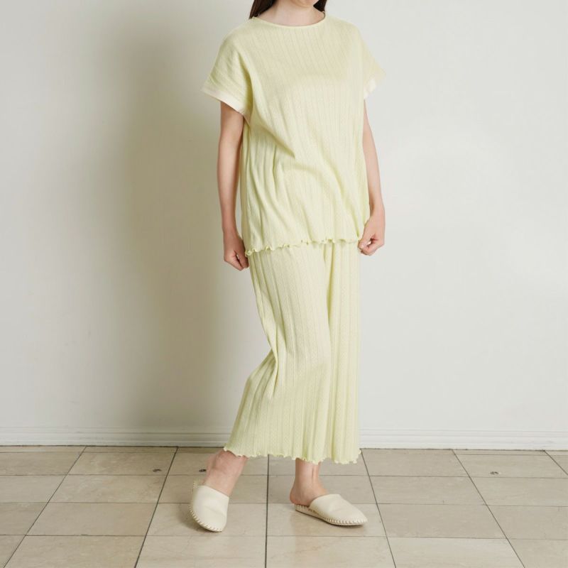 針抜きパターンメッシュ素材を採用し、夏にぴったりの通気性に優れた涼やかな着心地。綿100%の柔らかな風合いでリラックスタイムを心地よく過ごせるシリーズ。