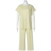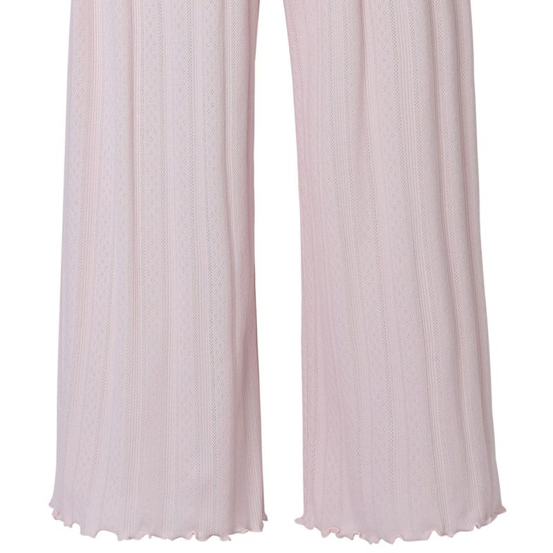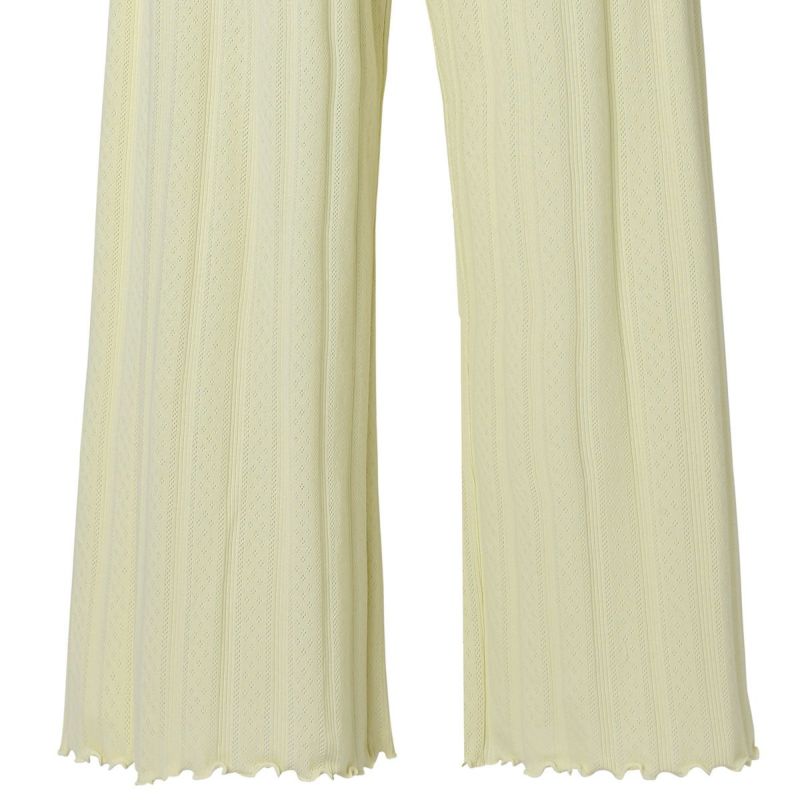 パジャマはフレアに広がるゆったりしたトップスに身頃から続いた縫い目がない袖で、よりリラックスした着用感。パンツは裾を軽やかなメロー始末で仕立て、ややワイドで過ごしやすく。袖の別生地がきちんと見えのポイントに。