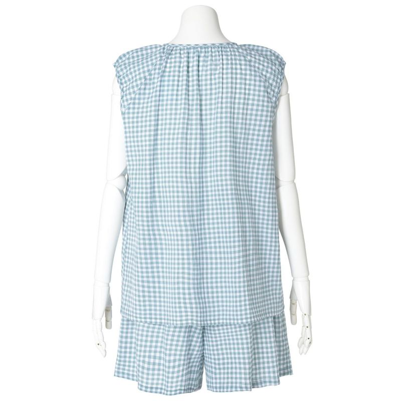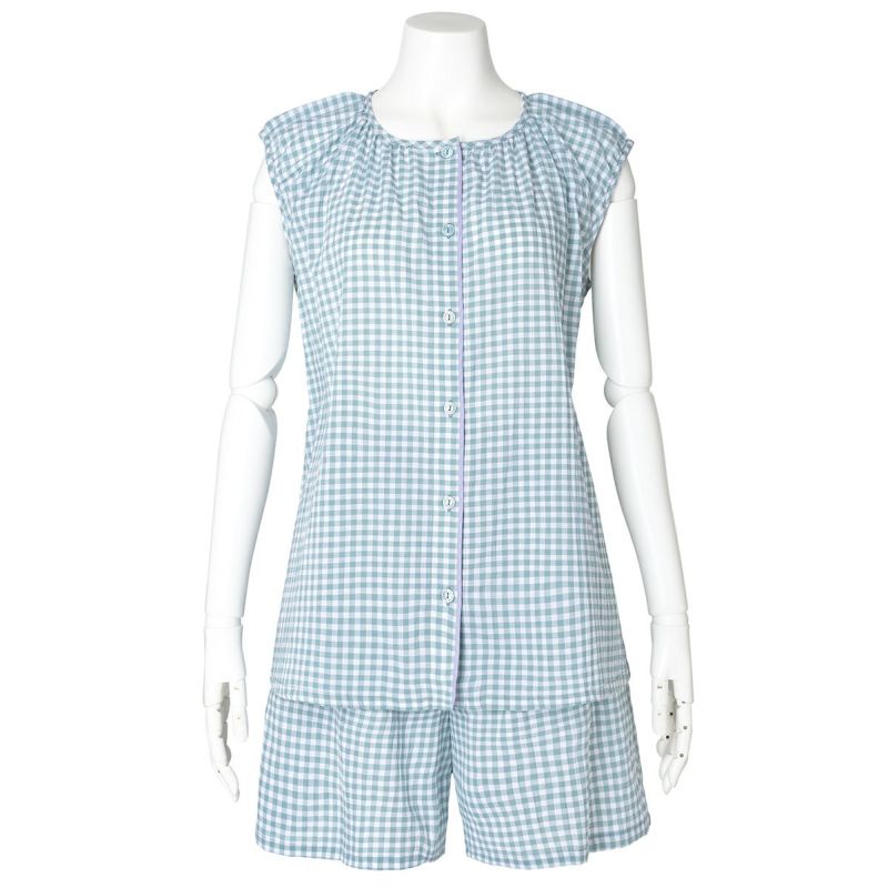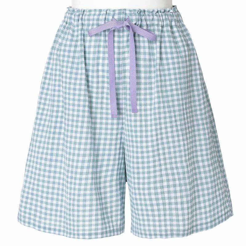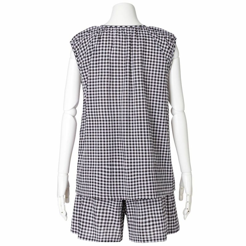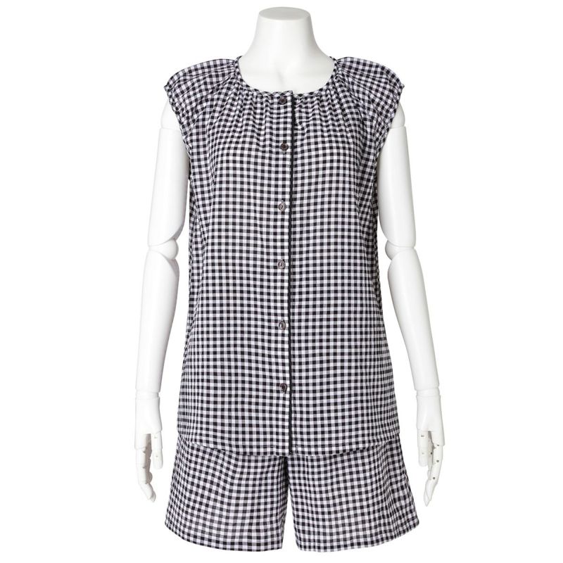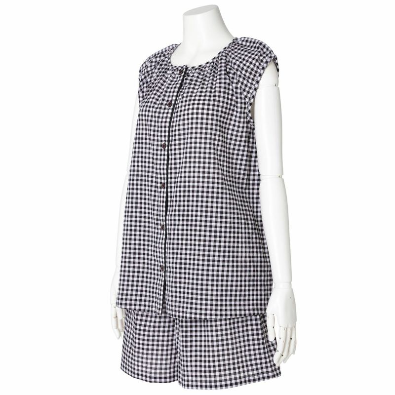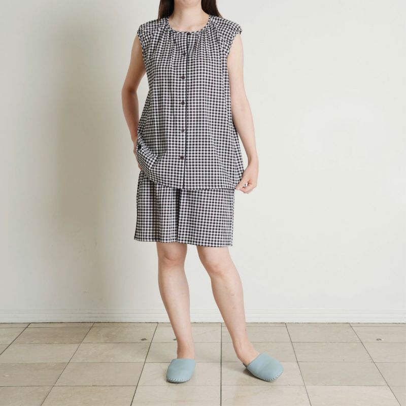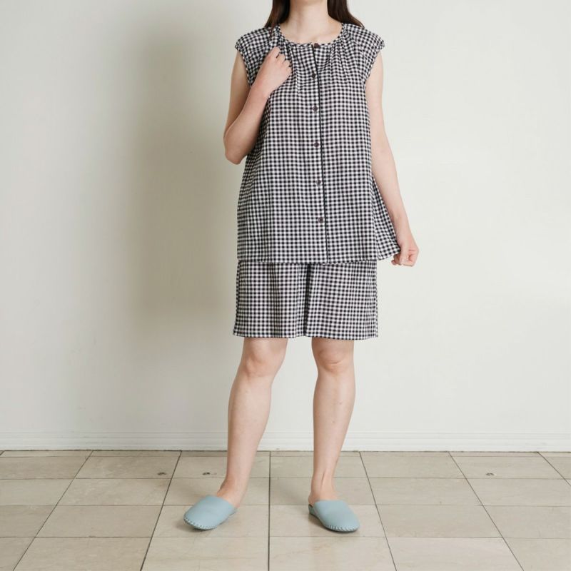 フレアシルエットのトップスと5分丈ショートボトムのセットのフレンチスリーブパジャマ。トップスはサイドにバイヤス使いしたチェック地を施し凝った見え感。首元もギャザーで大人っぽく仕上げました。肩先まで隠れる袖丈はインゴムにし二の腕が少し隠れるデザイン。ボトムは便利なポケット付き。
