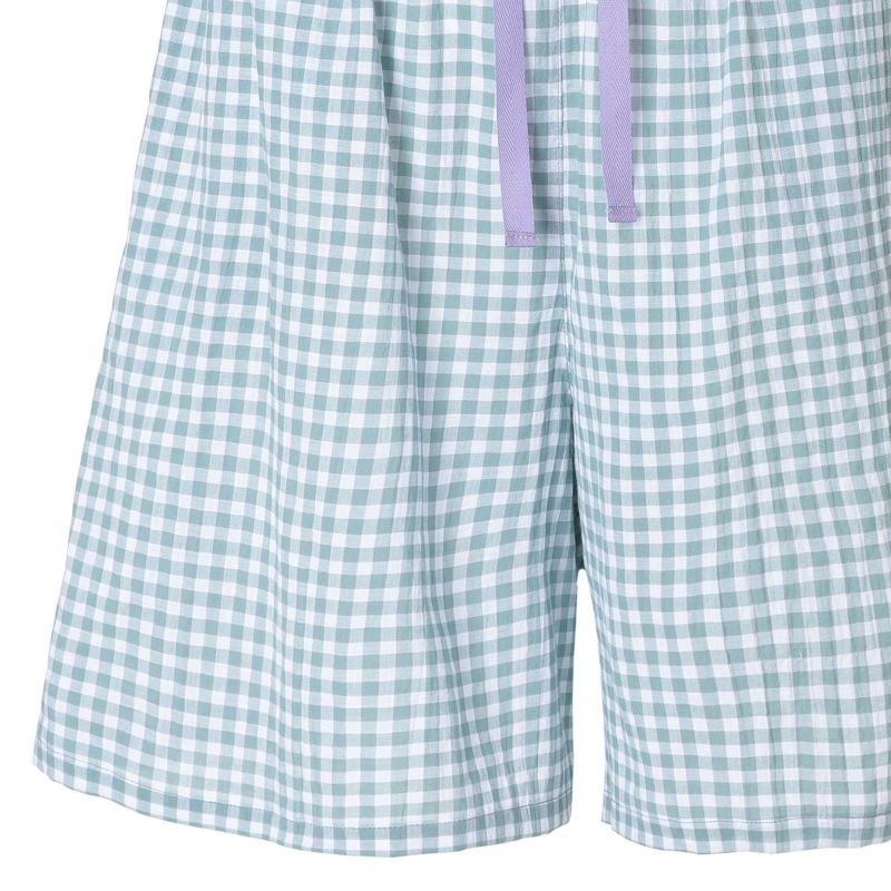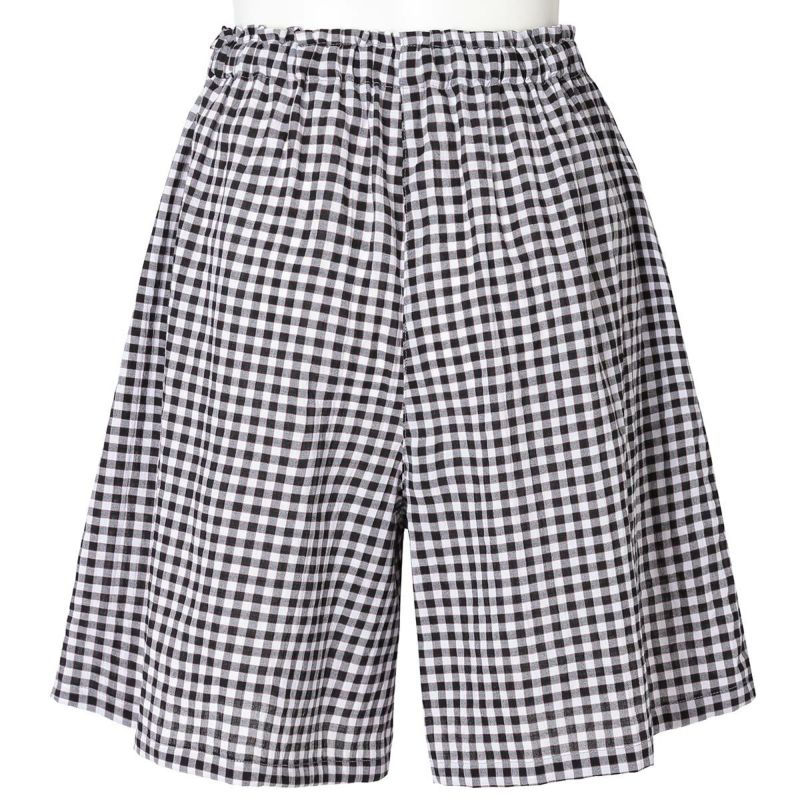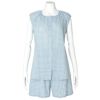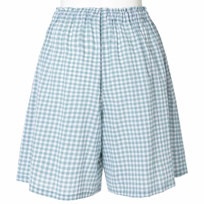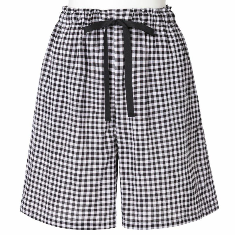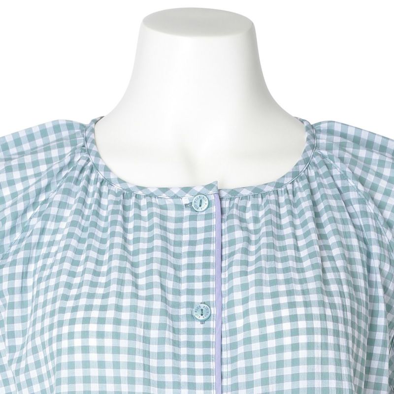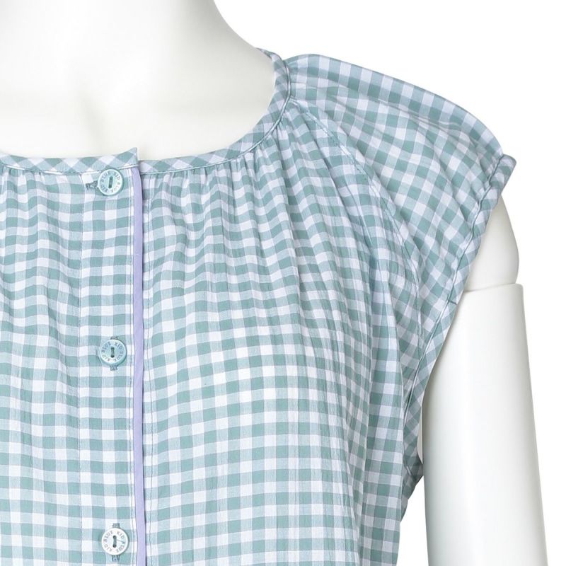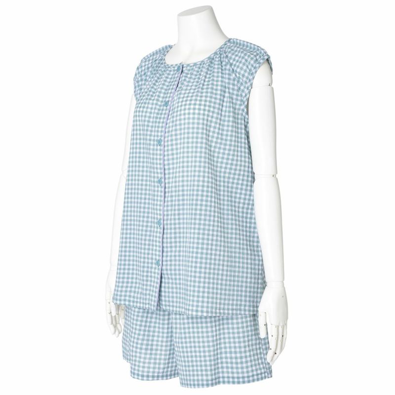 フレアシルエットのトップスと5分丈ショートボトムのセットのフレンチスリーブパジャマ。トップスはサイドにバイヤス使いしたチェック地を施し凝った見え感。首元もギャザーで大人っぽく仕上げました。肩先まで隠れる袖丈はインゴムにし二の腕が少し隠れるデザイン。ボトムは便利なポケット付き。
