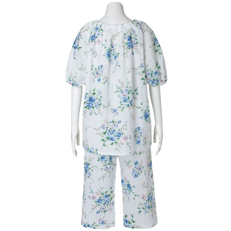 立体感のある夏素材が華やかなローズ柄を引き立てる涼やかなシリーズ。軽やかさと凹凸感による肌離れの良さが魅力です。柄が際立つオフホワイトと爽やかなサックスの2色展開。