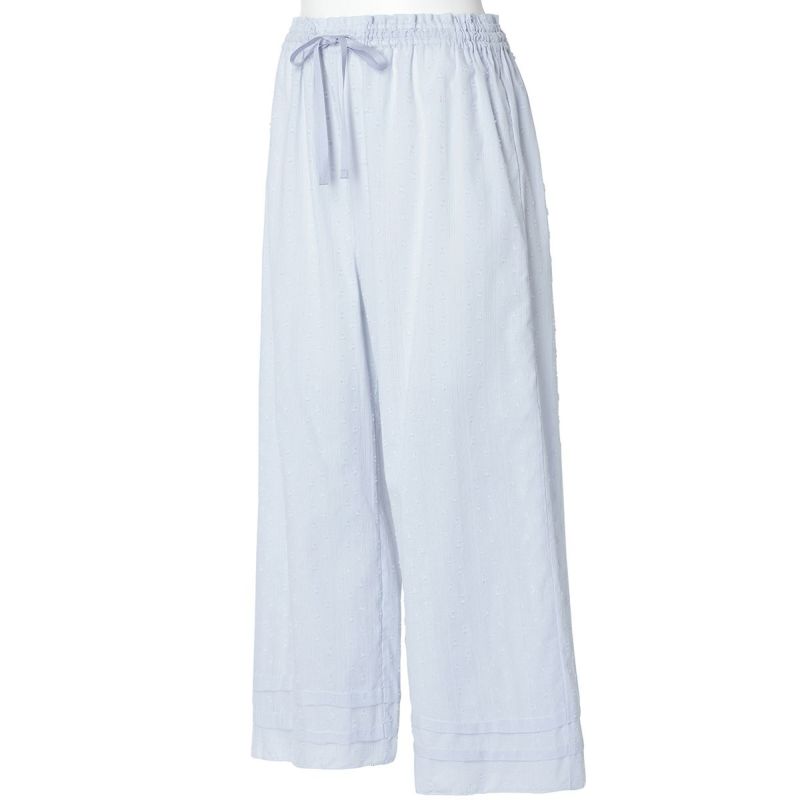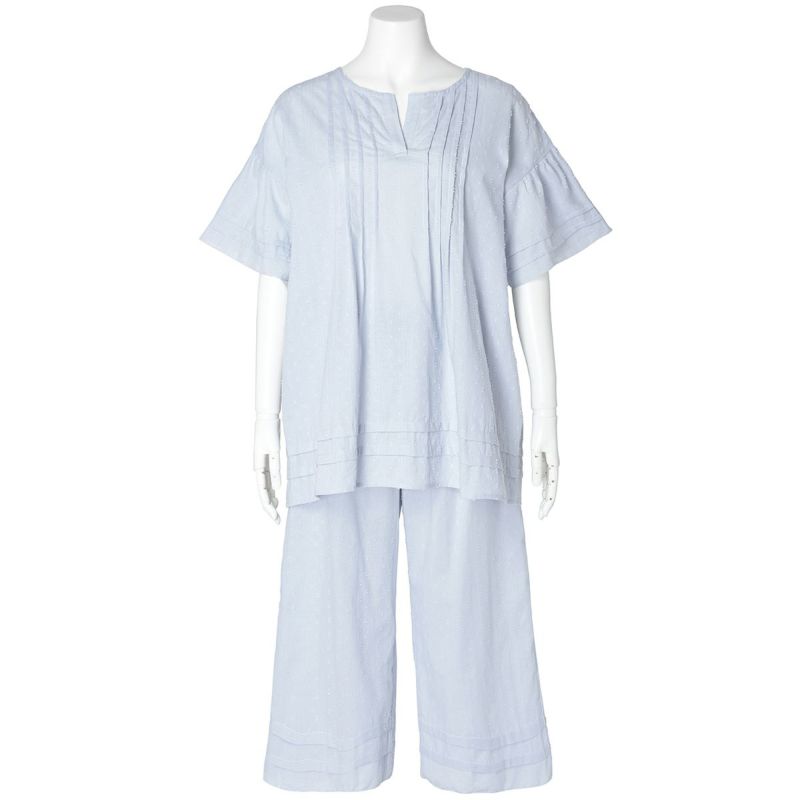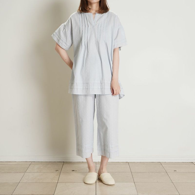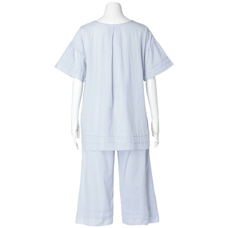 裾や袖口に施したピコや、ピンタックでさりげない可憐さをプラスした半袖パジャマ。ゆったりとしたシルエットのトップスにセミワイドのパンツで肌離れもいいので快適に着用できます。見た目も着心地もやさしい一着で、おうち時間や休日のくつろぎにぴったりです。