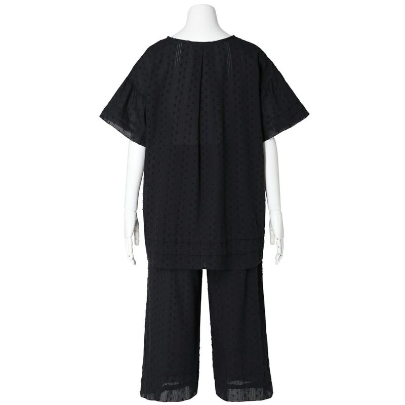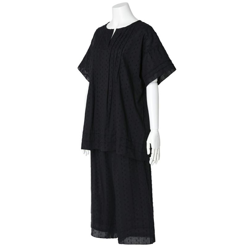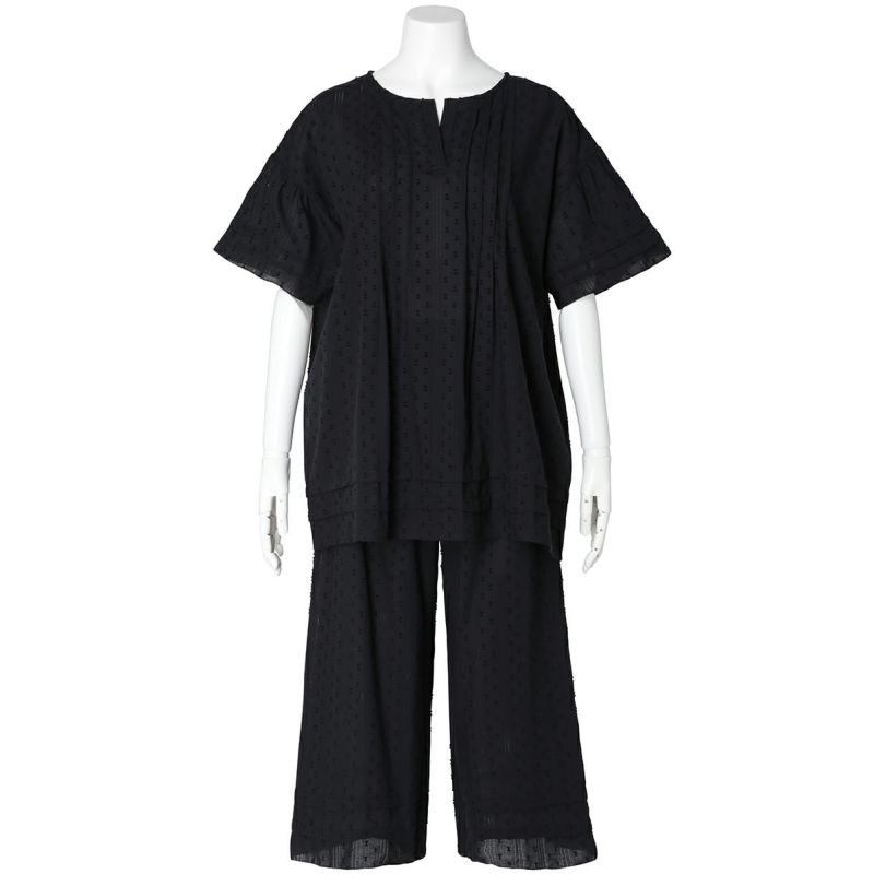 カットドビーのドット柄が大人のかわいさを演出するナイトウエアシリーズ。ナチュラル感が引き立つカットドビー素材は、肌離れもよく軽やかな風合いで汗ばむ季節も快適に過ごせます。ニュアンスのあるサックスとブラックの落ち着いた2色展開。リラクシング、ワンマイルウェアとしての着用もおすすめです。