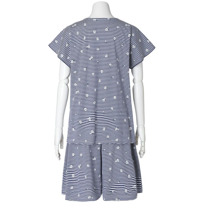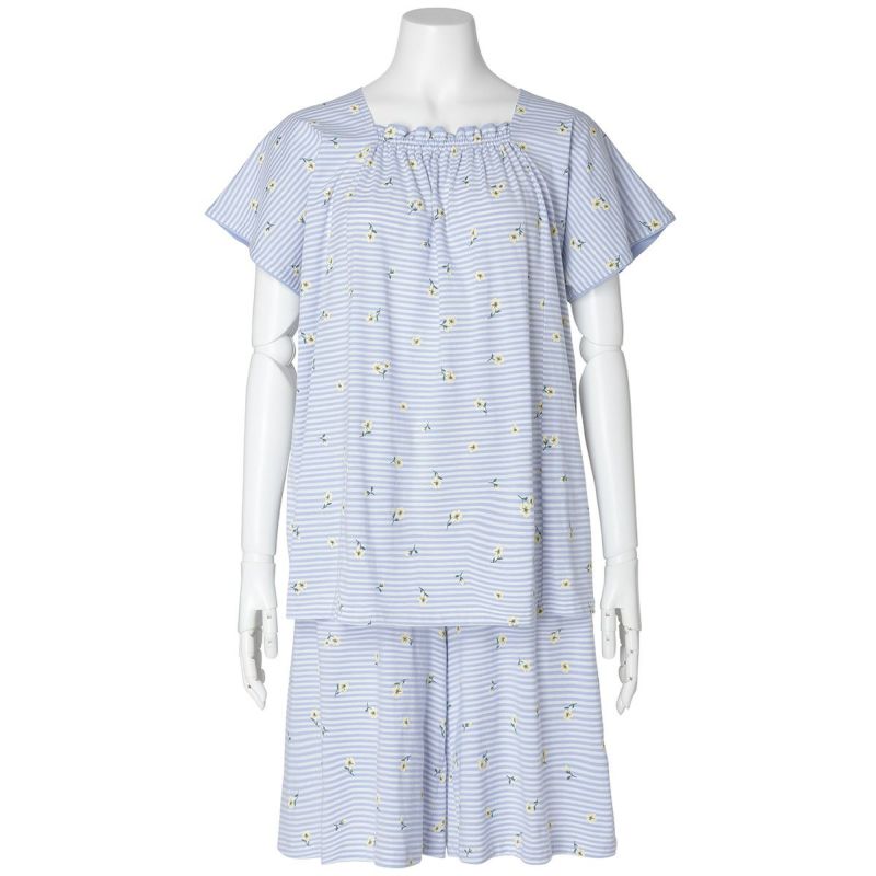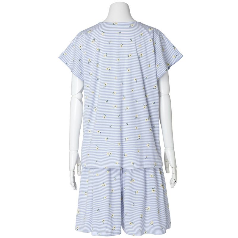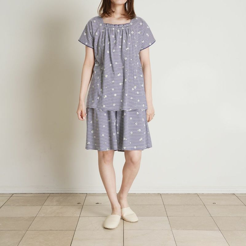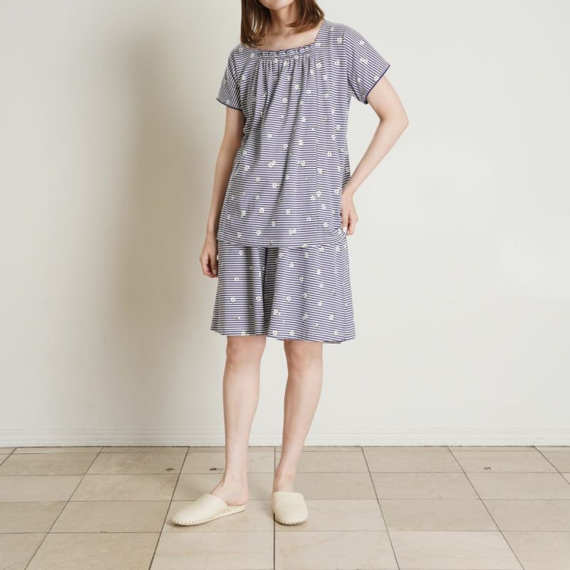 半袖パジャマのトップスは胸元にギャザーを寄せたデザインで華やかさをプラス。顔まわりをすっきり見せつつシンプルすぎないアクセントに。ボトムスは便利なポケット付きの5分丈で真夏も快適に。