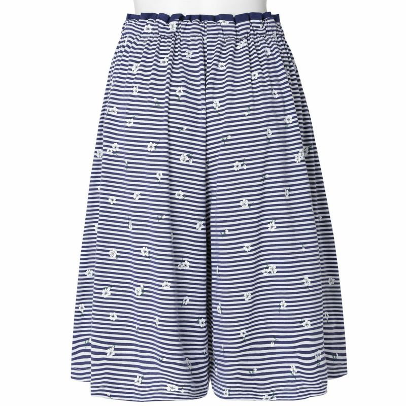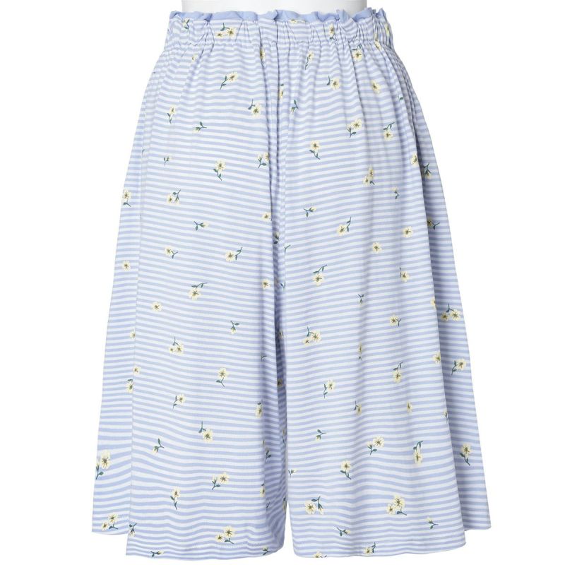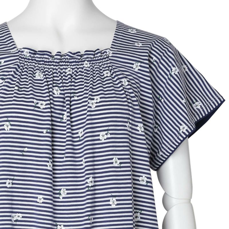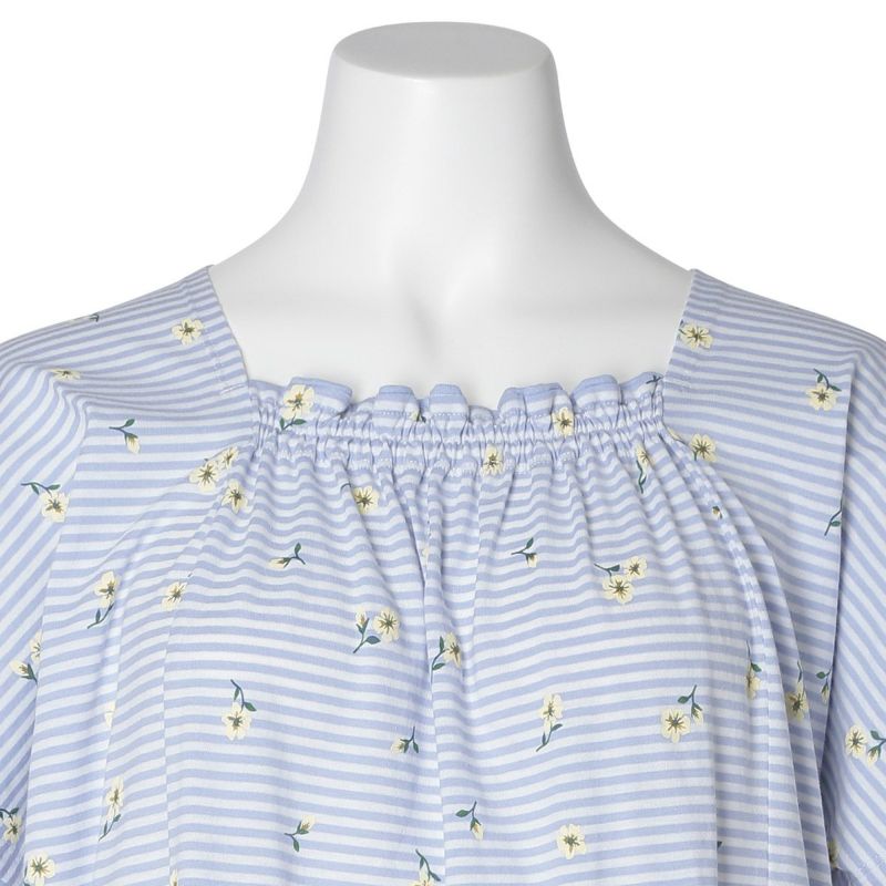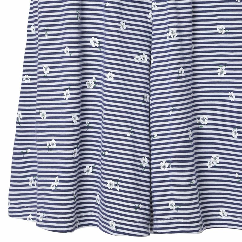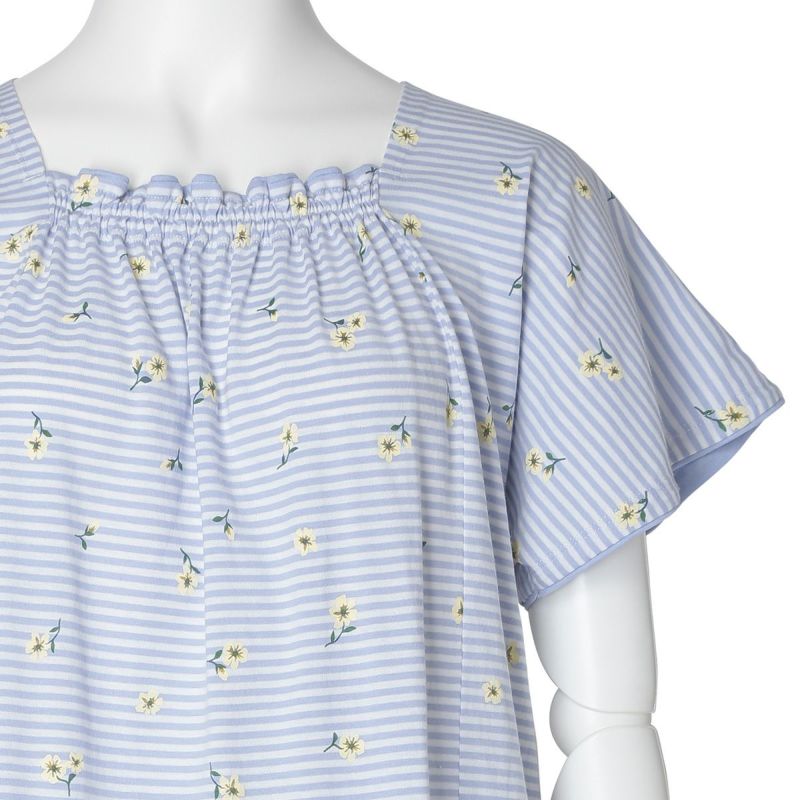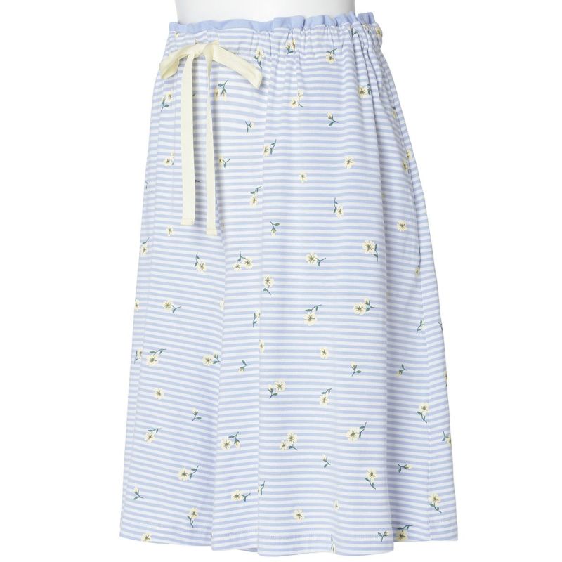 ボーダー柄の天竺素材に散りばめられた小花が映える、カジュアルすぎず、甘すぎないそんな絶妙なバランスが魅力です。清涼感のあるサックスとブルーの2色展開。