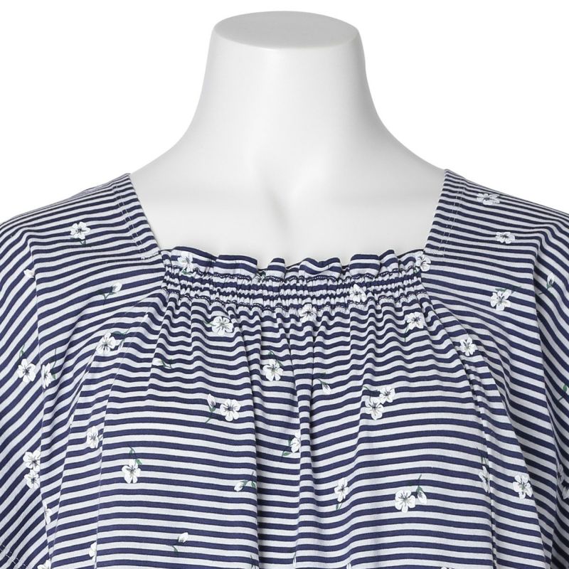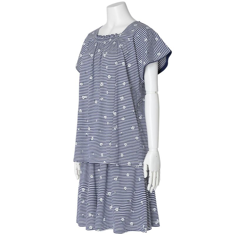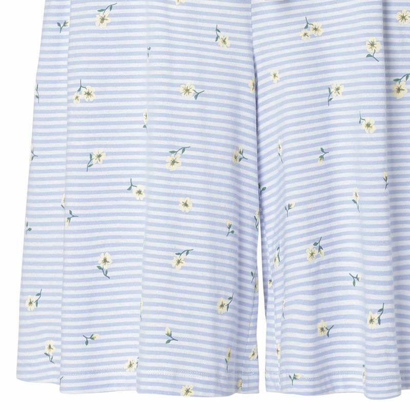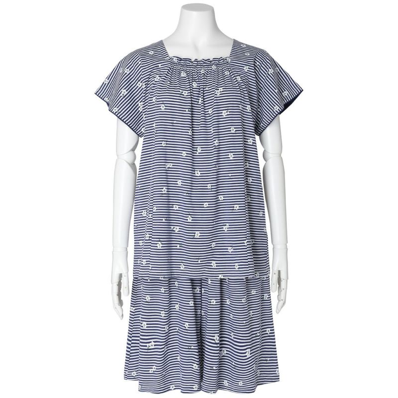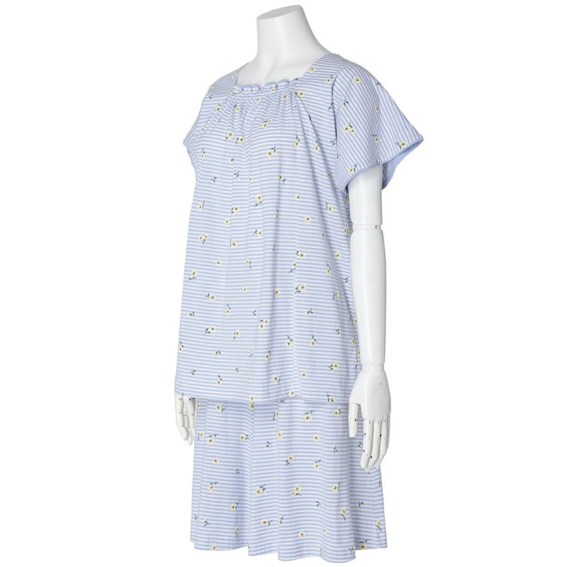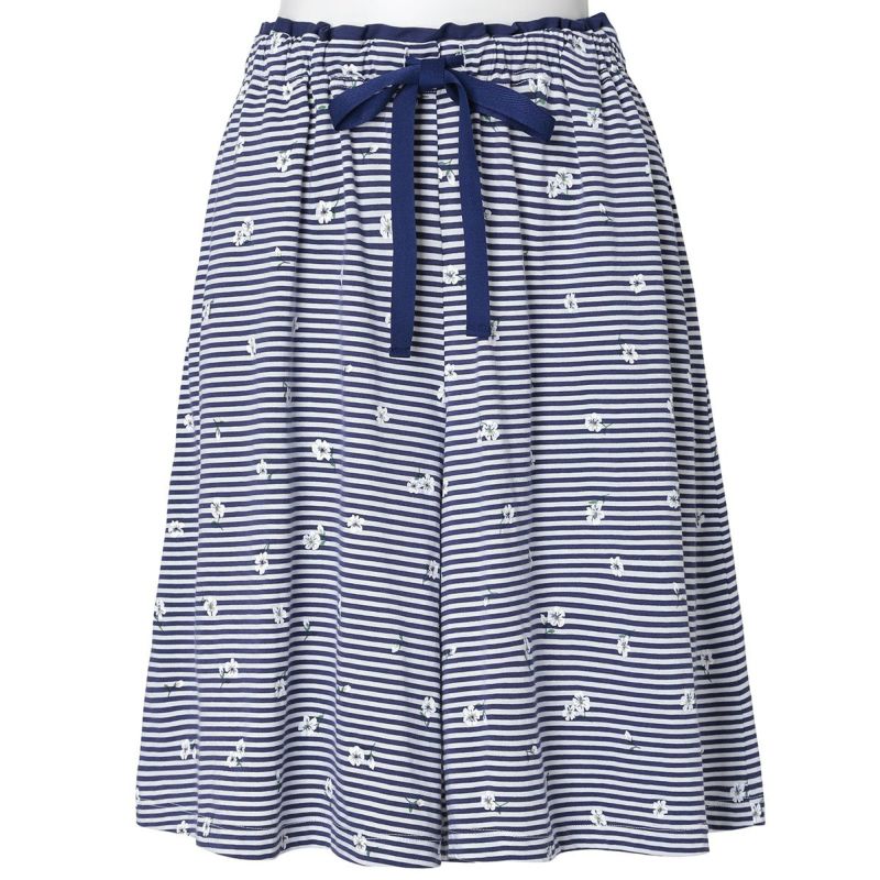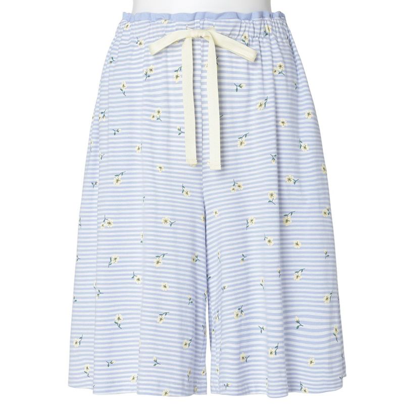 ボーダー柄の天竺素材に散りばめられた小花が映える、カジュアルすぎず、甘すぎないそんな絶妙なバランスが魅力です。清涼感のあるサックスとブルーの2色展開。