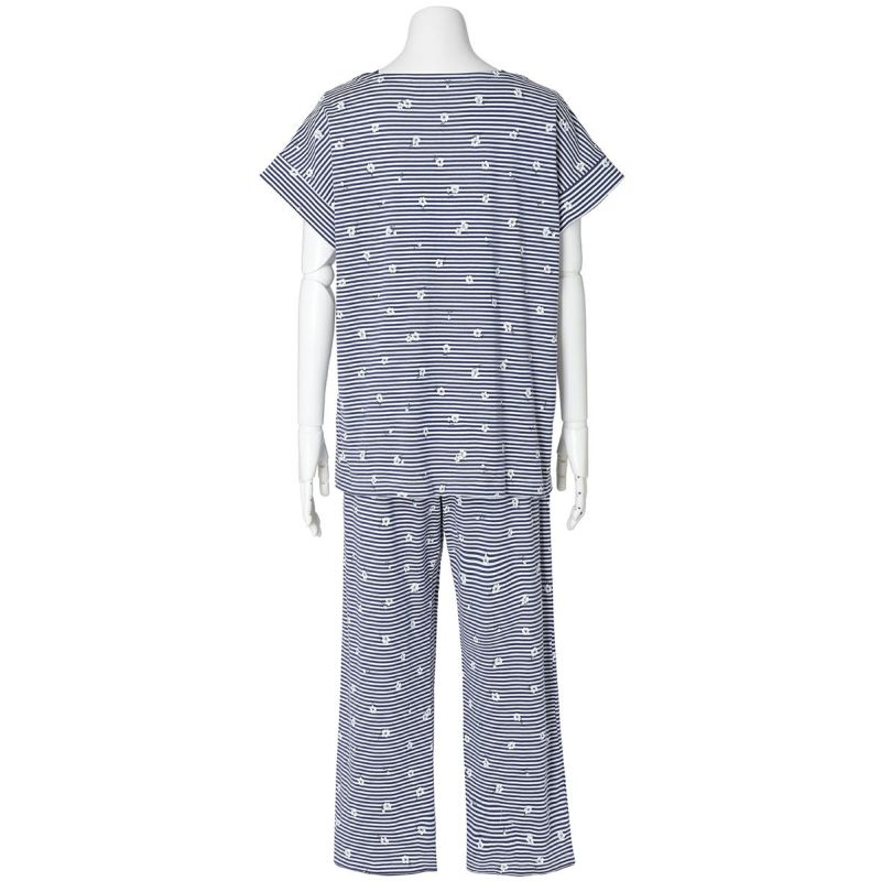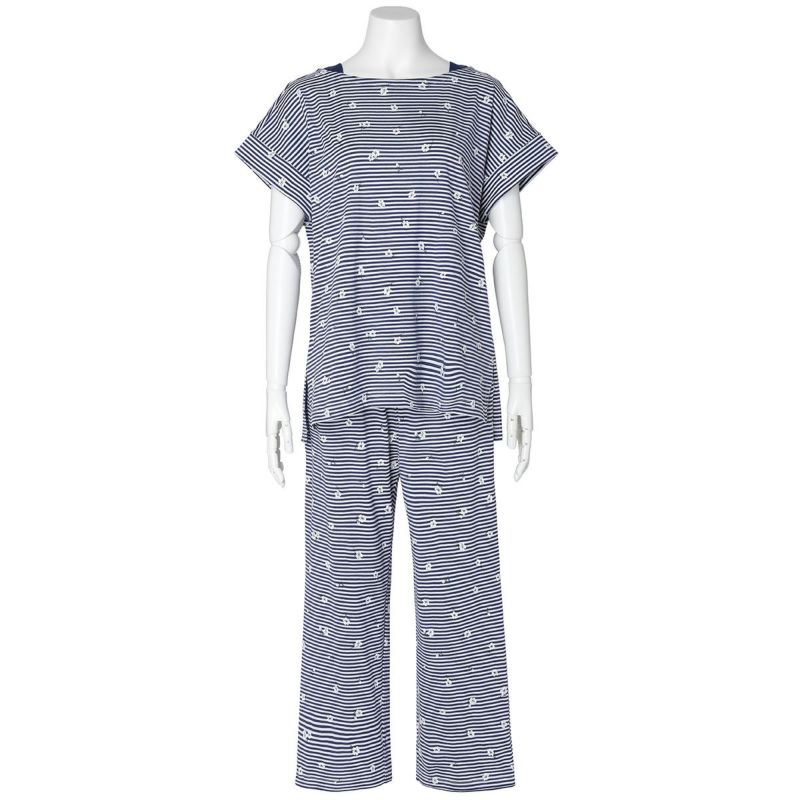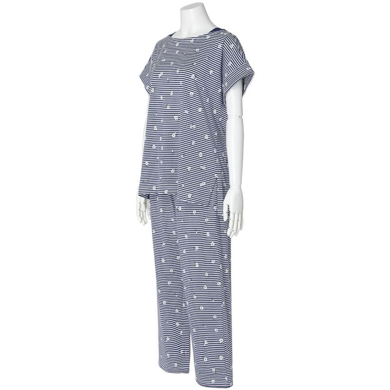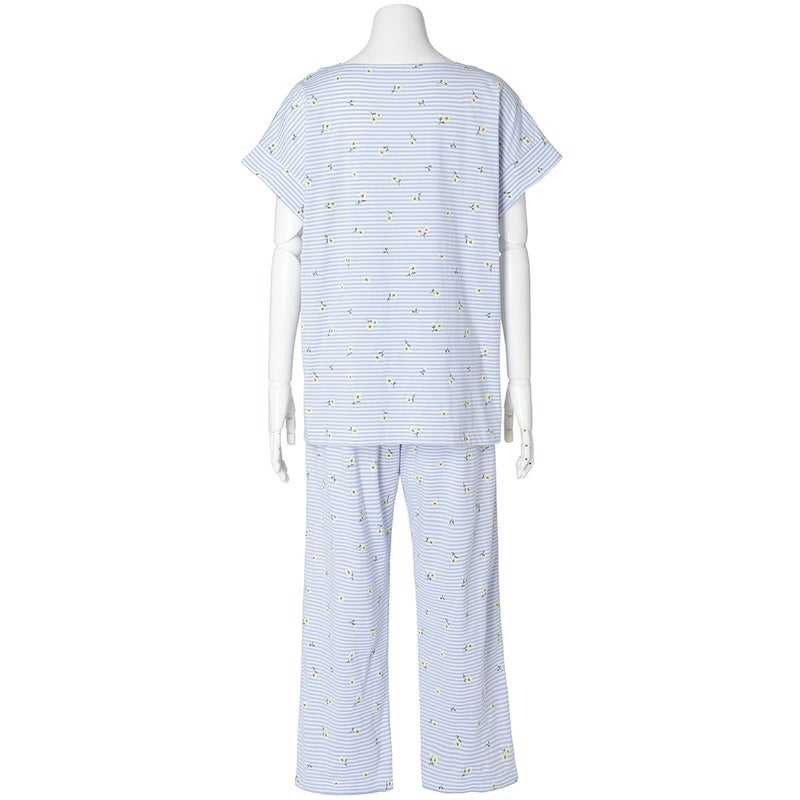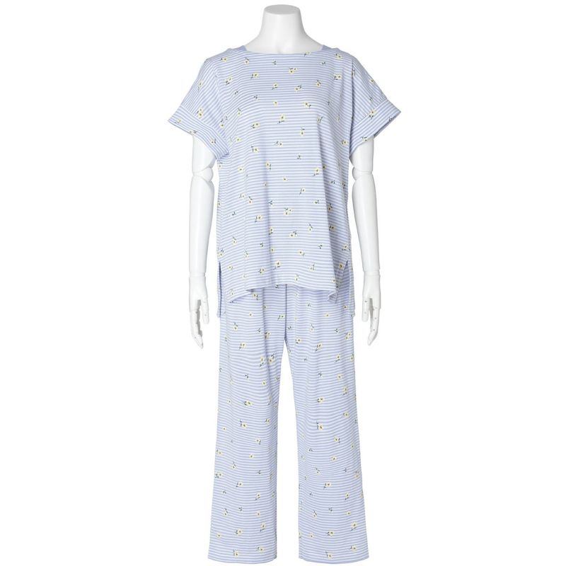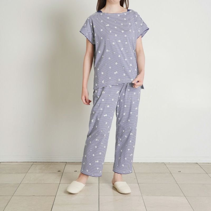 柄が楽しめる半袖パジャマ。ボートネックで首元がすっきりと見え、肩まわりにほどよい抜け感を演出。肩は開きすぎないよう端に別布をほどこしきちんと感も◎身頃に分量感を持たせたゆったりシルエットは、体のラインを拾わず、カジュアルながらも女性らしい印象に仕上げています。くるぶし丈のボトムスは、肌の露出を抑えつつも軽やかに。冷えが気になる方にもおすすめの丈感です。便利なサイドポケット付き。