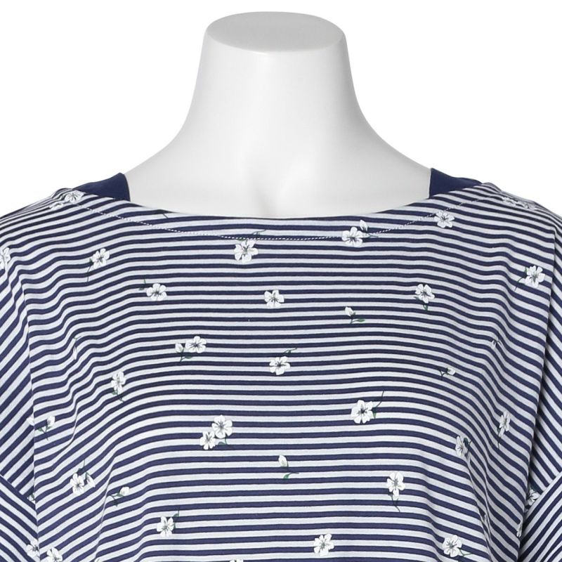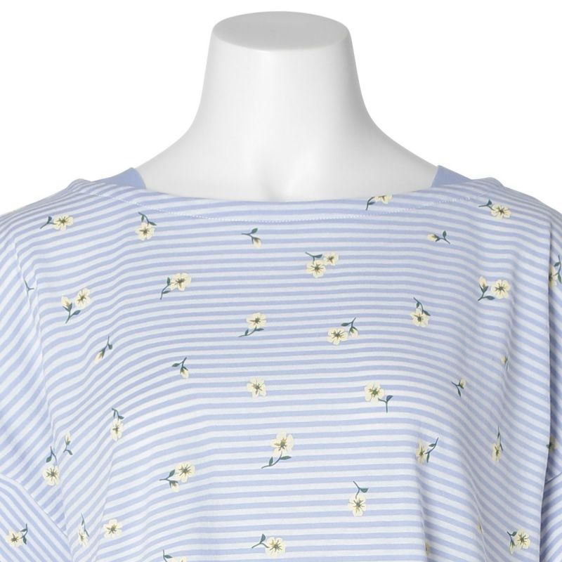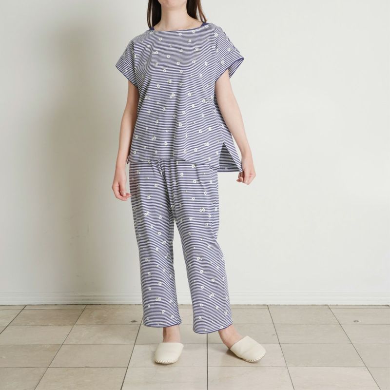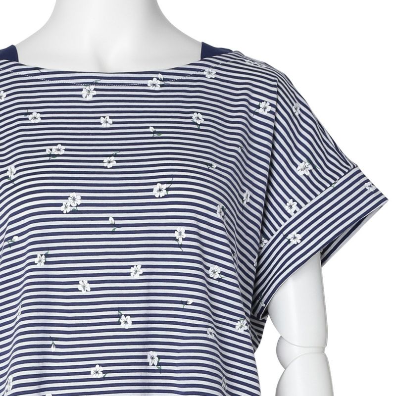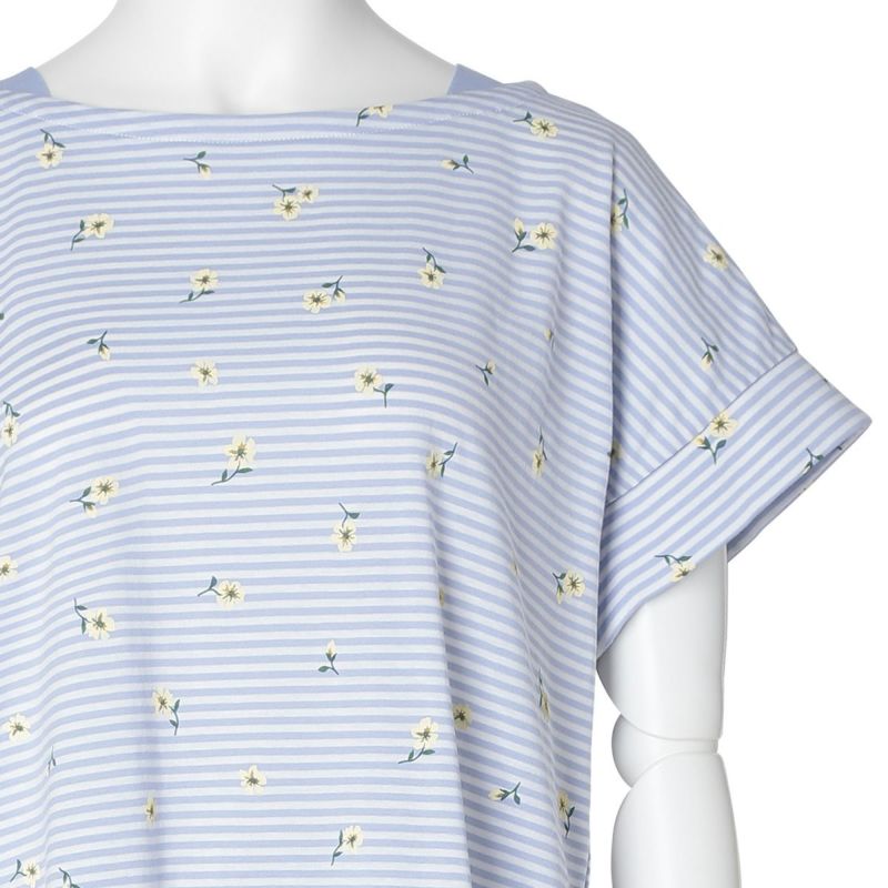 ボーダー柄の天竺素材に散りばめられた小花が映える、カジュアルすぎず、甘すぎないそんな絶妙なバランスが魅力です。清涼感のあるサックスとブルーの2色展開。