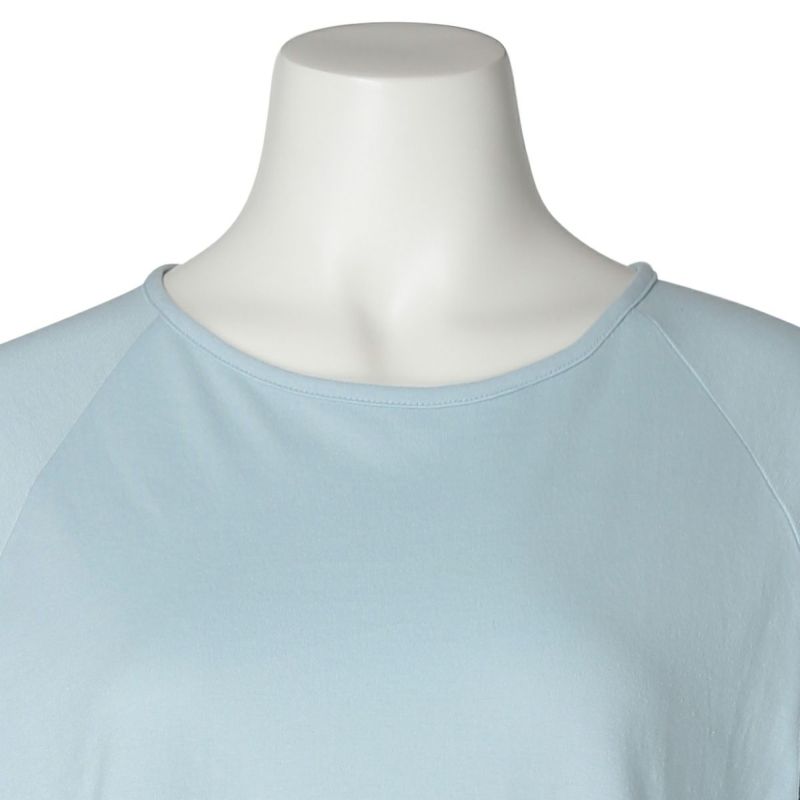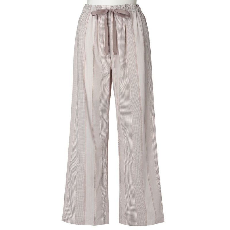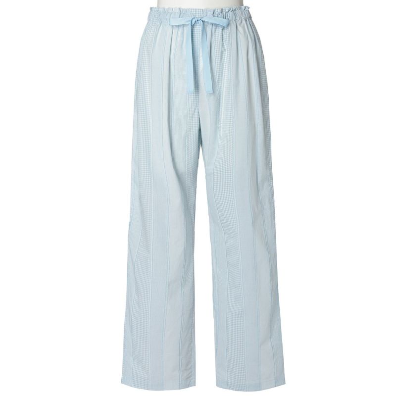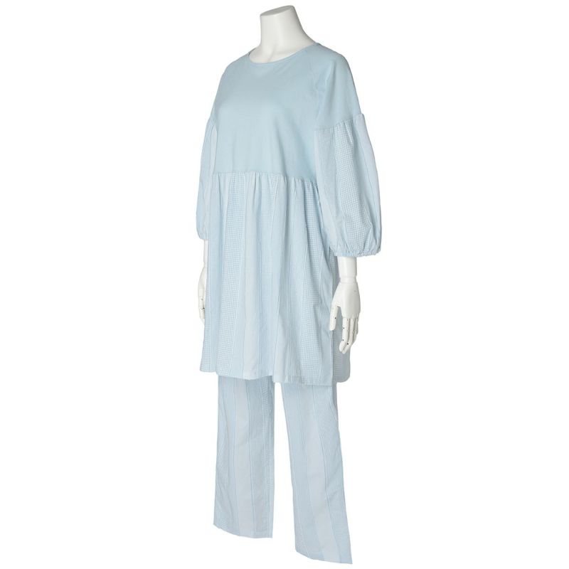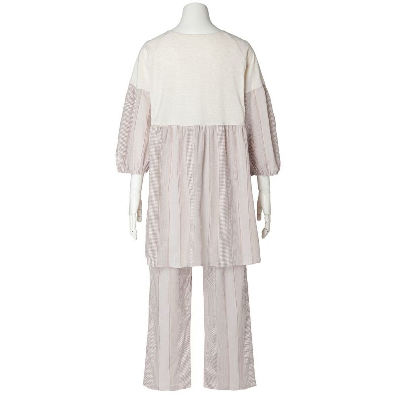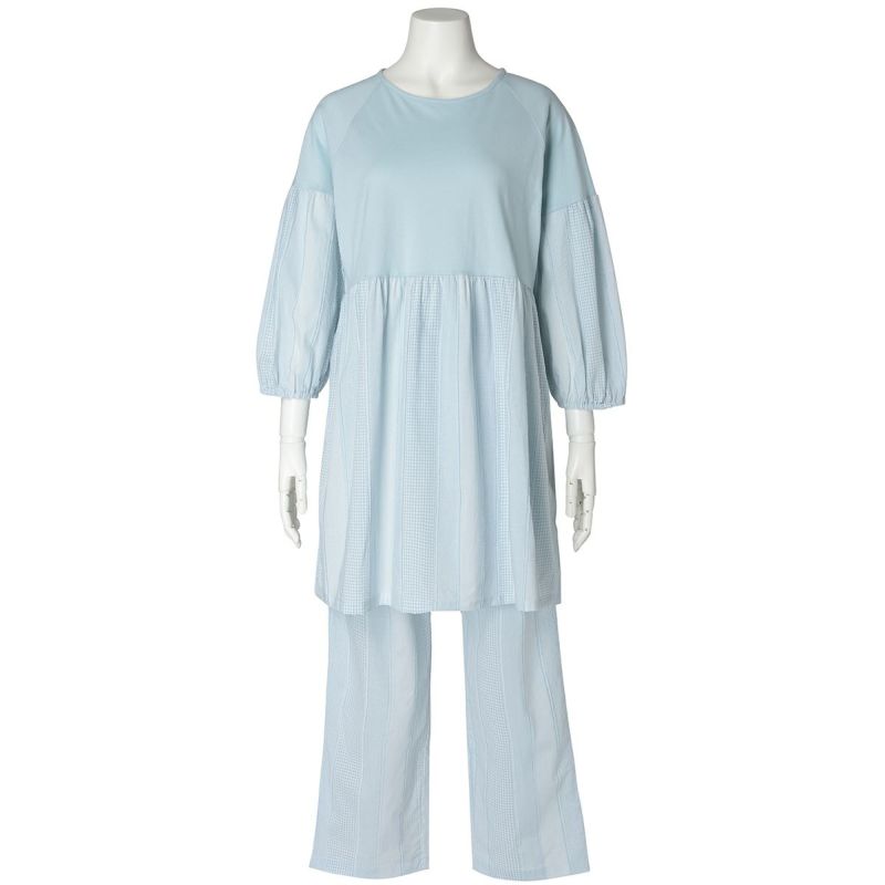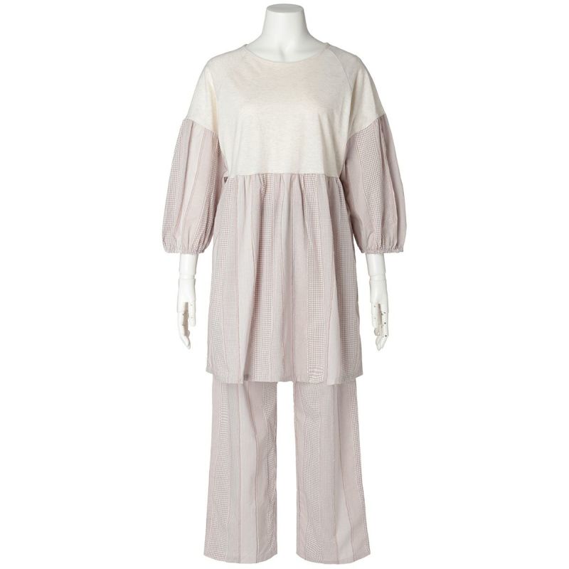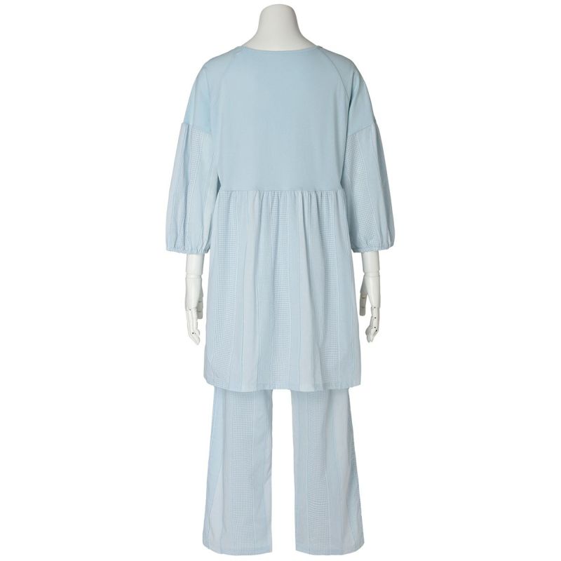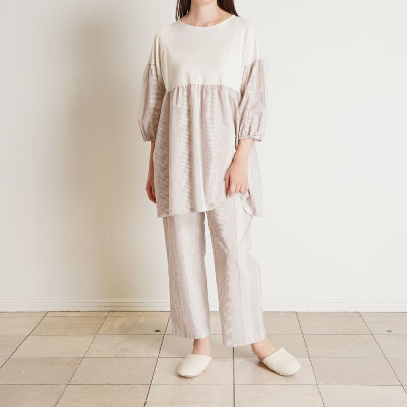 8分袖パジャマは、ふんわりとしたパフスリーブが可愛らしいデザイン。かぶりのトップスには柔らかく着心地の良い天竺素材を使用しているので、着脱もしやすい。パンツはストレートシルエット。