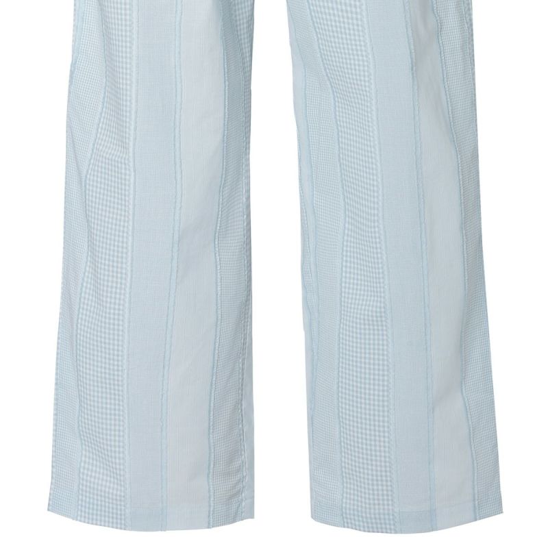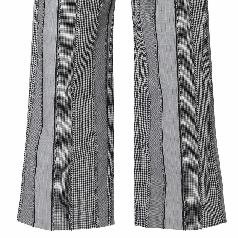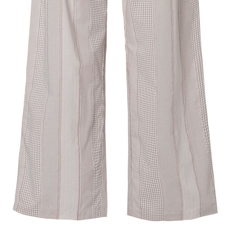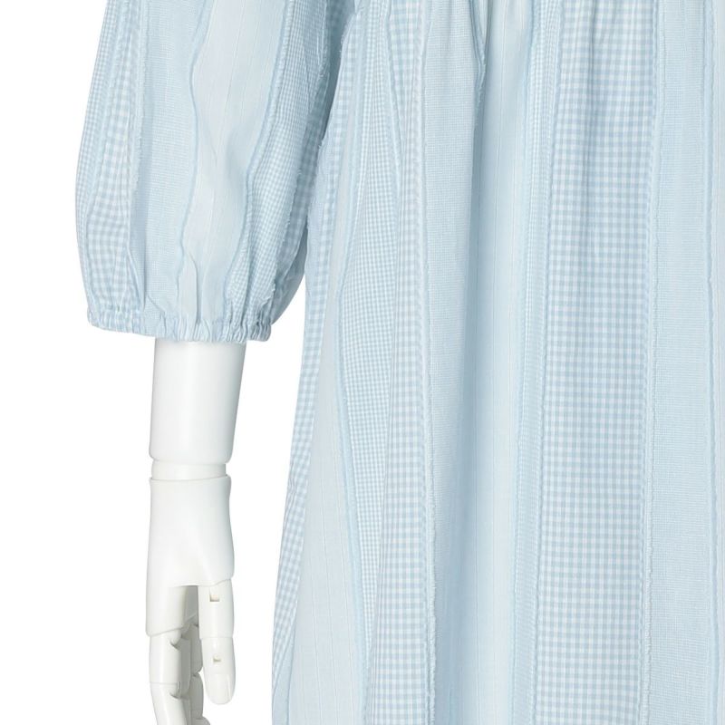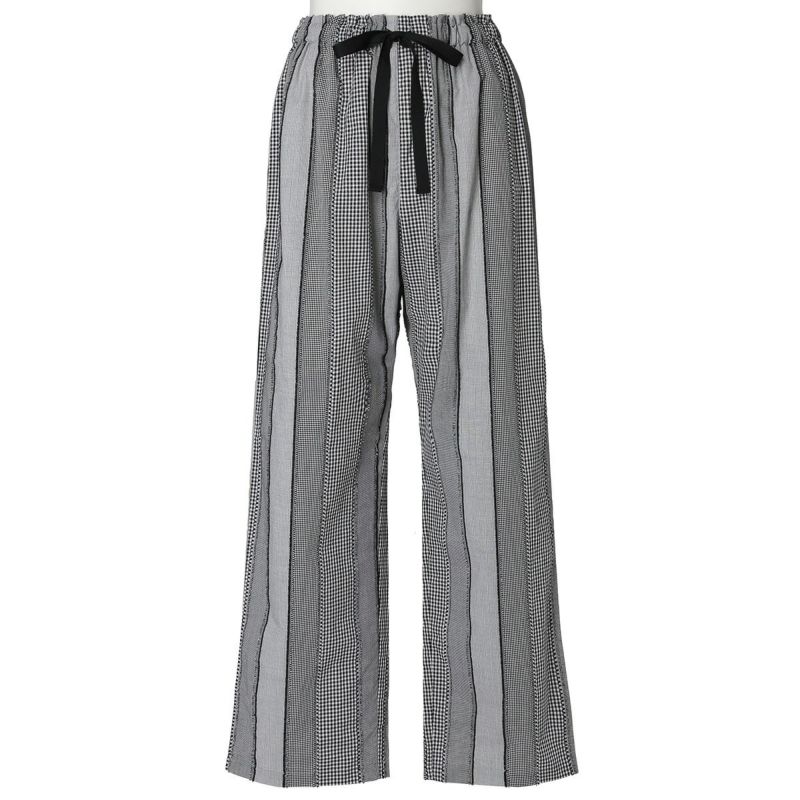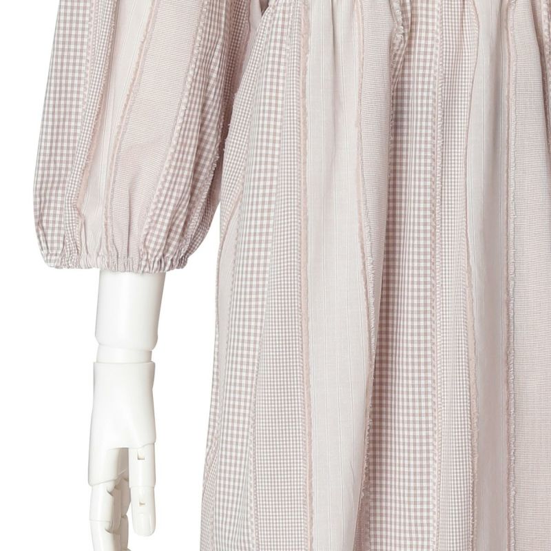 様々なギンガム柄を組み合わせストライプ状に織り上げた薄手の新素材。柄の切り替え部分のフリンジがアクセントに。