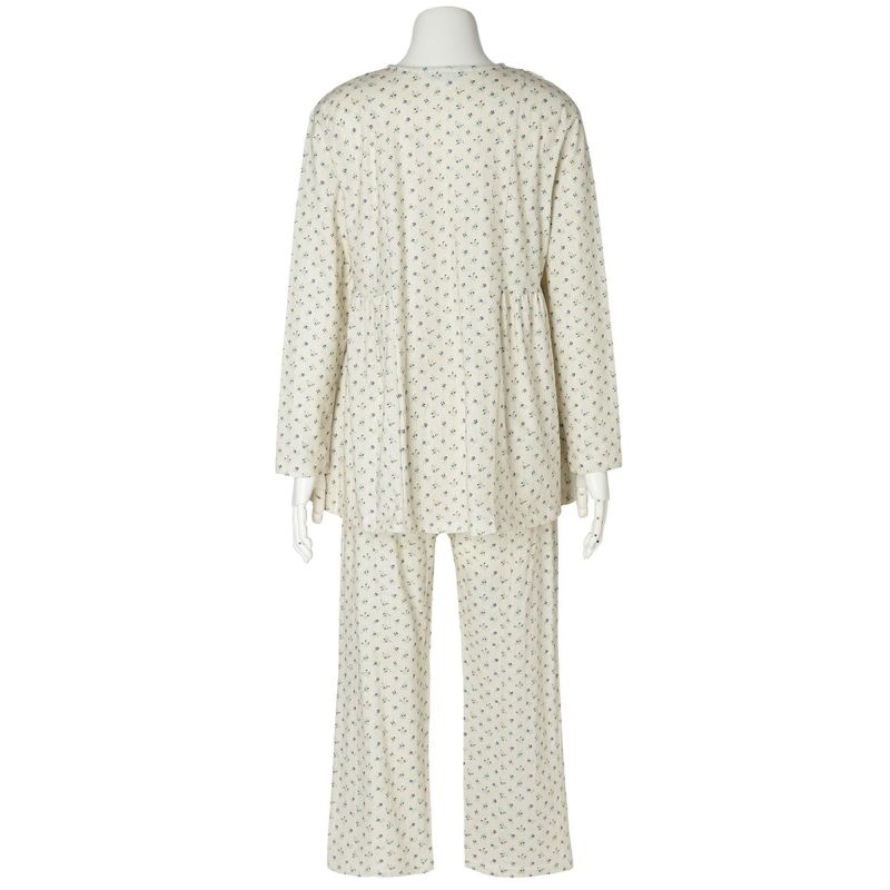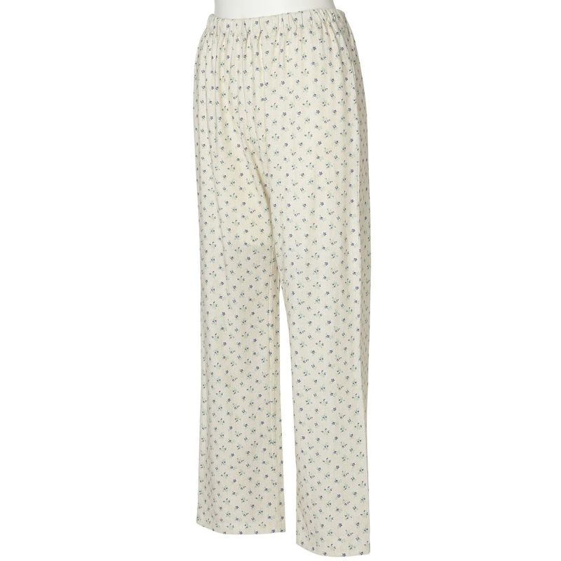 長袖パジャマは、肩のラインから施された別布のフリルが大人のかわいらしさを演出。ギャザーを寄せたデザインでAラインシルエットに仕上げました。ボトムはスタンダードなストレートタイプ。