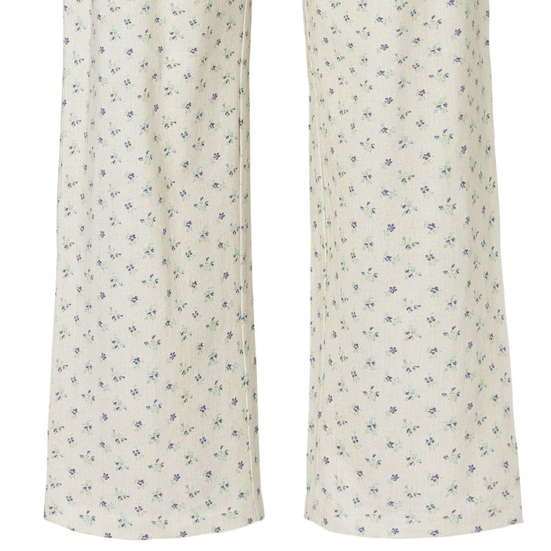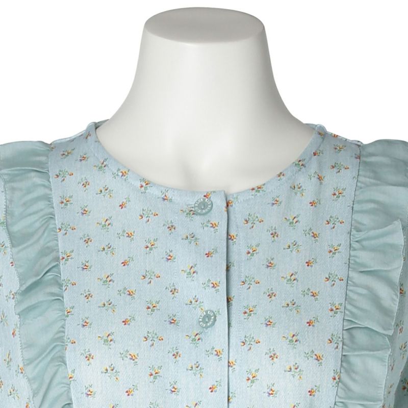 下着と同様にデニム柄+小花柄をプリントした肌触りの良い綿天竺を使用。別布のフリルがポイントのフェミニンなデザイン。