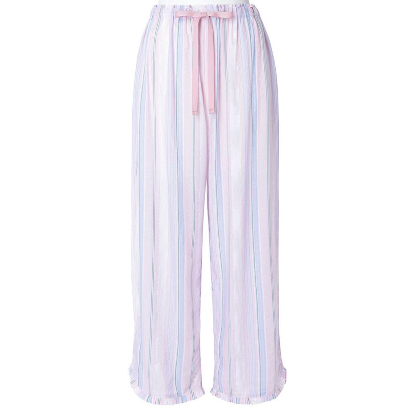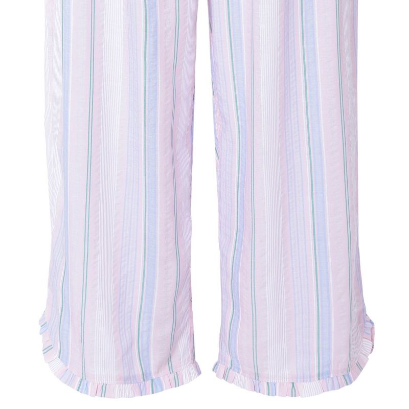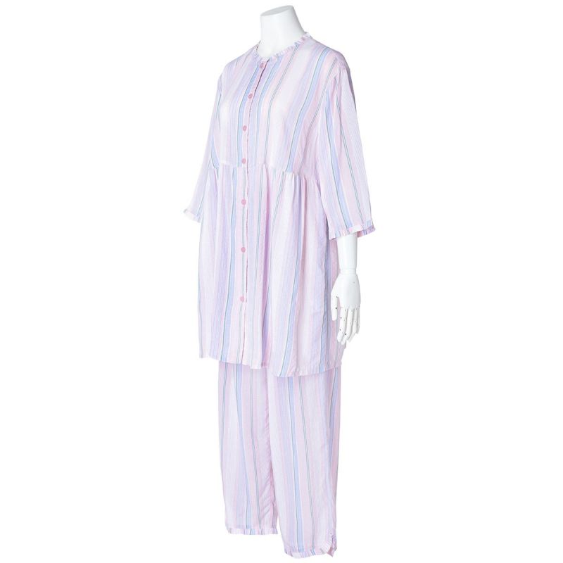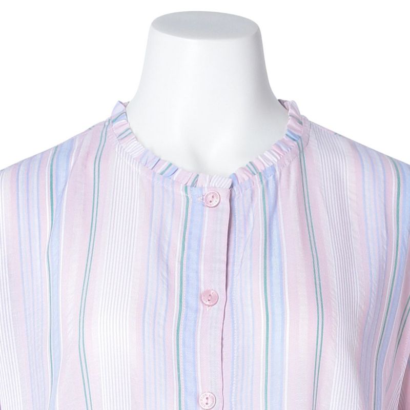 春から冷房対策としても着られる7分袖トップス×くるぶし丈ボトムスのパジャマ。トップスはノーカラーの前開きデザイン。ギャザーを入れた切り替えラインが女性らしさを演出します。トップス、ボトムの裾にはフリルをあしらいフェミニンさをプラスしました。
