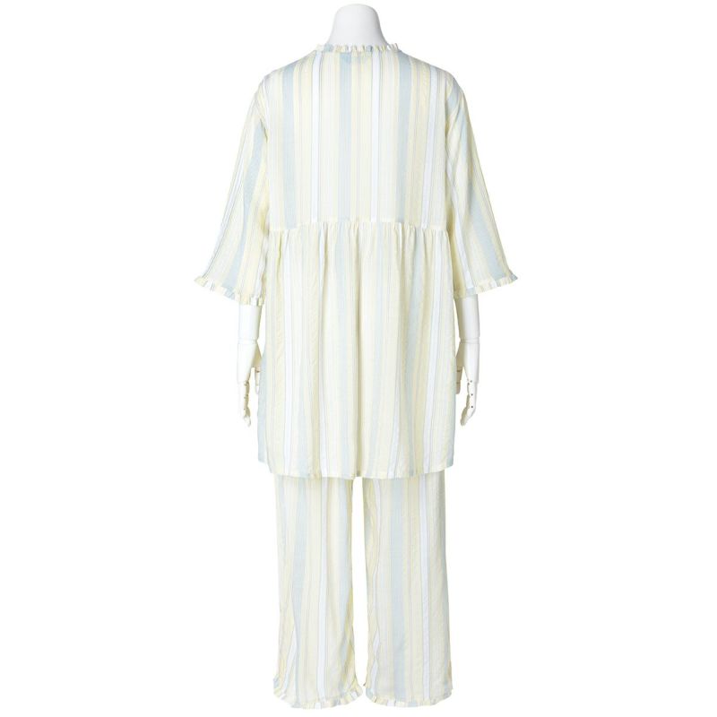 【M】トップス:着丈78cm 身幅(1/2)54.6cm 肩幅45.1cm 袖丈36.4cm(フリル部分含む) ボトム:着丈91cm ウエスト(1/2)31.5cm ヒップ(1/2)57cm 股下62.5cm(フリル部分含む)