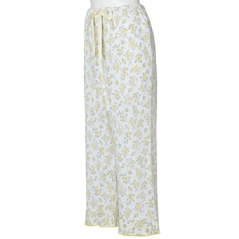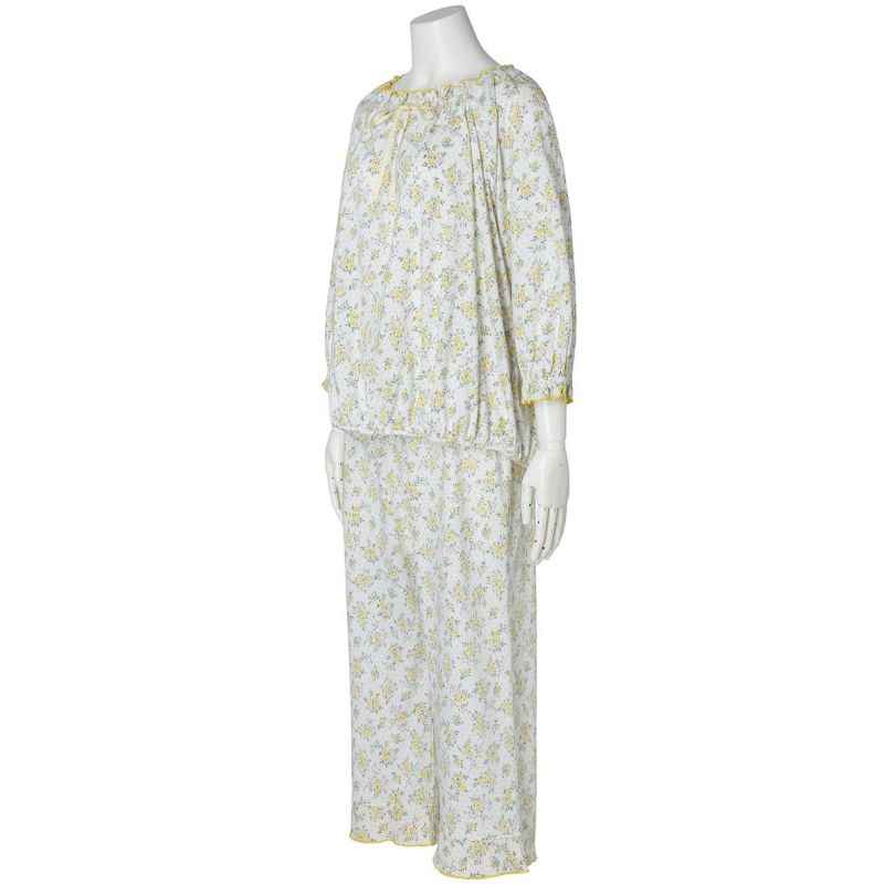ギャザーや裾のメロー使いがフェミニンなかぶりタイプの8分袖のナイトウェア。トップスの襟ぐりはインゴムにリボンを通しており、好みの空き具合に調整できる。裾はギャザーを入れコクーンシルエットにし、さらに愛らしく。前後差もありこなれ感が楽しめます。袖もパフスリーブのインゴムでまくったり家事もしやすい。パンツの裾はややフレアに切り替えポイントに。