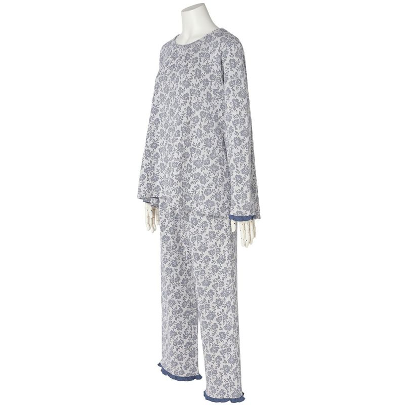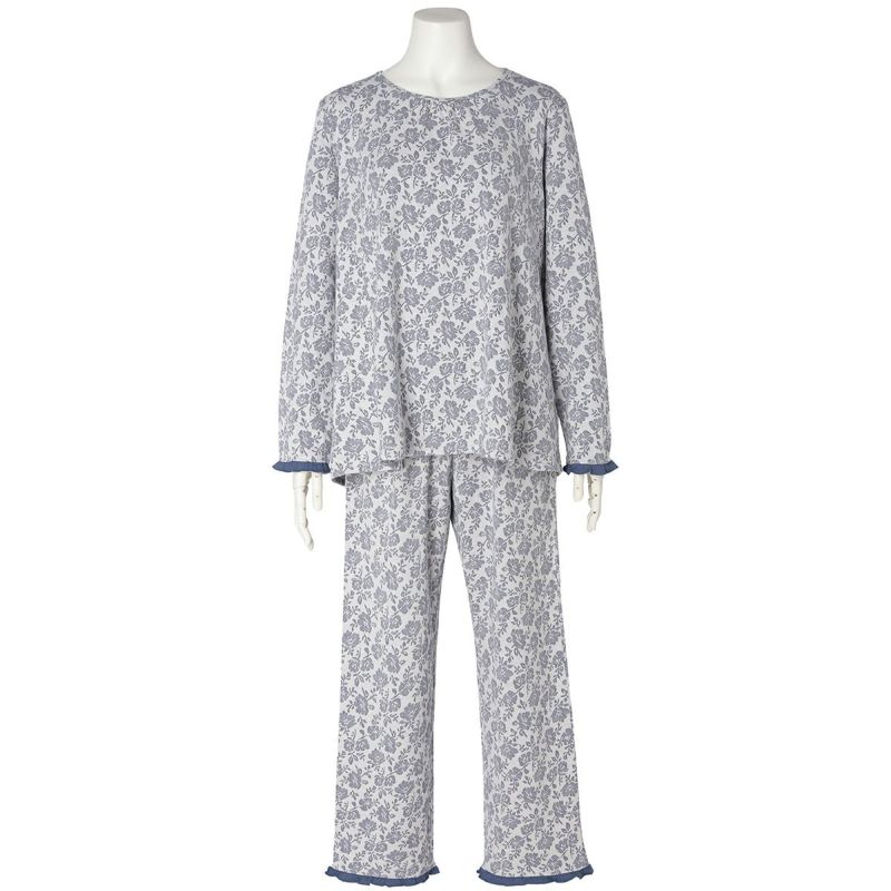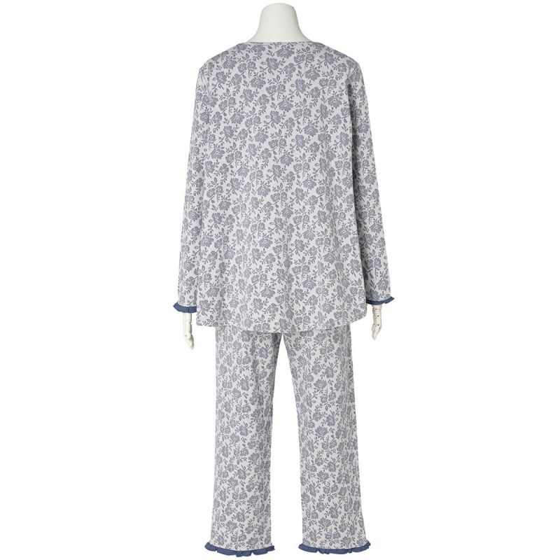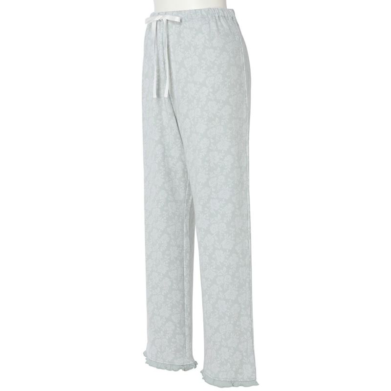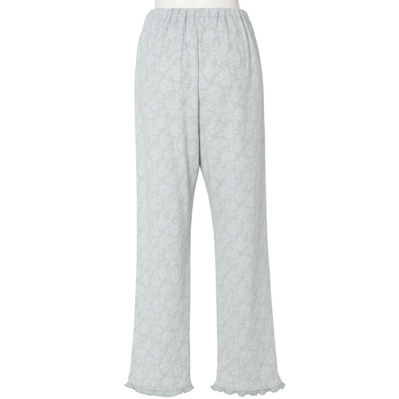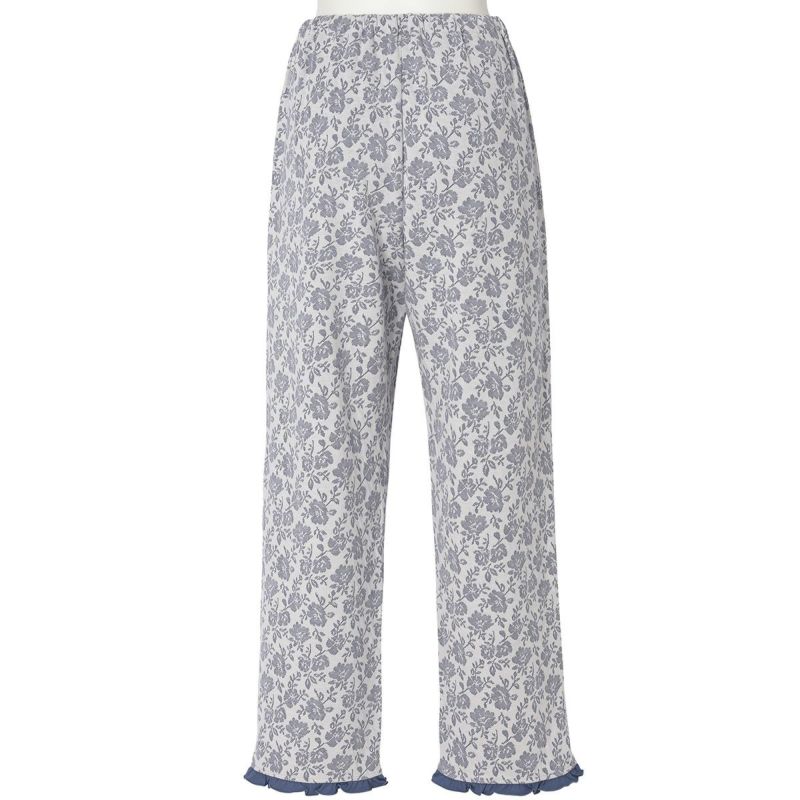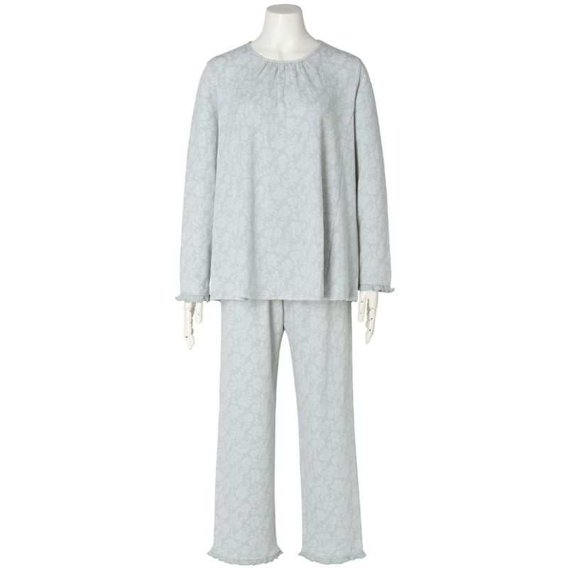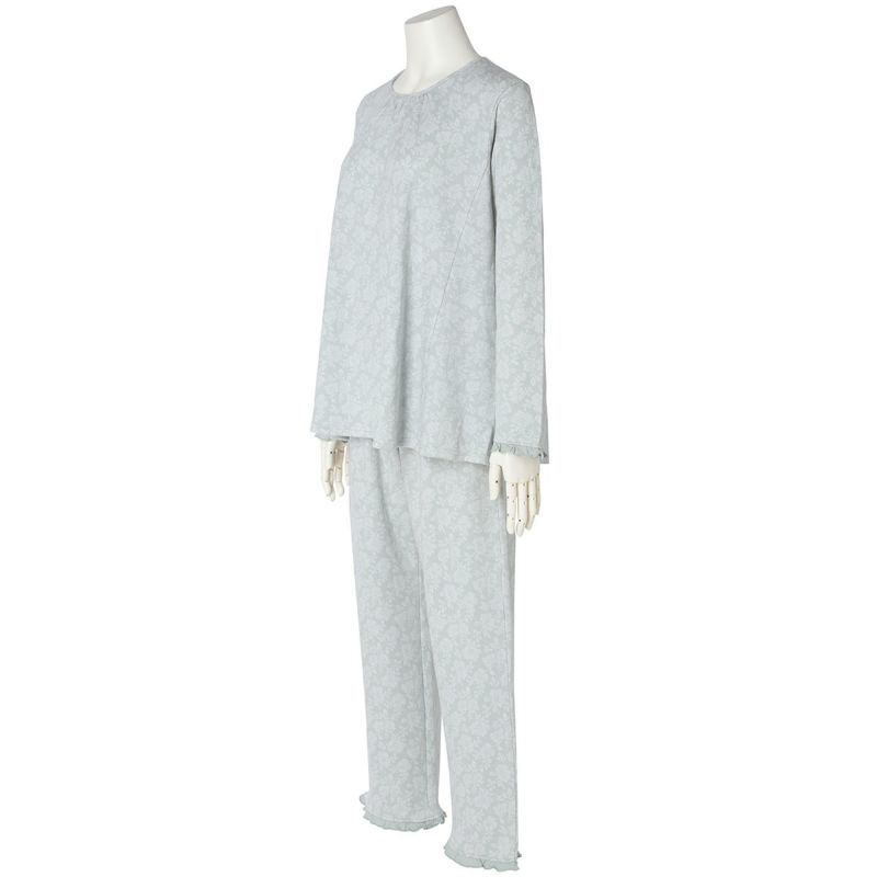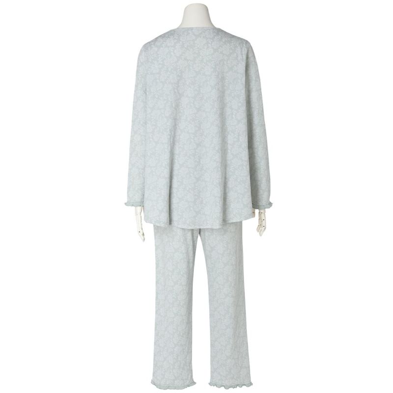 長袖パジャマのトップスは裾に向かって広がる可愛らしいフレアシルエット。前後の裾丈に差をつけ、しゃれ感をプラスしお腹周りもカバー。パンツはストレートタイプ。