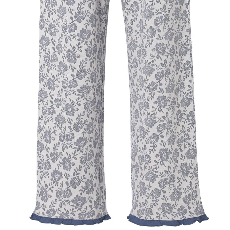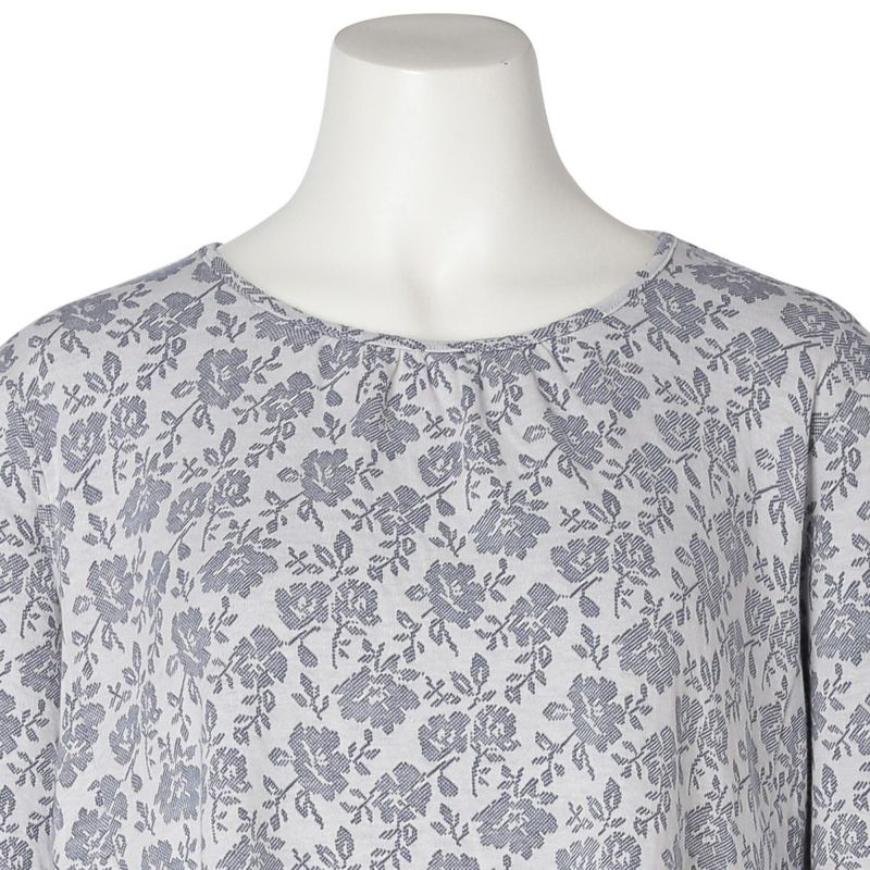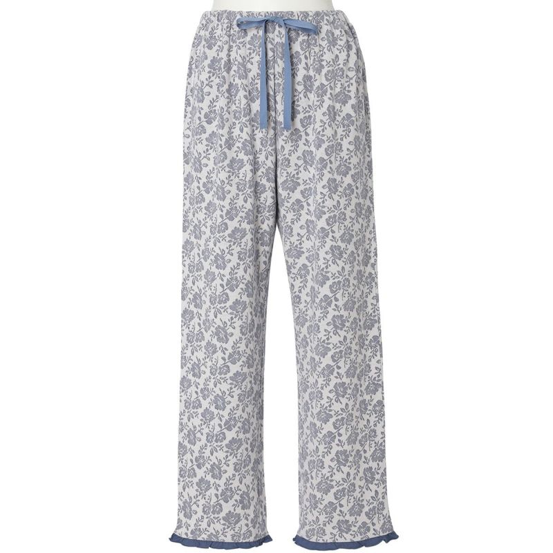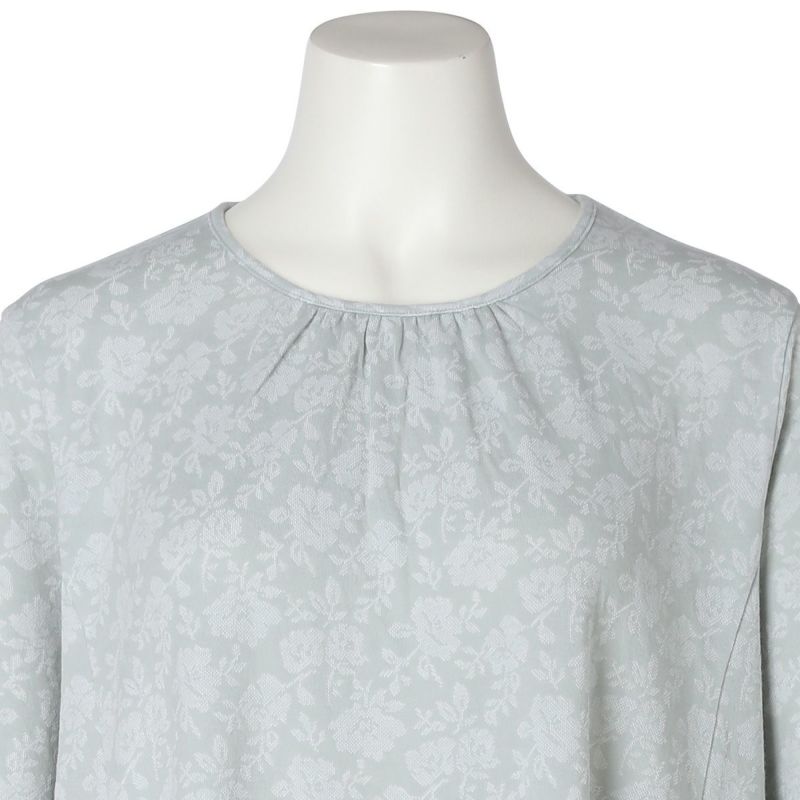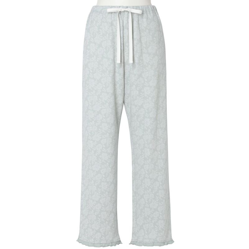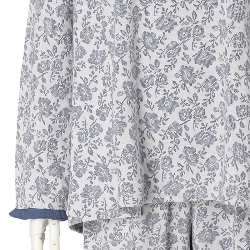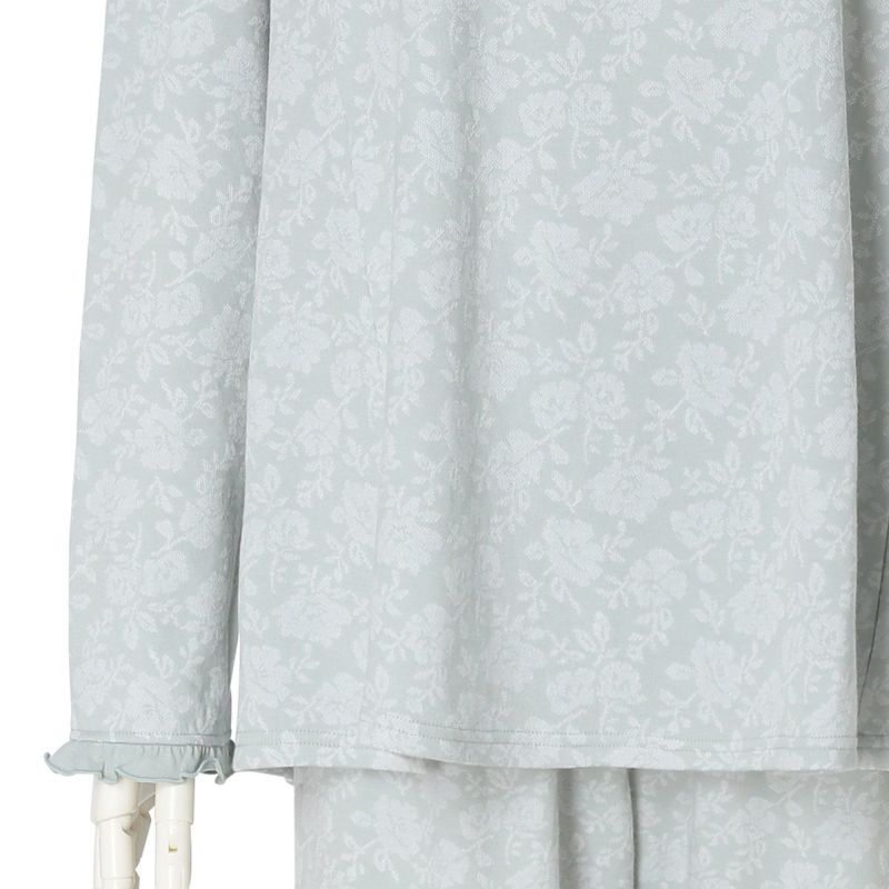 花柄のジャカード素材が目を引くナイトウエアシリーズ。綿100%の2枚の天竺素材をジャガード織で繋ぎ合わせ、ふっくらとした厚みとやわらかさを実現しました。天竺のフリルでかわいらしいアクセントを施し、落ち着きの中に華やかな印象をつくります。