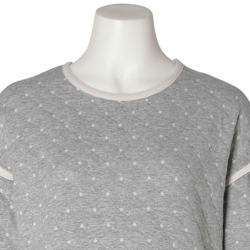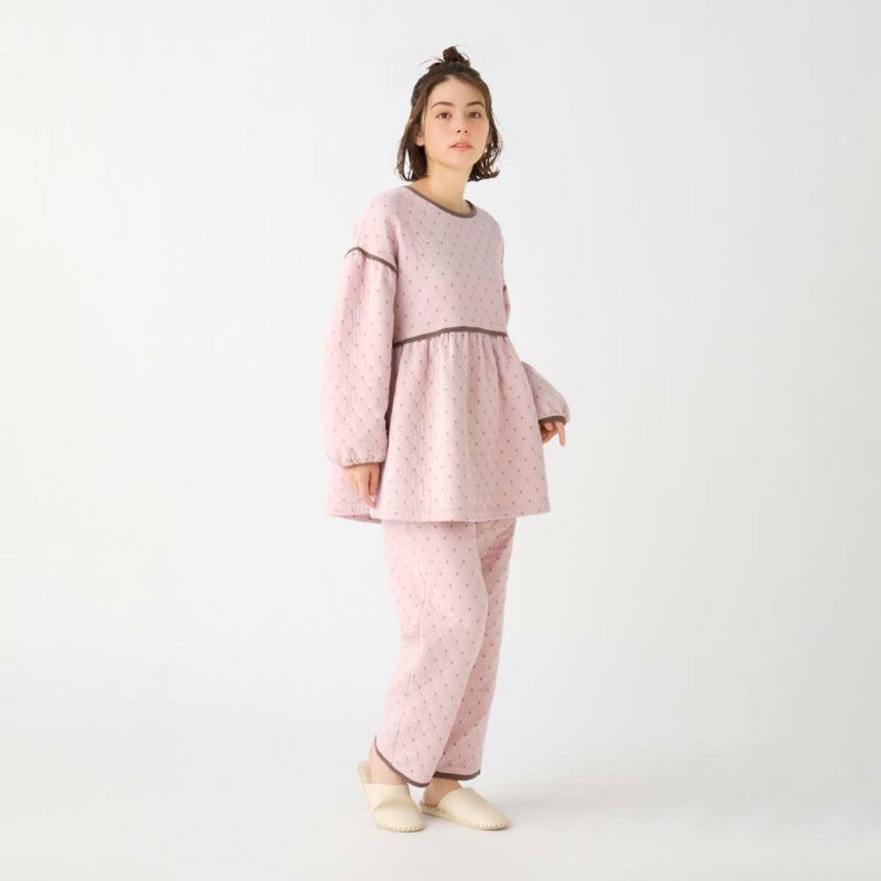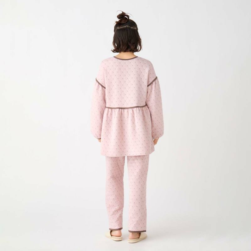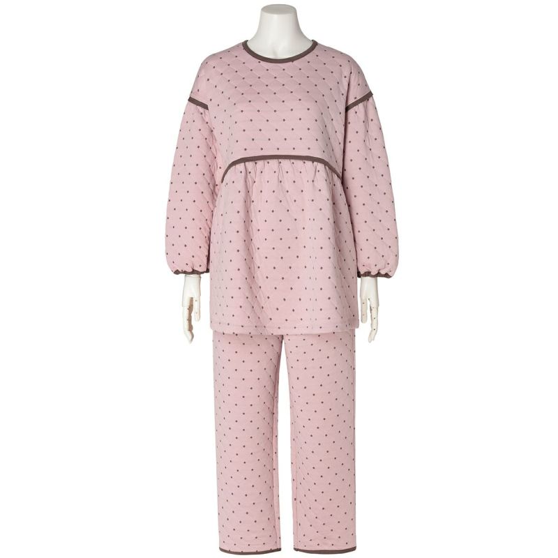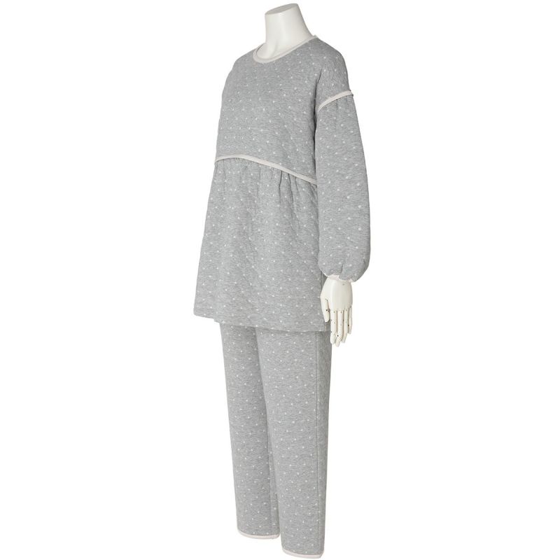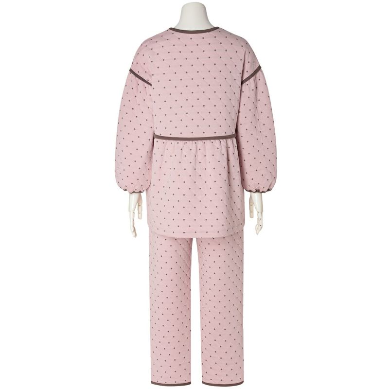 ペプラムシルエットのトップスがかわいらしいパジャマ。ドロップショルダーでリラックスしたシルエット。袖口はまくったり家事のしやすいゴム入りのパフスリーブで、甘さをプラス。ギャザー切り替えでさりげない体型カバー効果も。パンツはストレートシルエット。パイピングを効かせ大人のバランスに仕上げました。