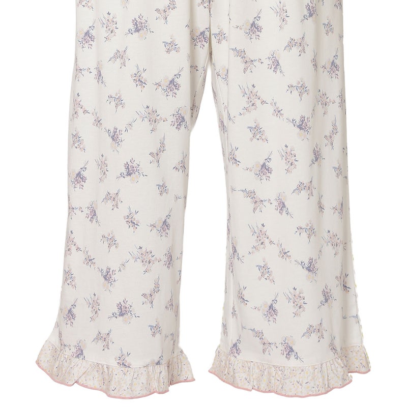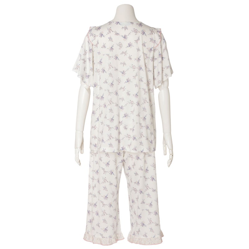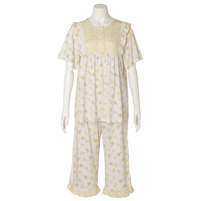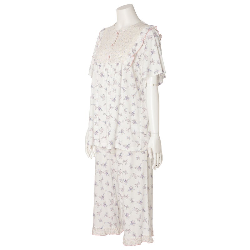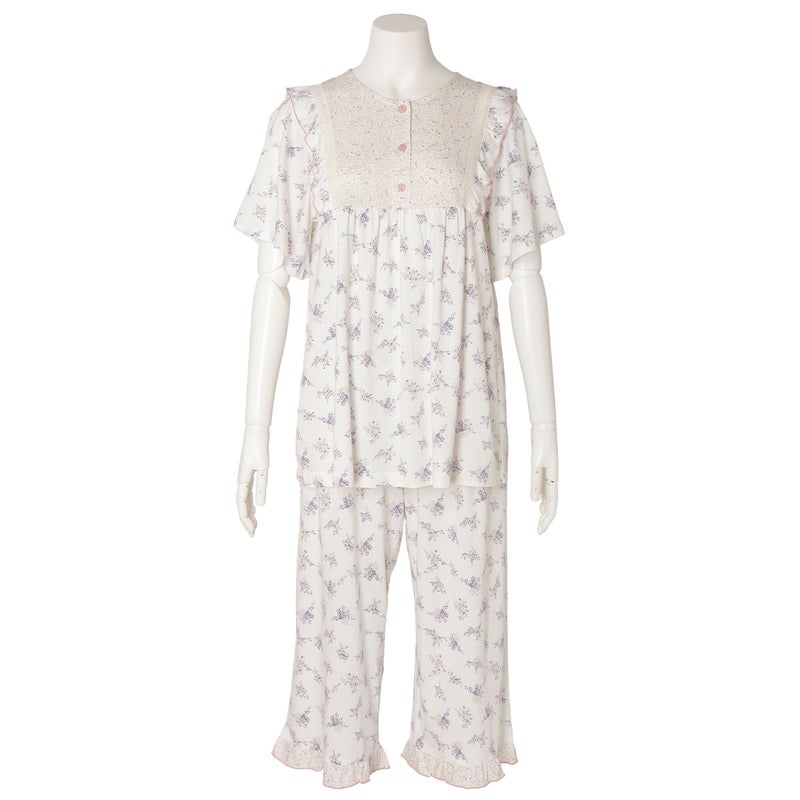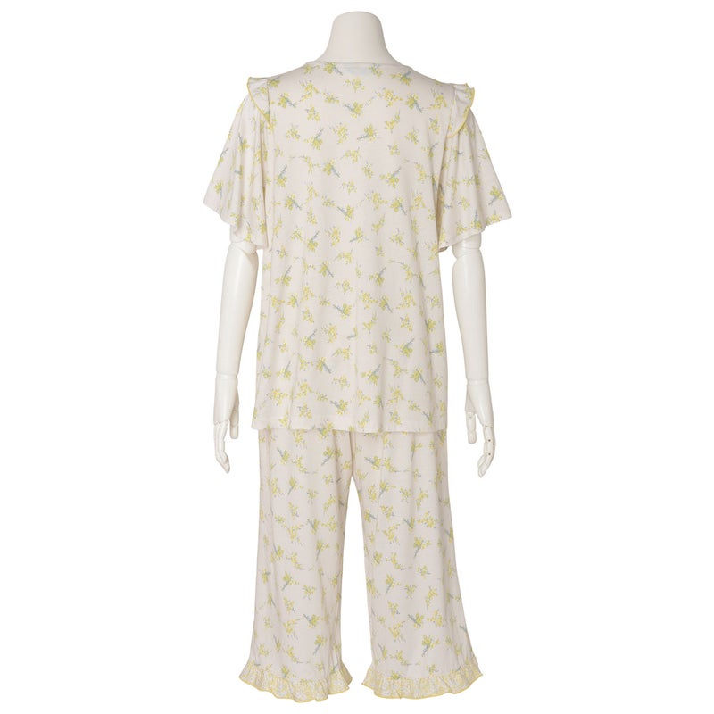 柄の切り替えやレースを組み合わせた手の込んだ仕立てが魅力の半袖パジャマ。レーヨン素材をならではの落ち感を活かした流れるような、ややフレアの袖も魅力。パンツのフリル使いで甘さを添えました。