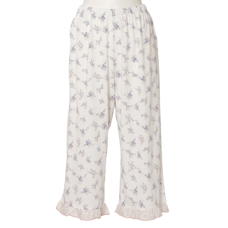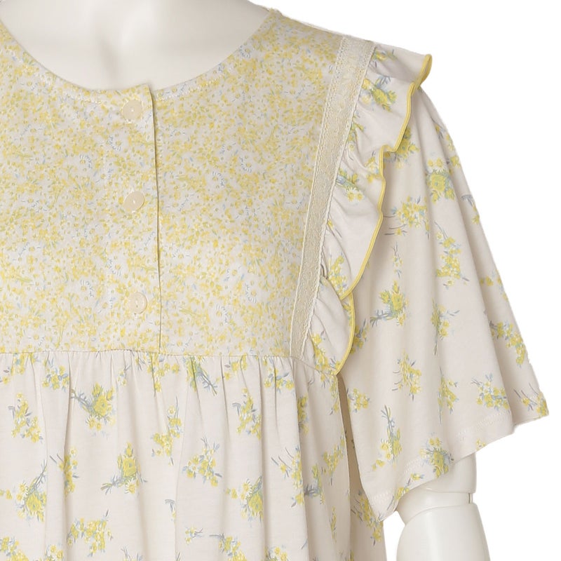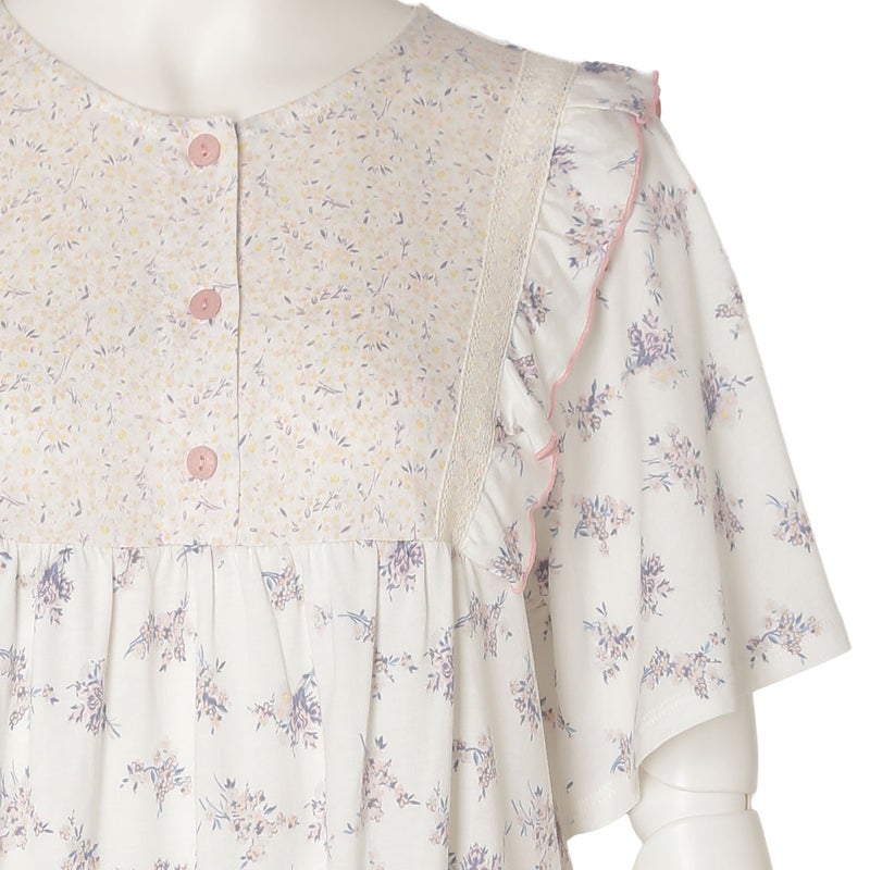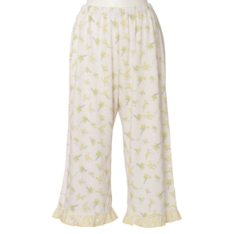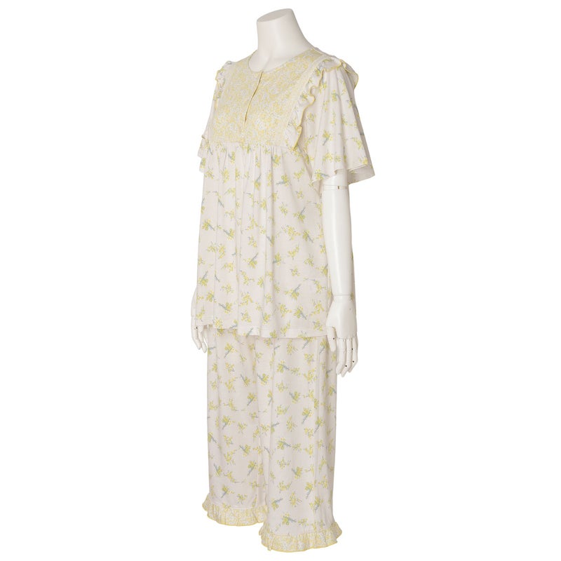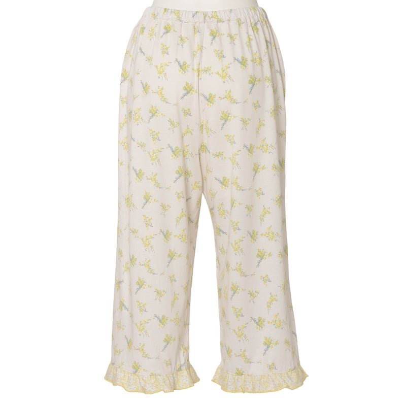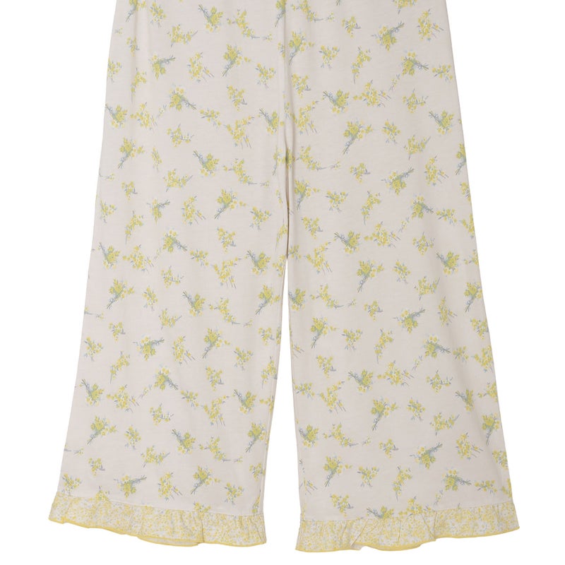 柄の切り替えやレースを組み合わせた手の込んだ仕立てが魅力の半袖パジャマ。レーヨン素材をならではの落ち感を活かした流れるような、ややフレアの袖も魅力。パンツのフリル使いで甘さを添えました。