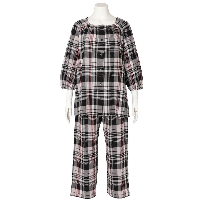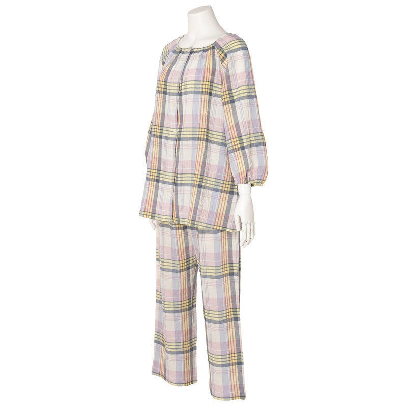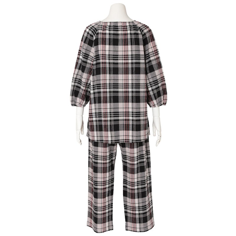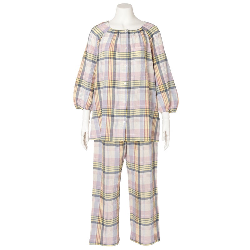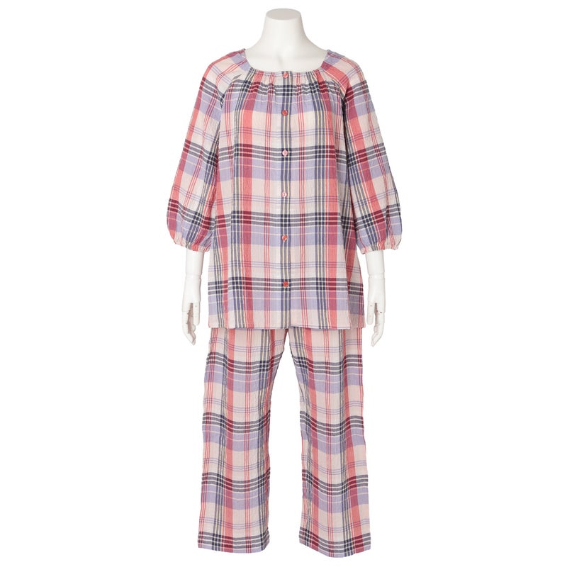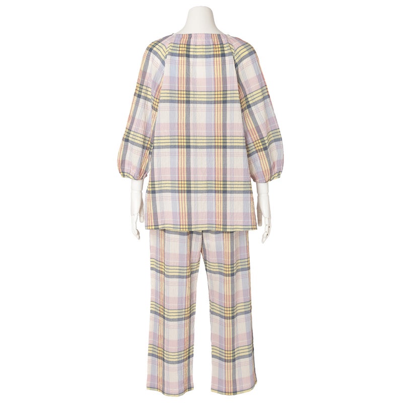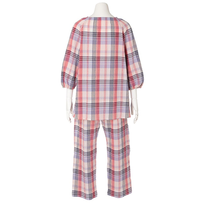 デコルテ周りをすっきり見せるスクエアネックのパジャマ。8分丈トップスの袖はゴムを入れパフスリーブに。家事や洗顔の際もまくりやすく、ふんわりしたシルエットが愛らしさを添えます。パンツはくるぶし丈。ウエストは総ゴム仕様に加え調整可能な紐を通しました。