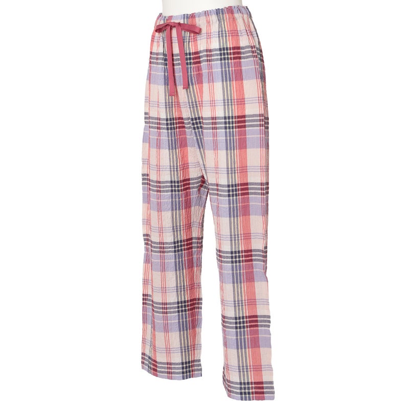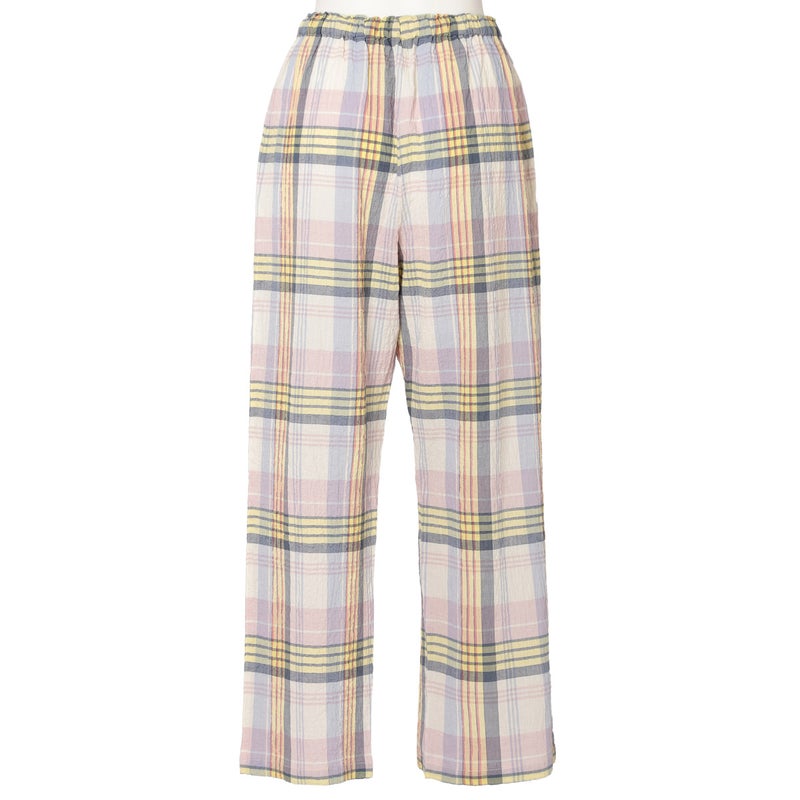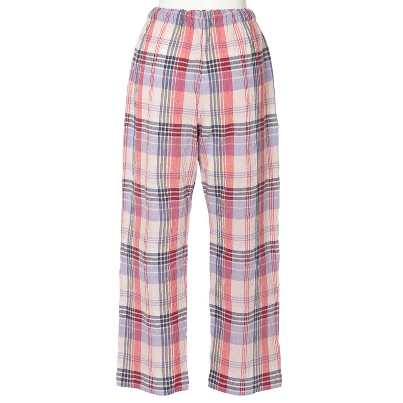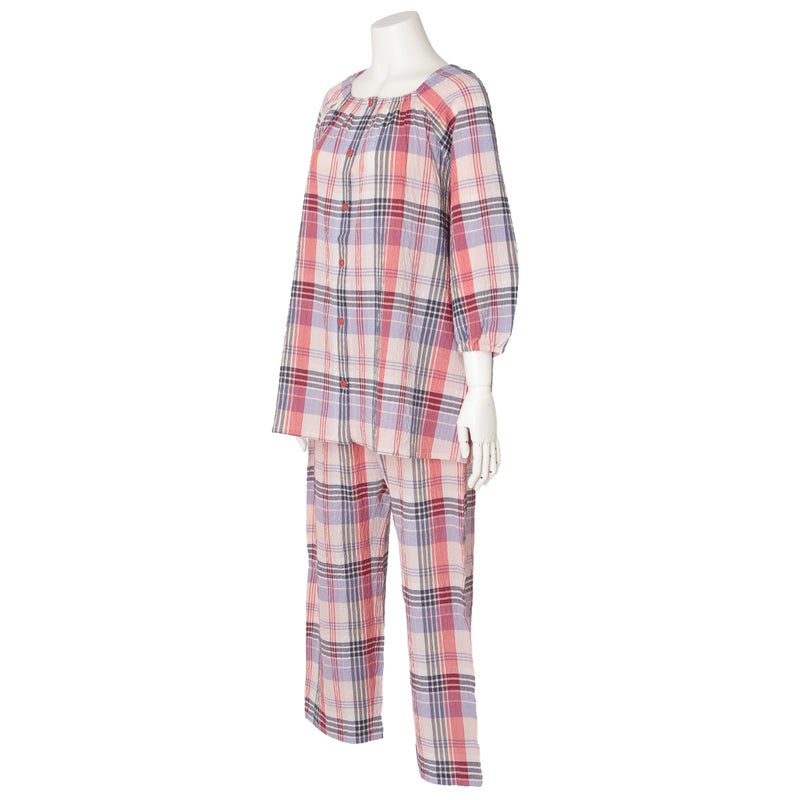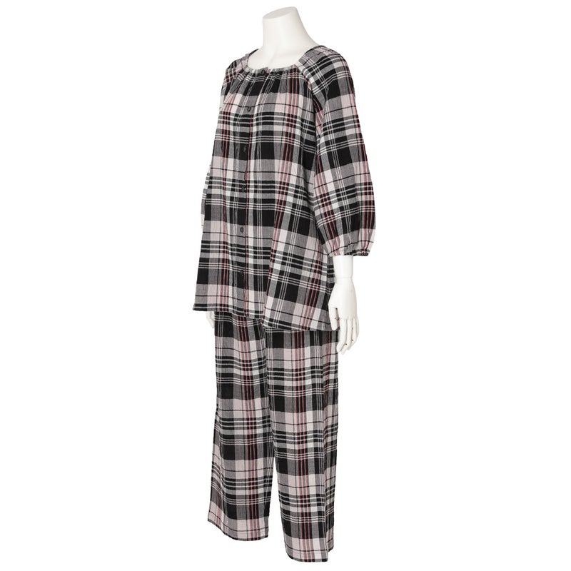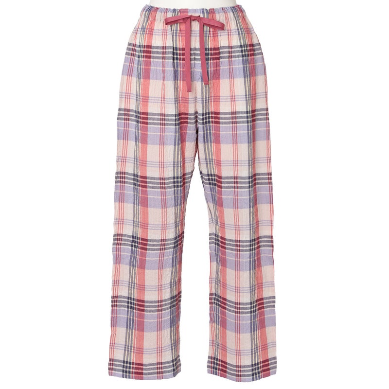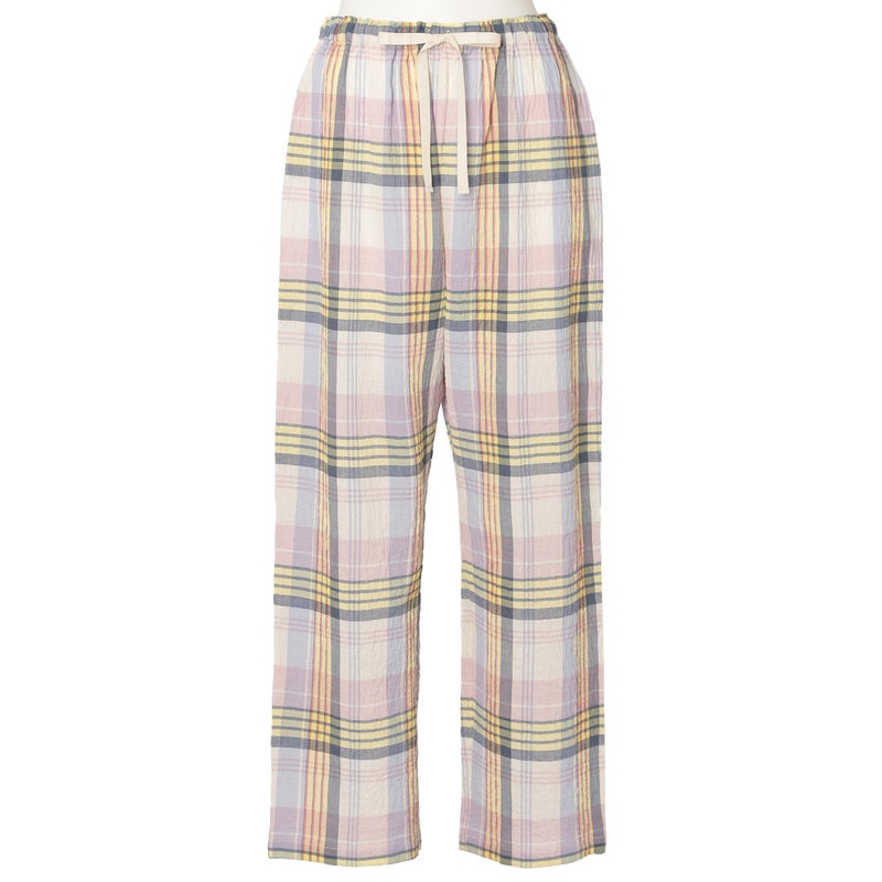 デコルテ周りをすっきり見せるスクエアネックのパジャマ。8分丈トップスの袖はゴムを入れパフスリーブに。家事や洗顔の際もまくりやすく、ふんわりしたシルエットが愛らしさを添えます。パンツはくるぶし丈。ウエストは総ゴム仕様に加え調整可能な紐を通しました。