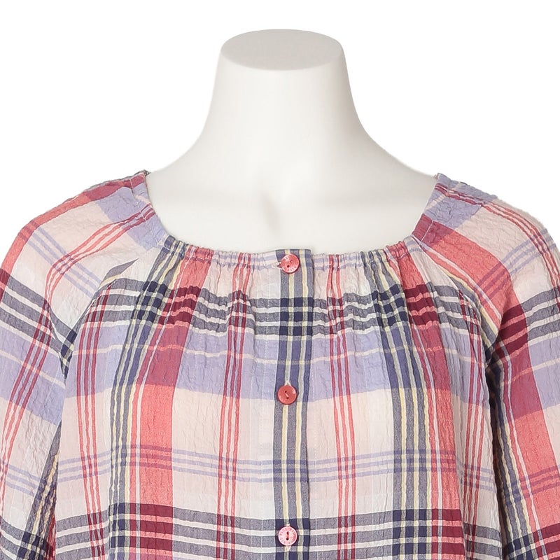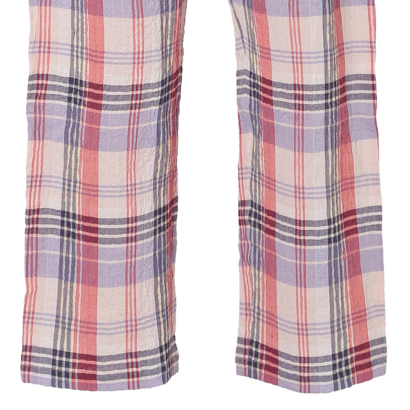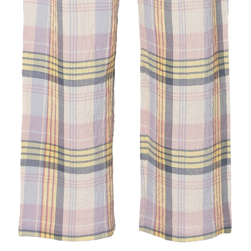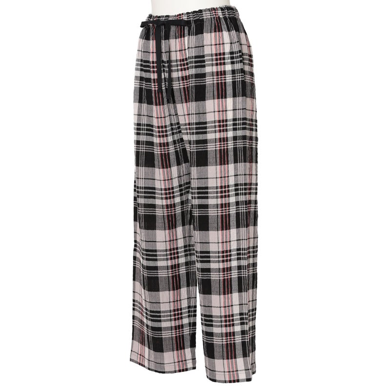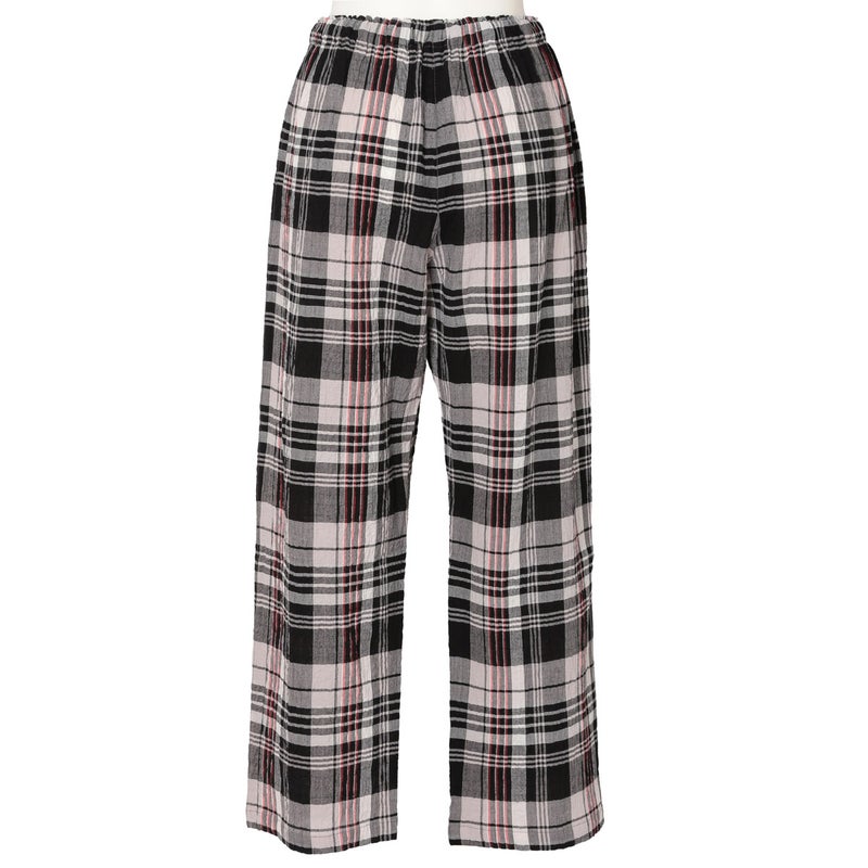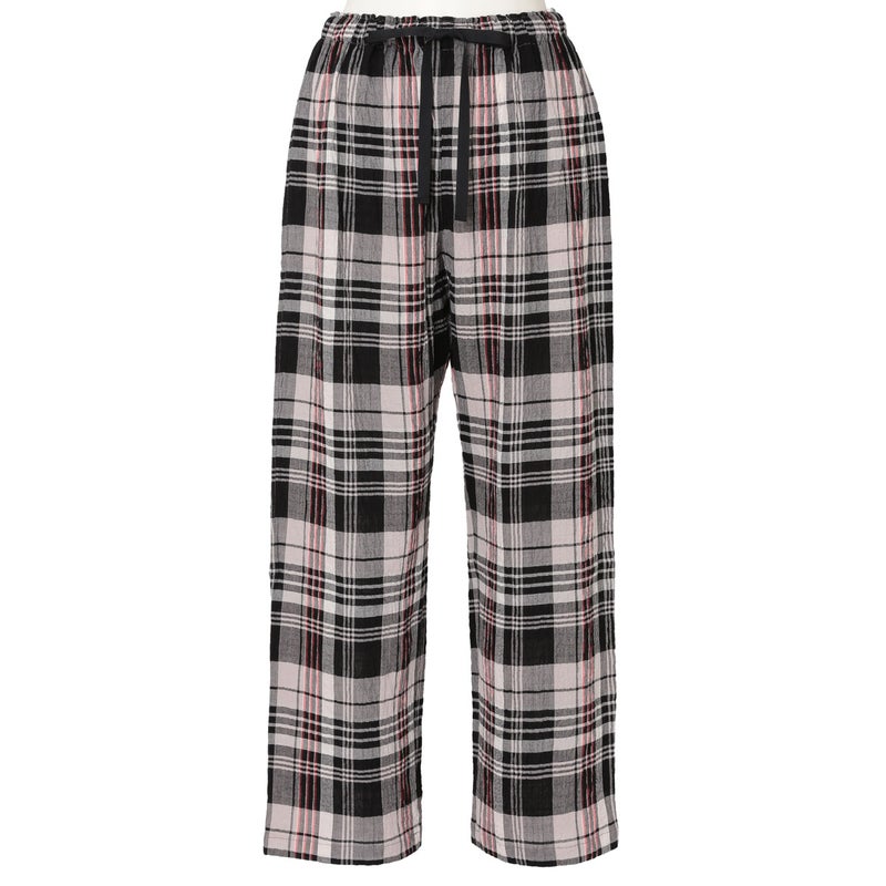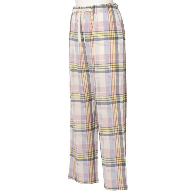 デコルテ周りをすっきり見せるスクエアネックのパジャマ。8分丈トップスの袖はゴムを入れパフスリーブに。家事や洗顔の際もまくりやすく、ふんわりしたシルエットが愛らしさを添えます。パンツはくるぶし丈。ウエストは総ゴム仕様に加え調整可能な紐を通しました。