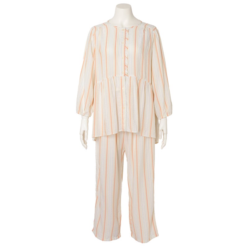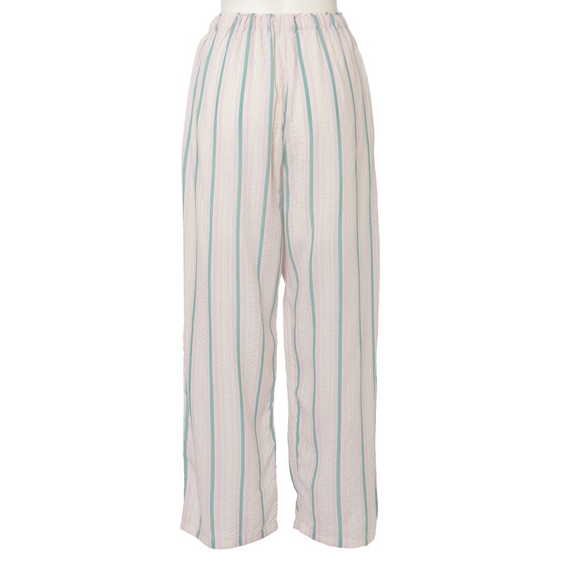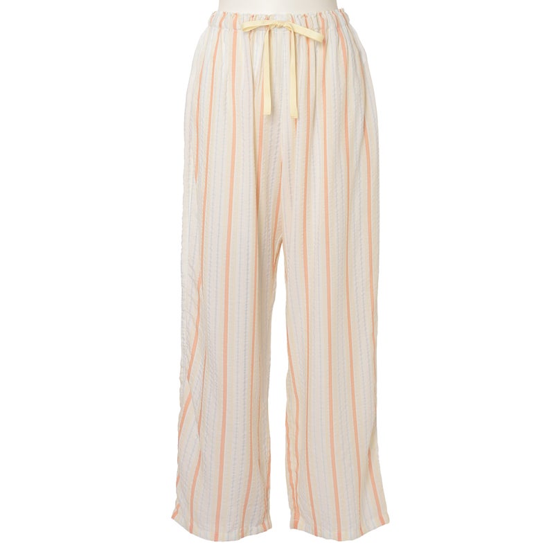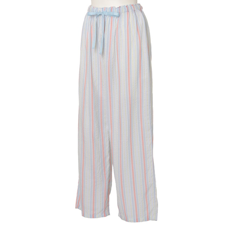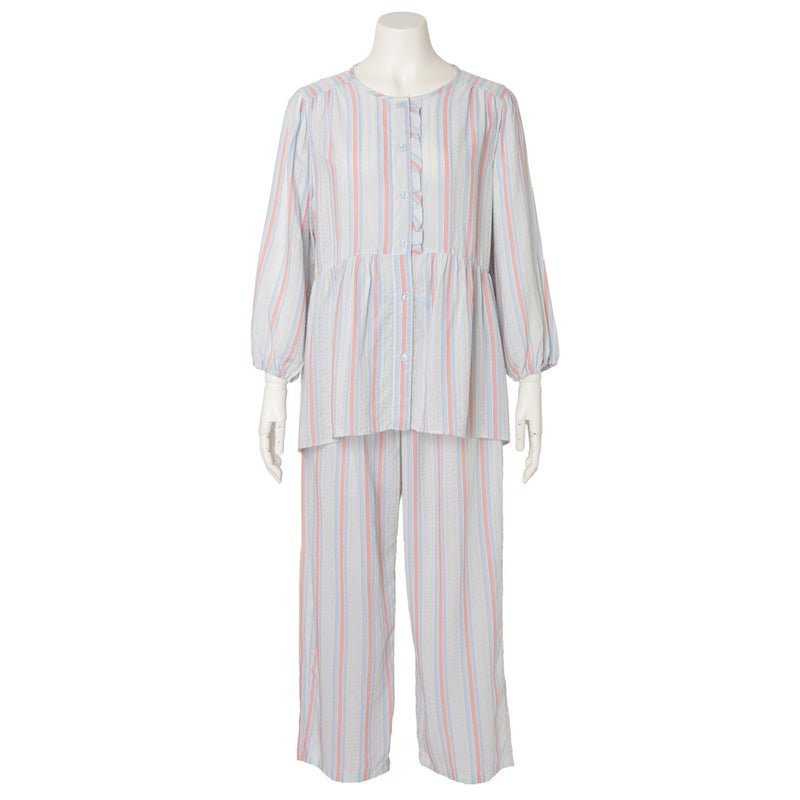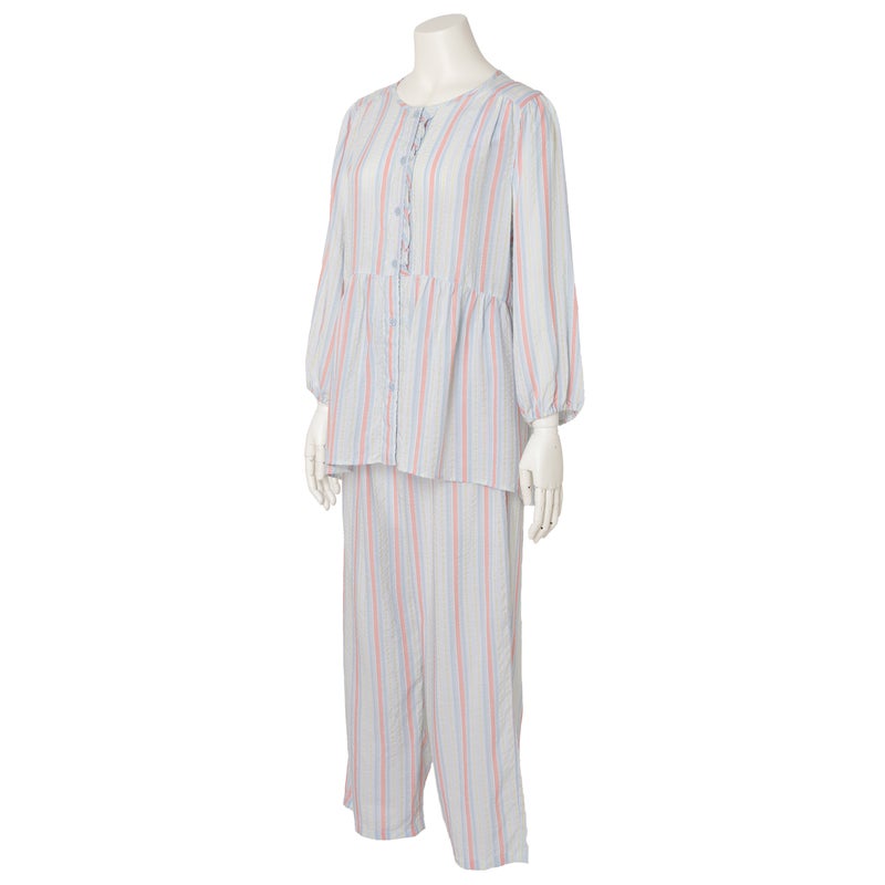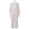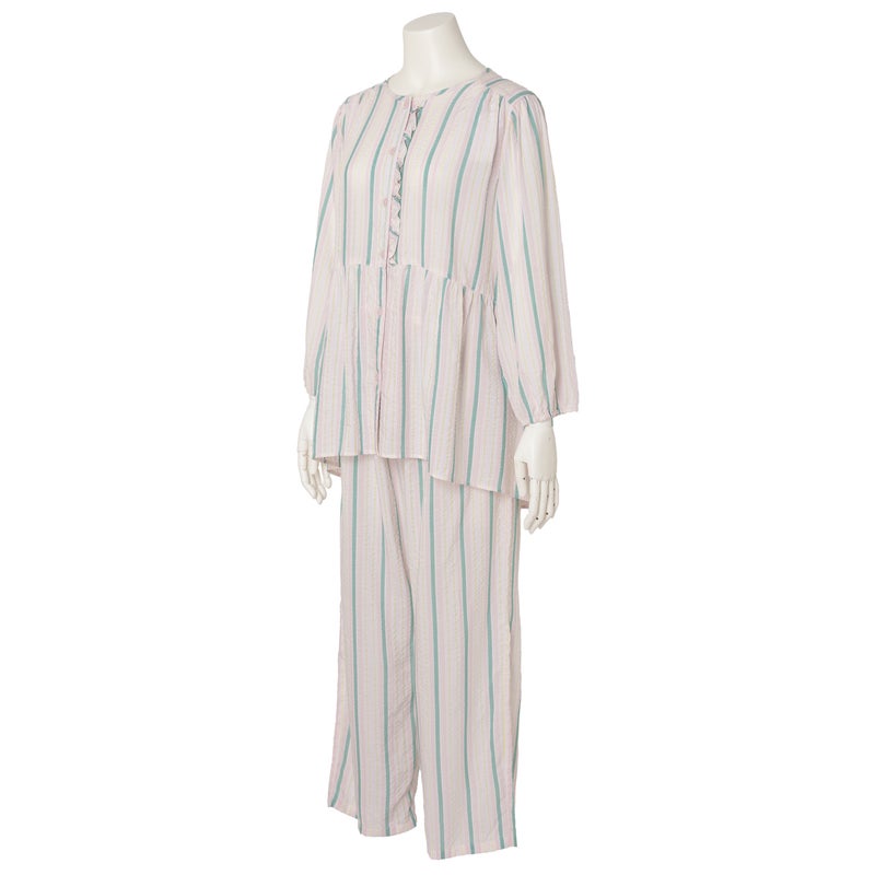 ペプラム切り替えトップスがフェミニンな8分袖パジャマ。前立てのフリルや丸みを出した袖口でかわいらしさをプラス。ウエストは総ゴムで調整紐付き。