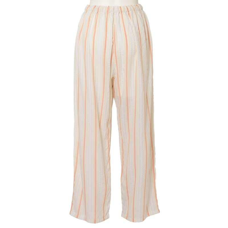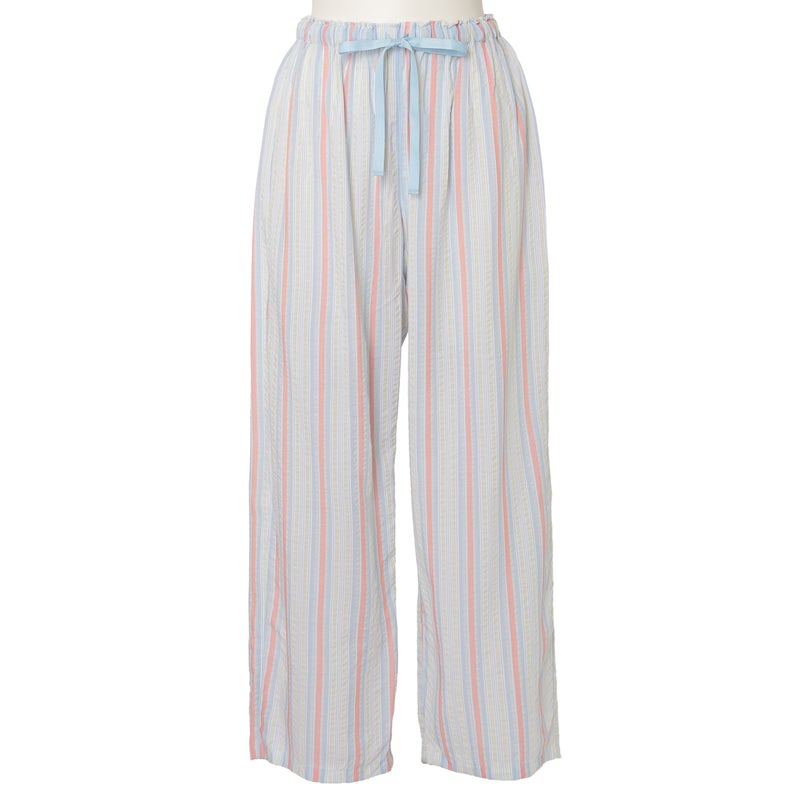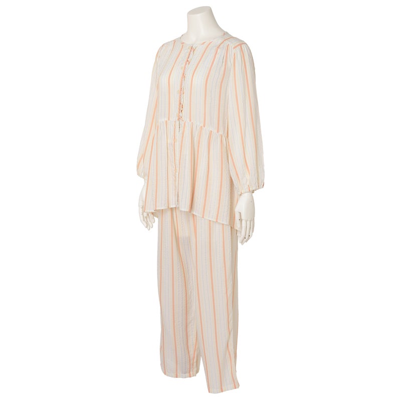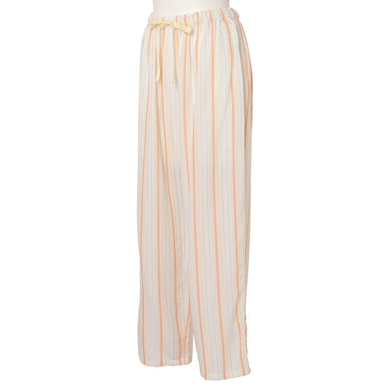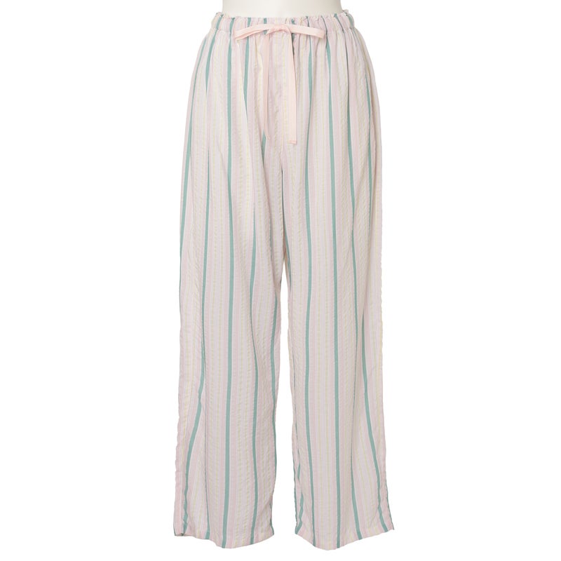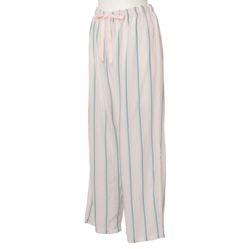ペプラム切り替えトップスがフェミニンな8分袖パジャマ。前立てのフリルや丸みを出した袖口でかわいらしさをプラス。ウエストは総ゴムで調整紐付き。
