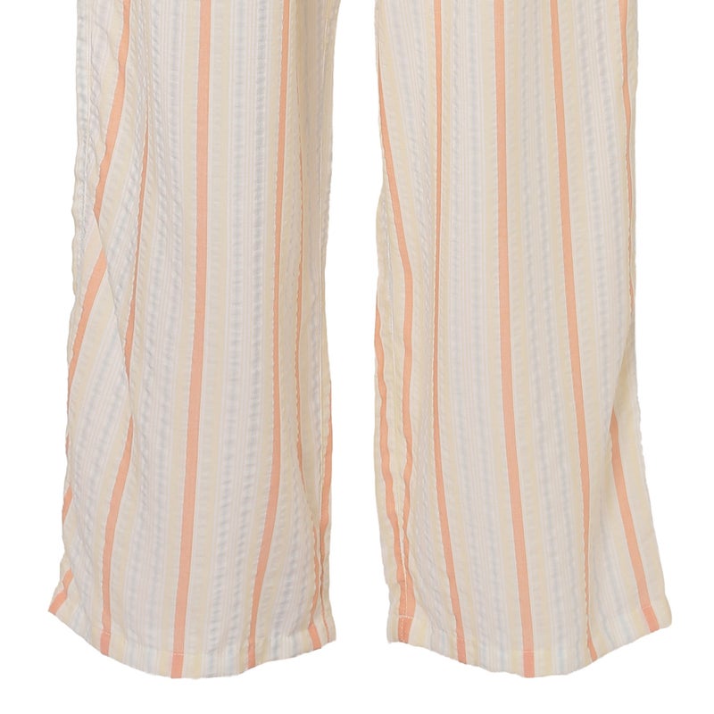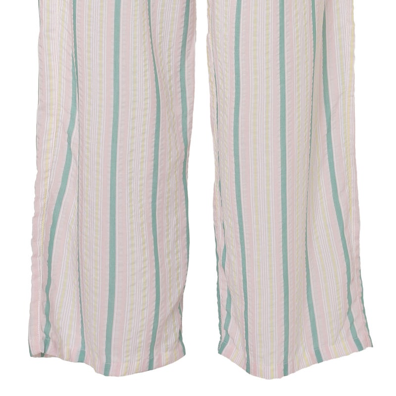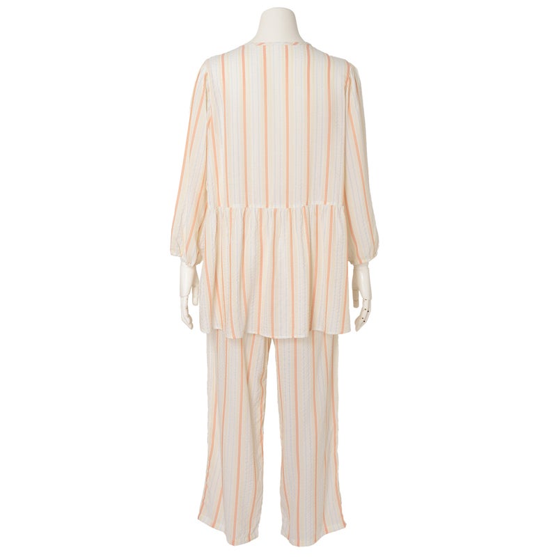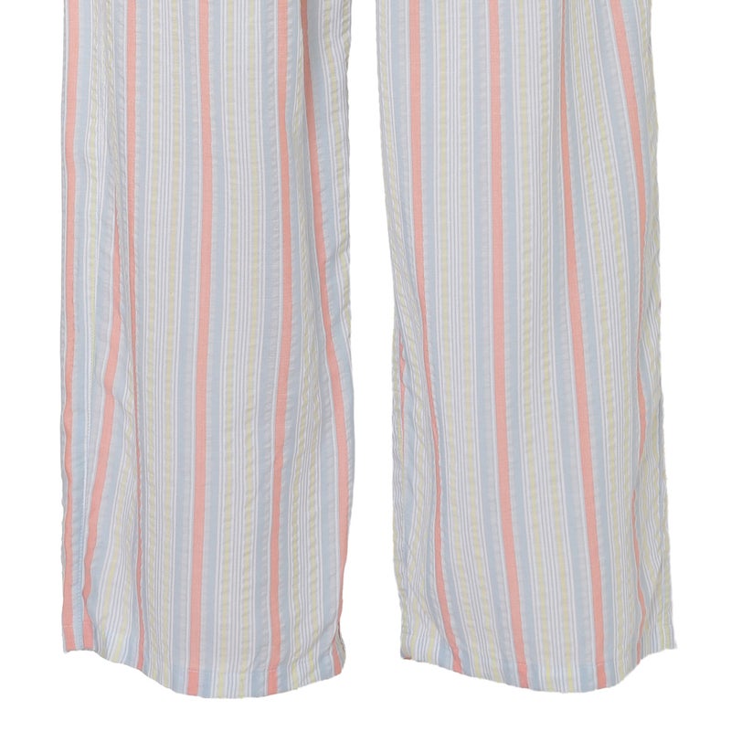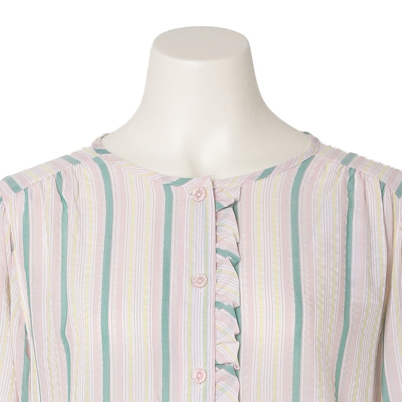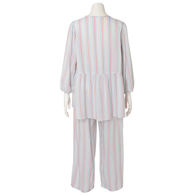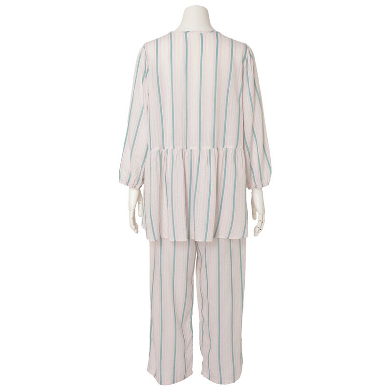 ペプラム切り替えトップスがフェミニンな8分袖パジャマ。前立てのフリルや丸みを出した袖口でかわいらしさをプラス。ウエストは総ゴムで調整紐付き。