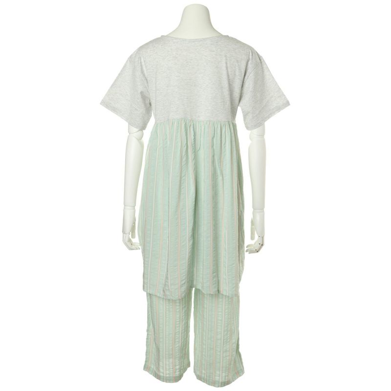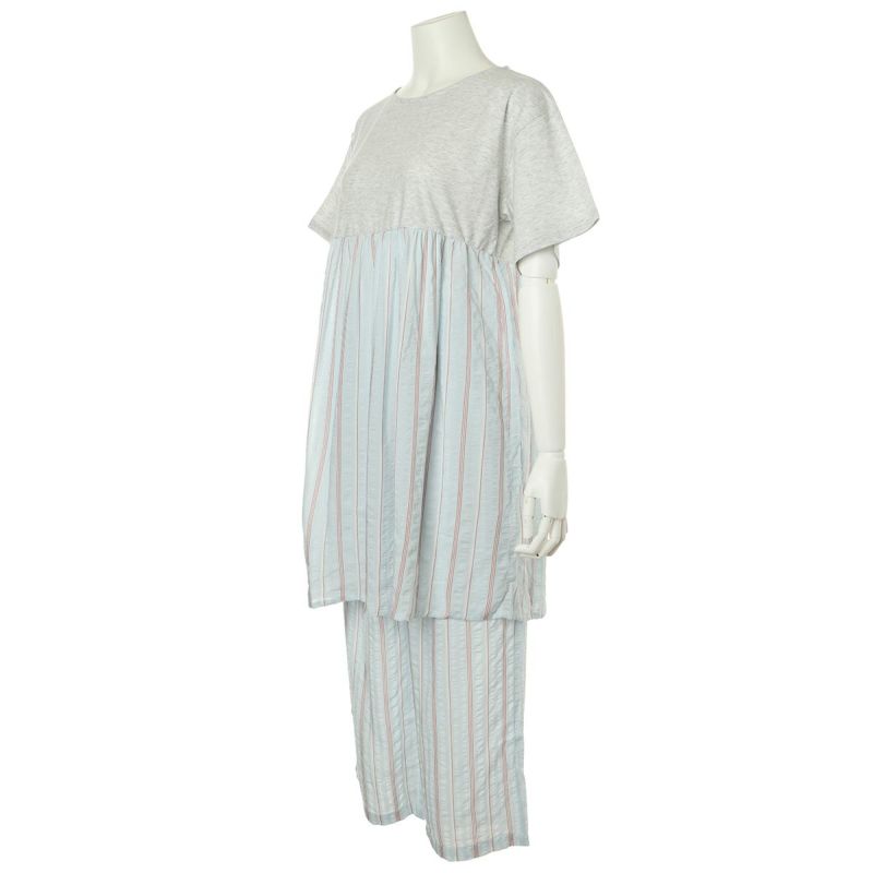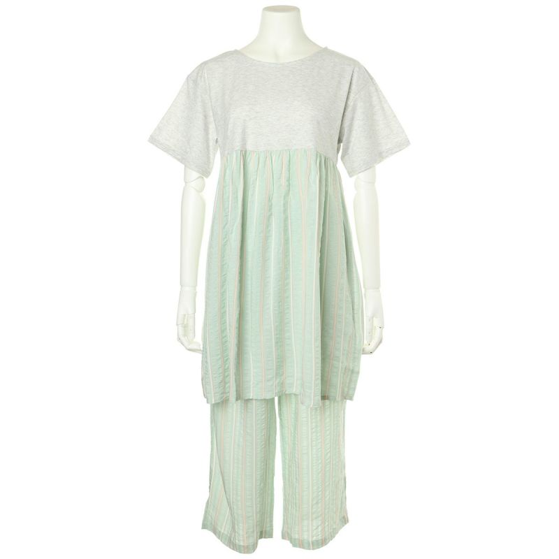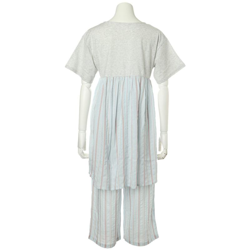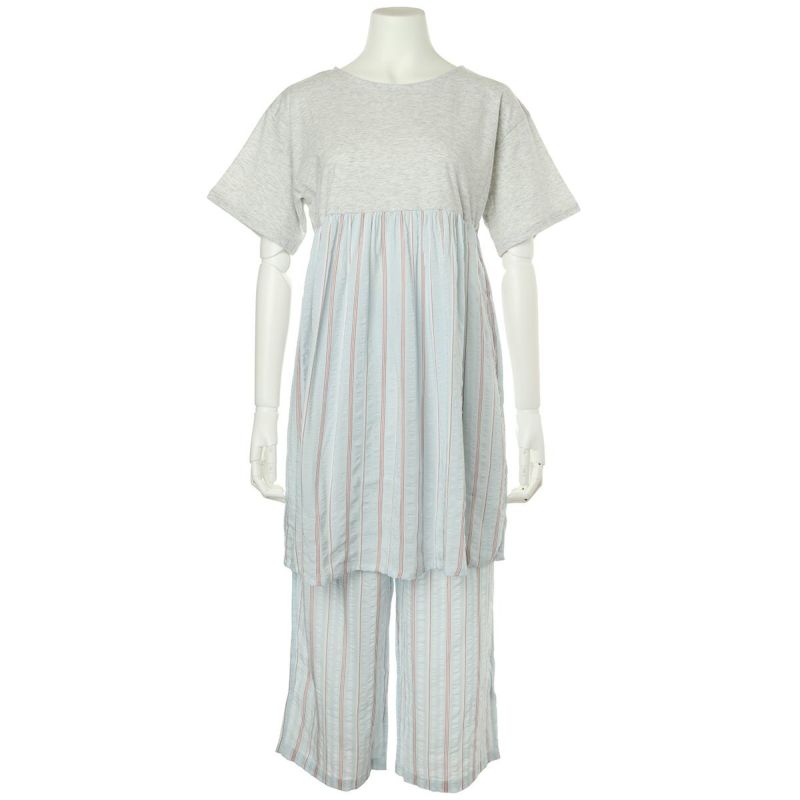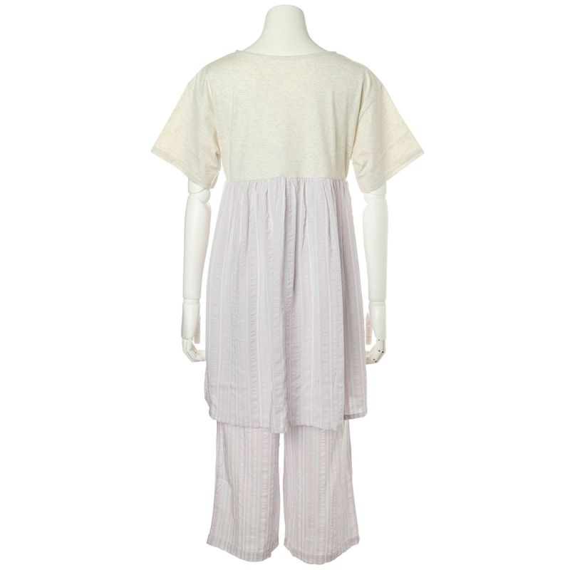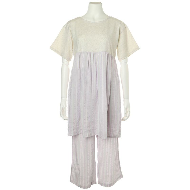 半袖パジャマは、チュニック丈トップスと八分丈ボトムスのセット。トップスは無地綿天竺とストライプを切り替えたデザイン。