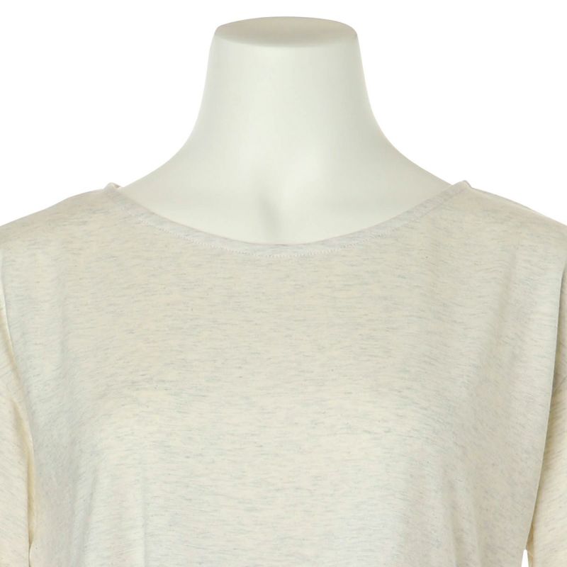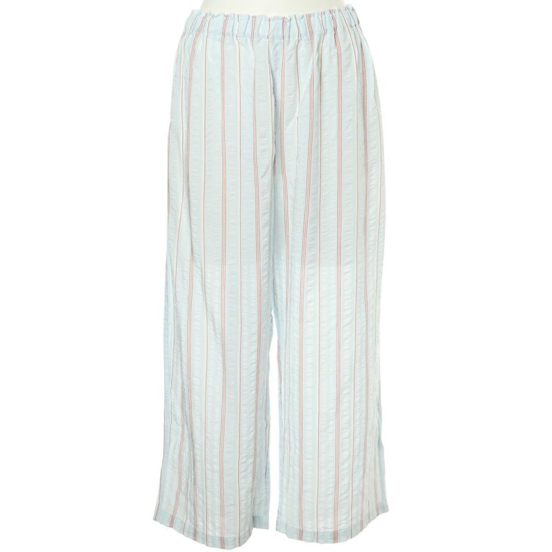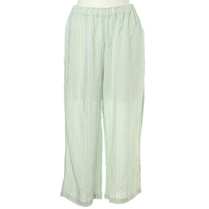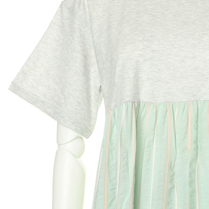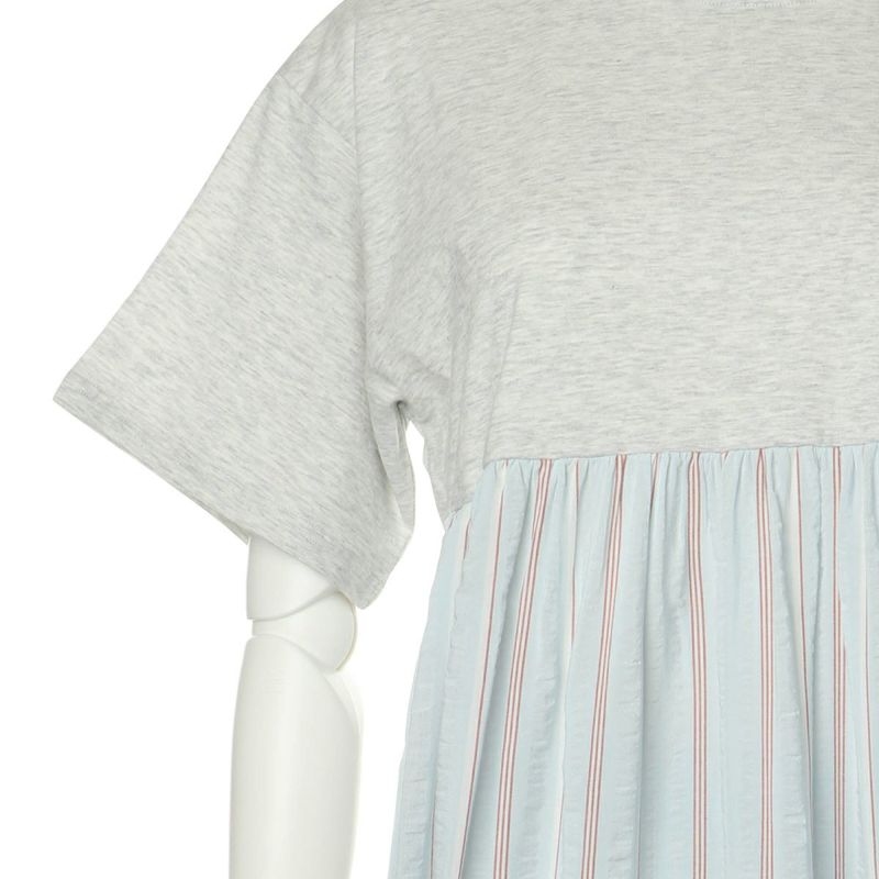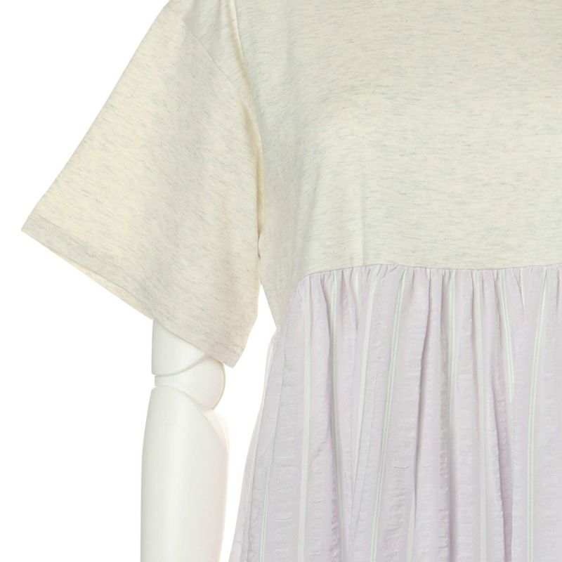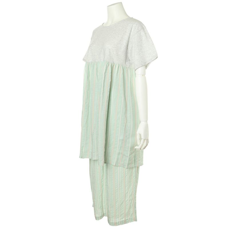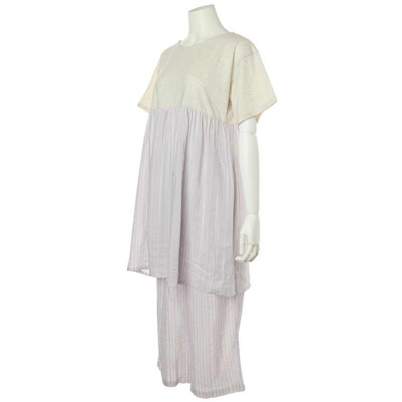 半袖パジャマは、チュニック丈トップスと八分丈ボトムスのセット。トップスは無地綿天竺とストライプを切り替えたデザイン。