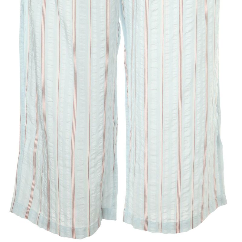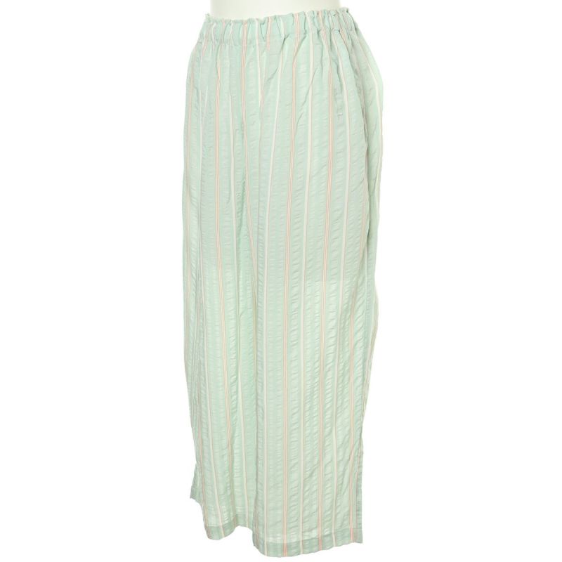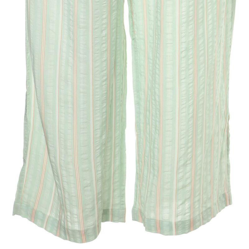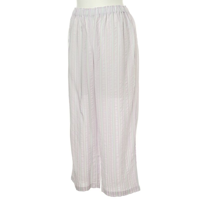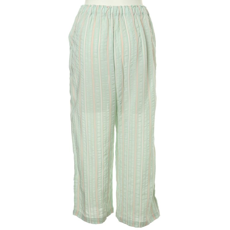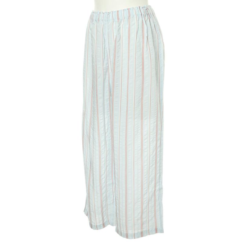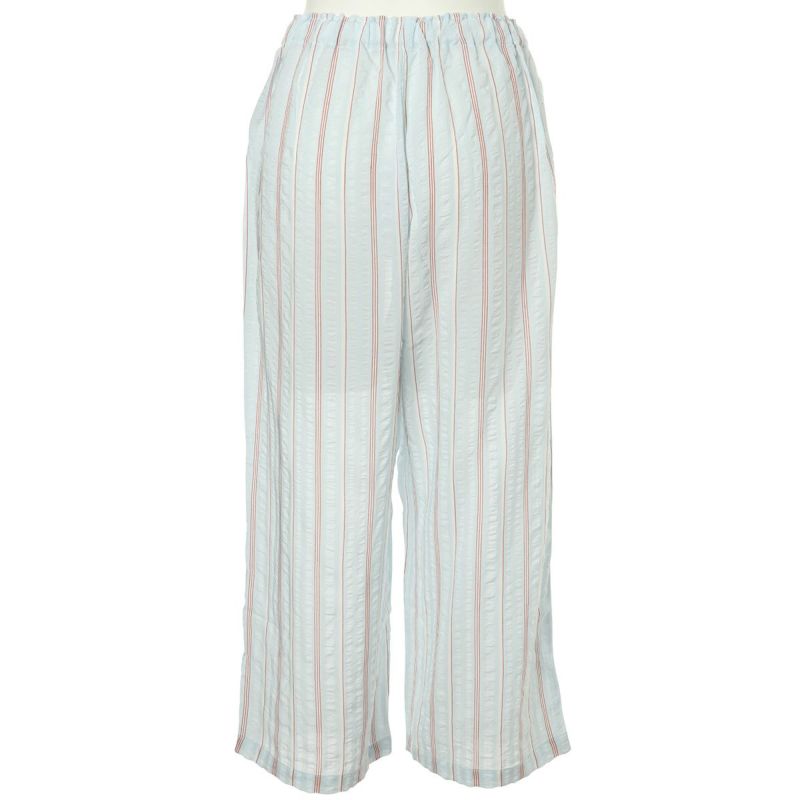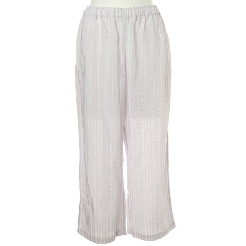 レーヨン混のサッカー素材を使用、自然な落ち感と凹凸がありシワが気になりにくいのが特徴。縦ラインを強調するストライプ柄は細見え効果も◎