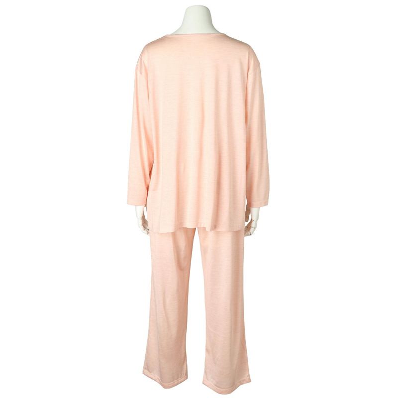長袖パジャマは、すっきりとしたノーカラー。切り替えラインにギャザーを寄せた女性らしいデザイン。