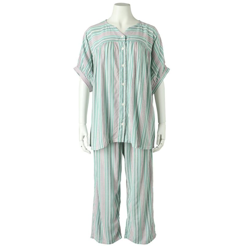 半袖パジャマは、ノーカラーの前開きタイプ。ドルマンスリーブでかわいく着られる。高めの位置にギャザーを寄せて切り替えラインを入れた、分量感のあるデザイン。8分丈ボトムで軽快に。