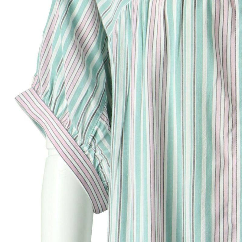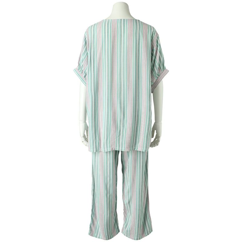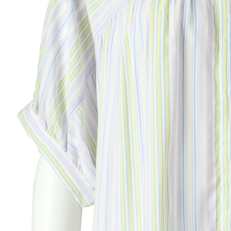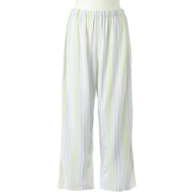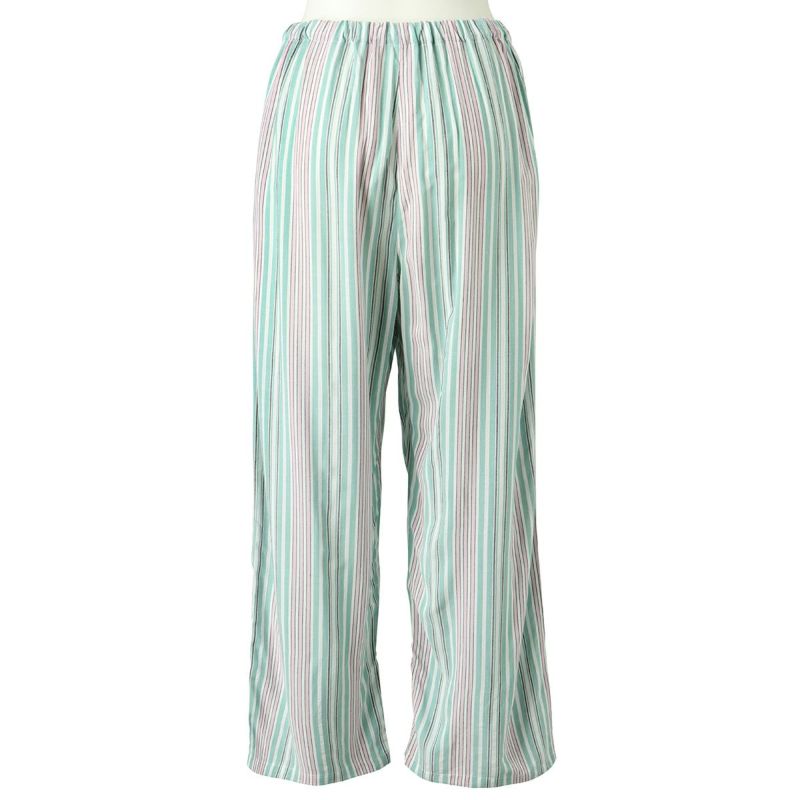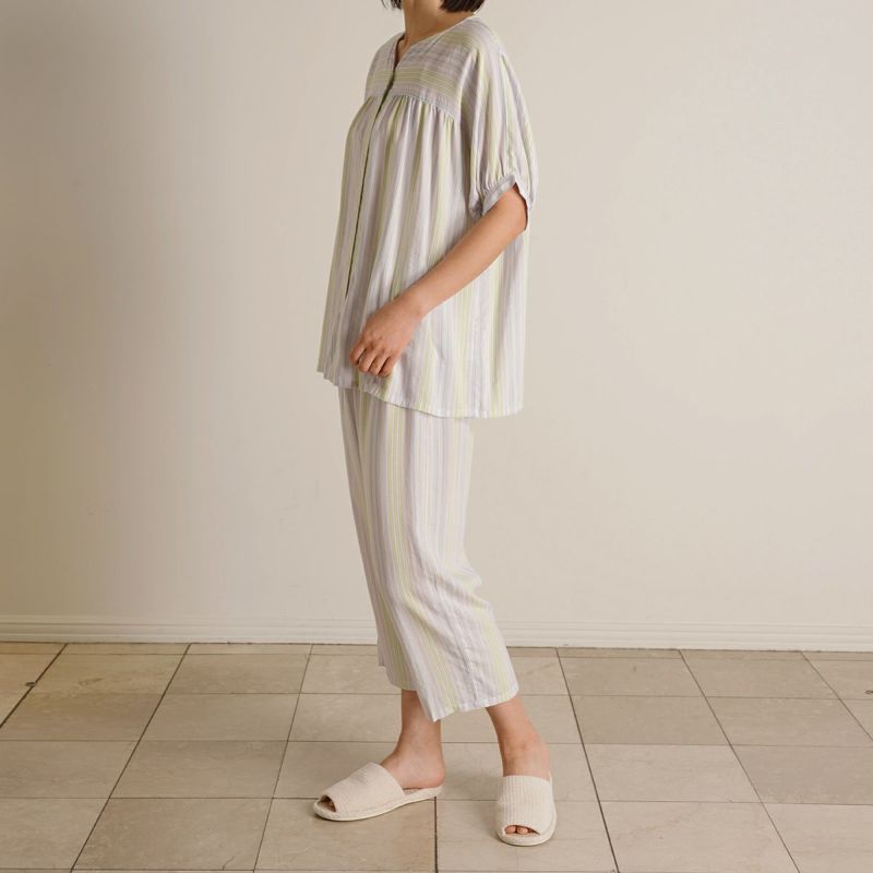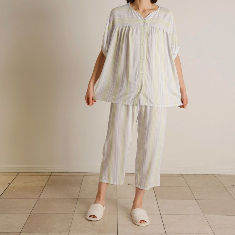 自然な落ち感のあるシルエットが人気のストライプナイトウェアシリーズ。レーヨンと綿の縮率差で生地に凹凸を出した肌離れの良い素材。配色が爽やかなのラベンダーとグリーンの2色展開。