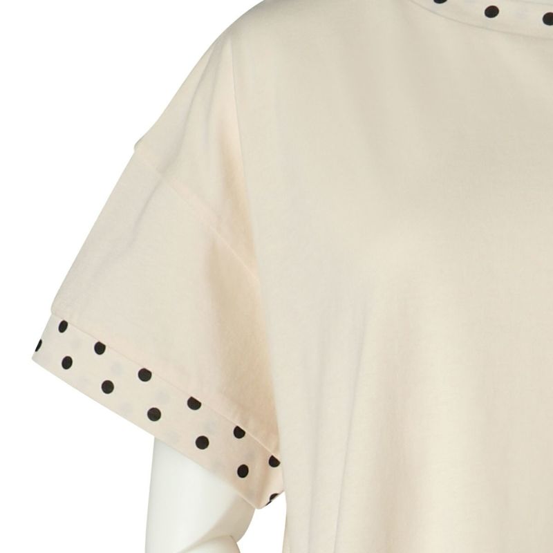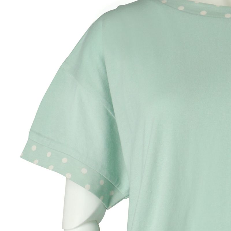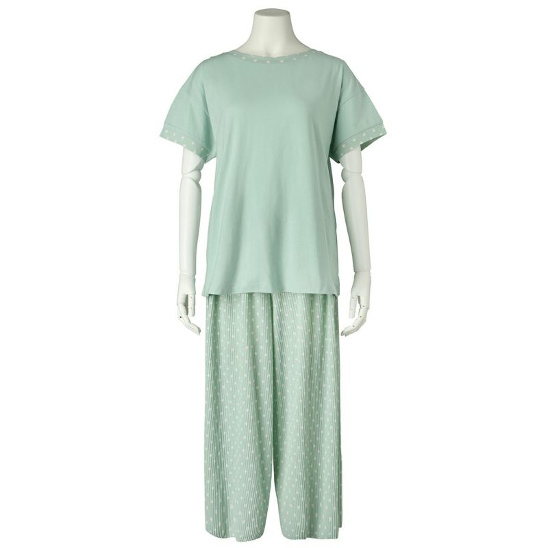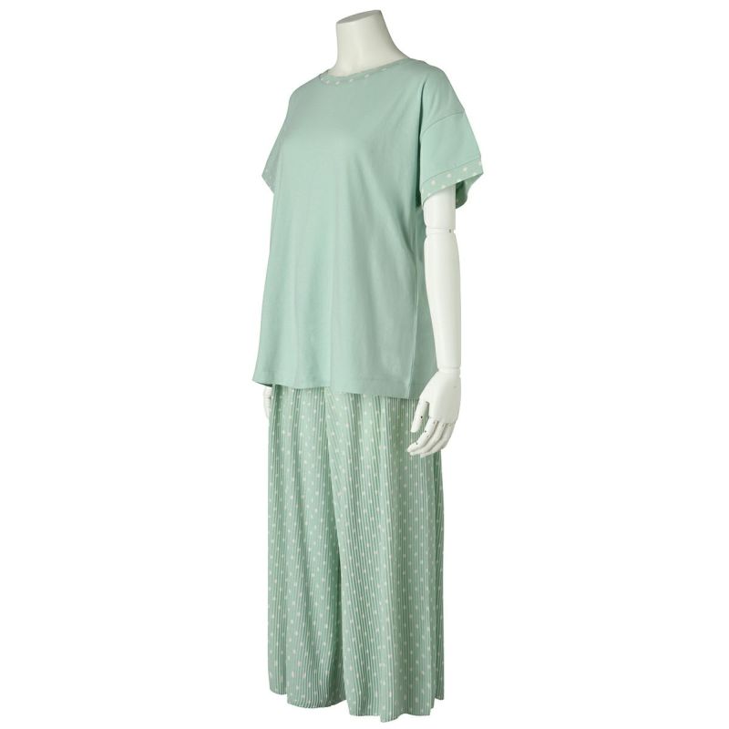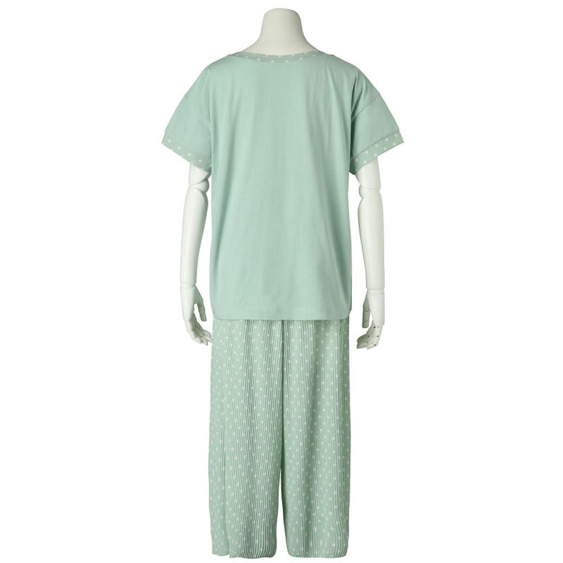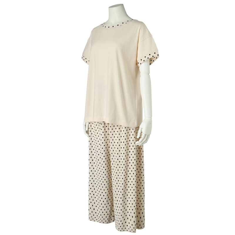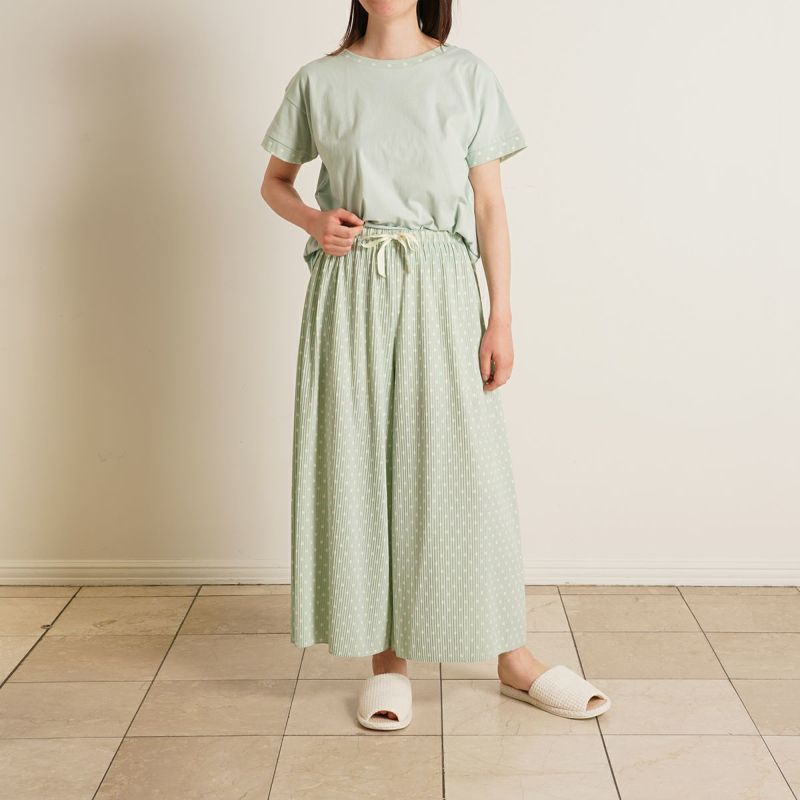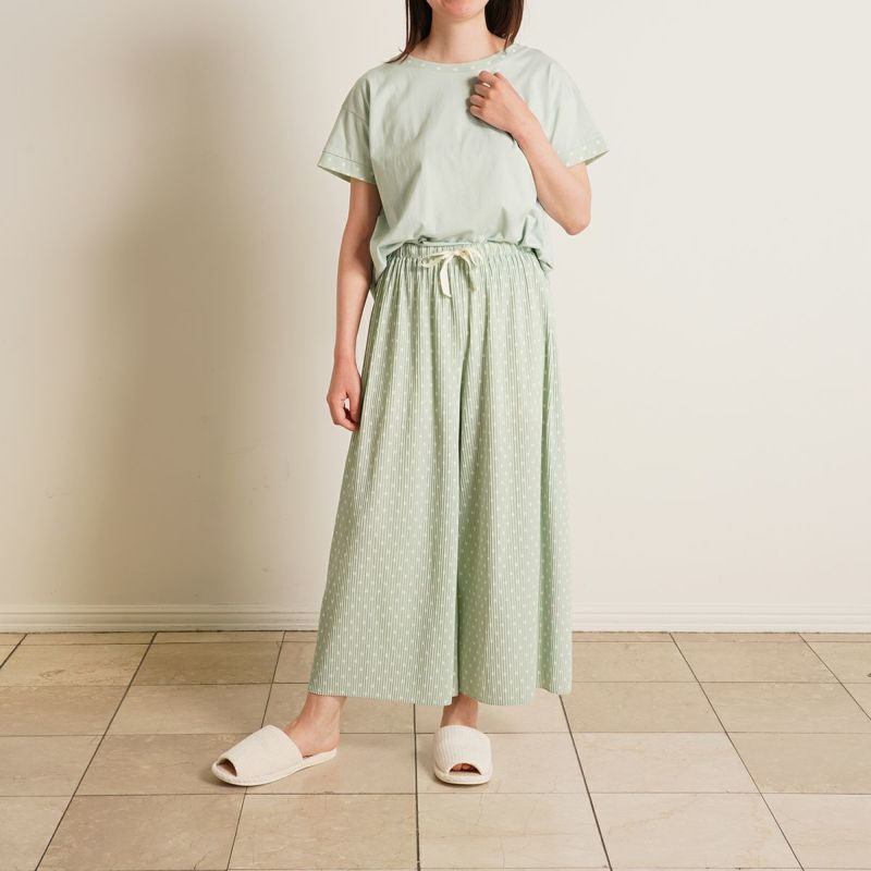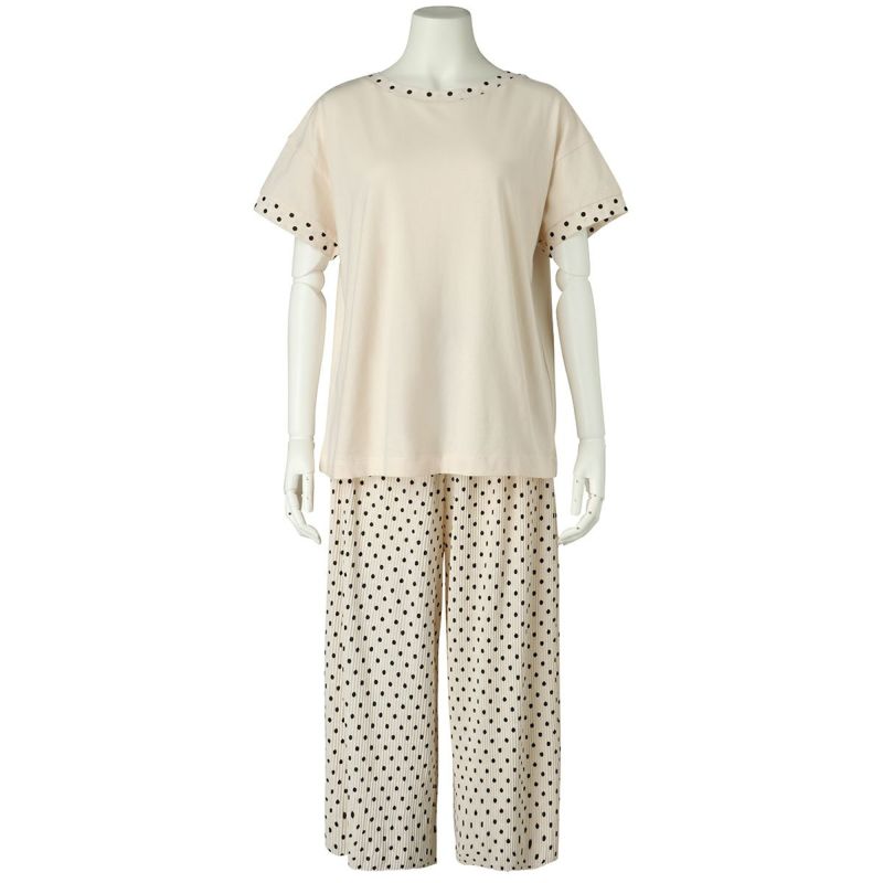 半袖パジャマは、トップスはシンプルなTシャツデザイン。ボトムはプリーツをかけたドット柄で程よい幅でサラッと着られる。襟ぐり・袖口に当てたドットの別布がシンプルながらアクセントに。