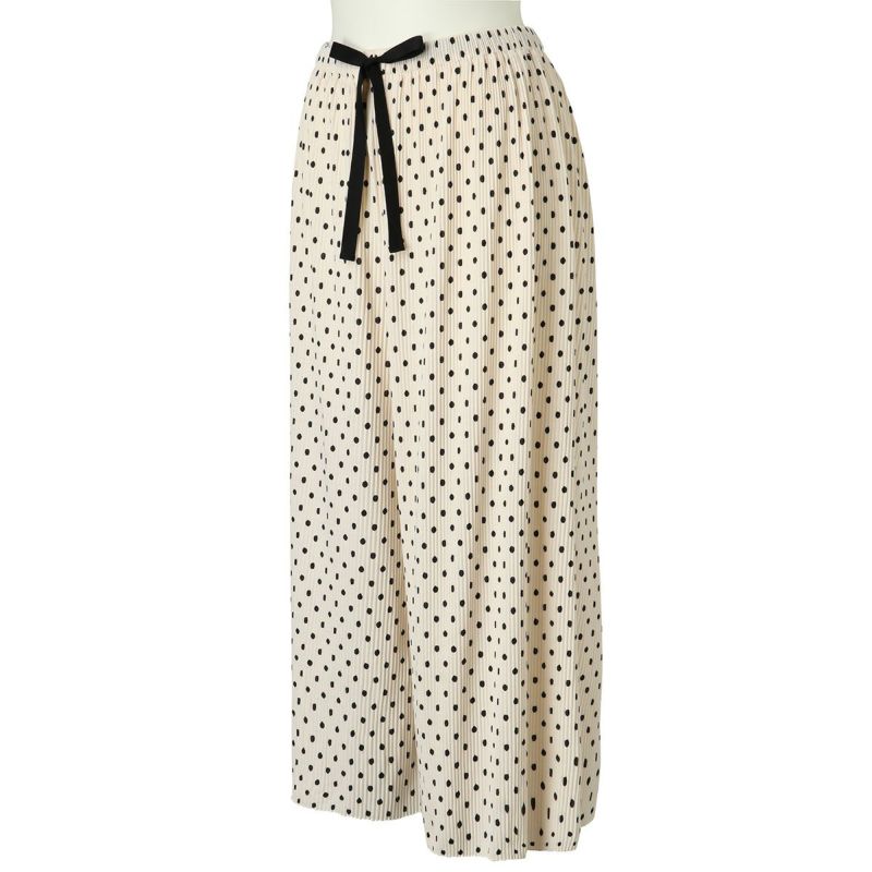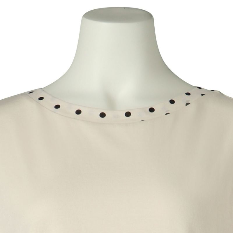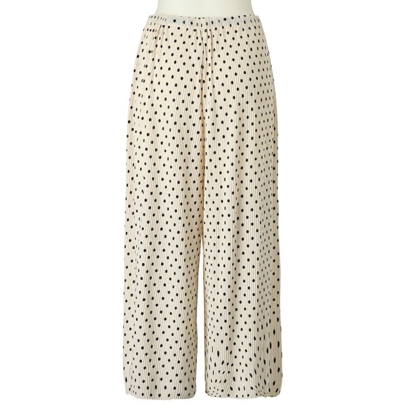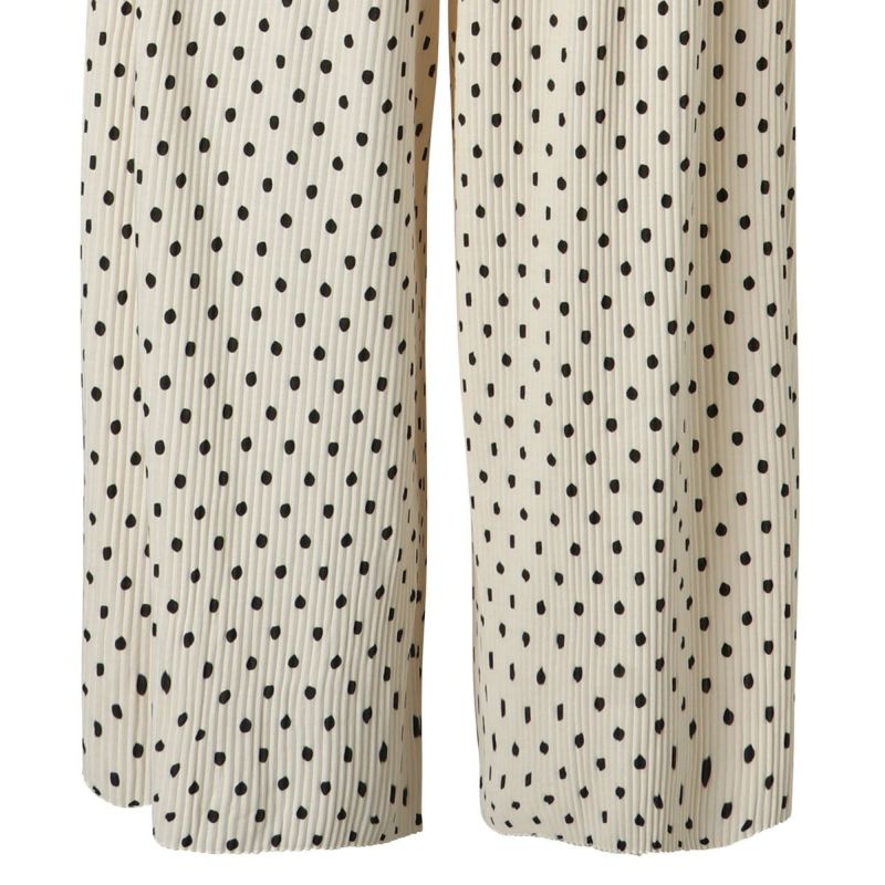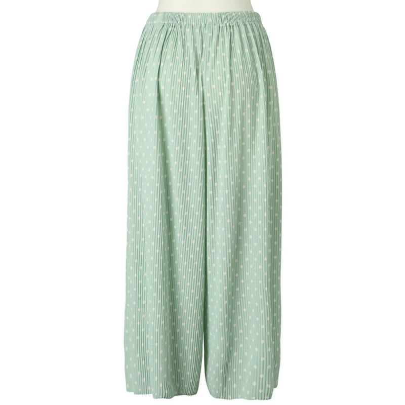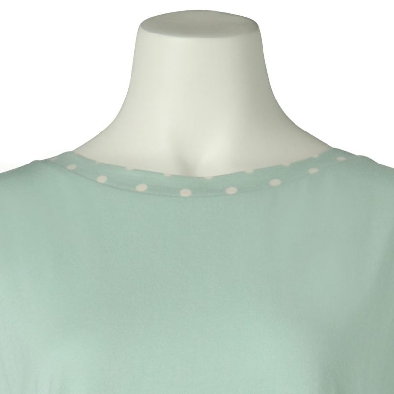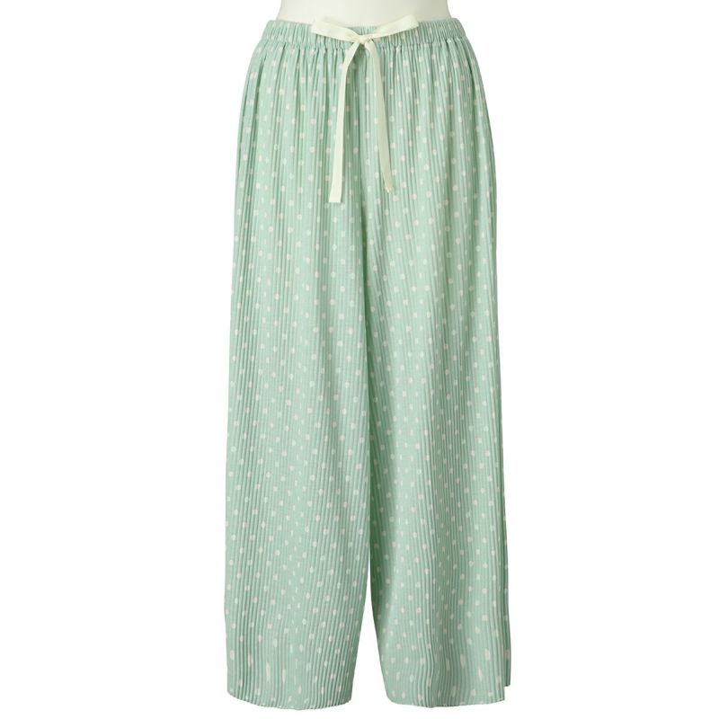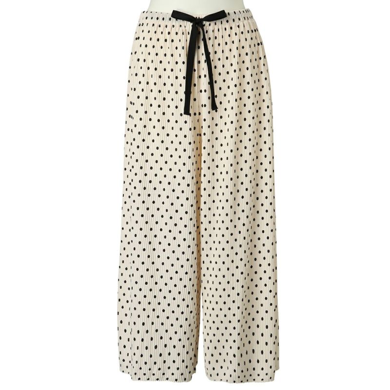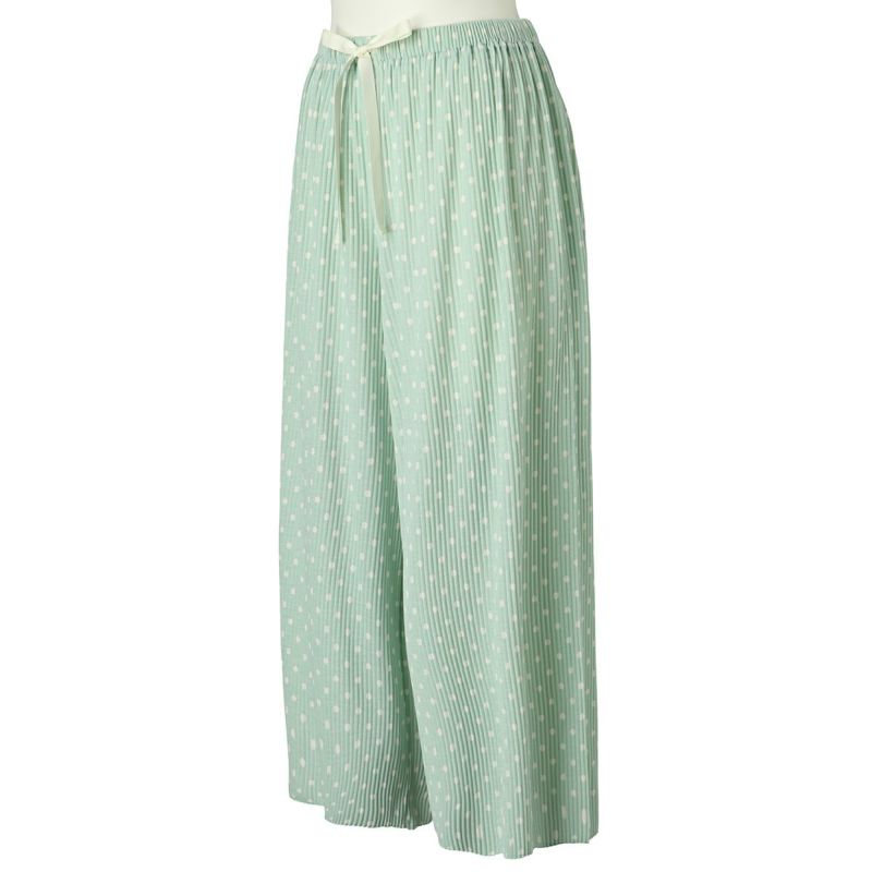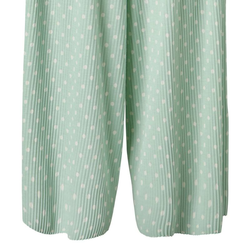 半袖パジャマは、トップスはシンプルなTシャツデザイン。ボトムはプリーツをかけたドット柄で程よい幅でサラッと着られる。襟ぐり・袖口に当てたドットの別布がシンプルながらアクセントに。