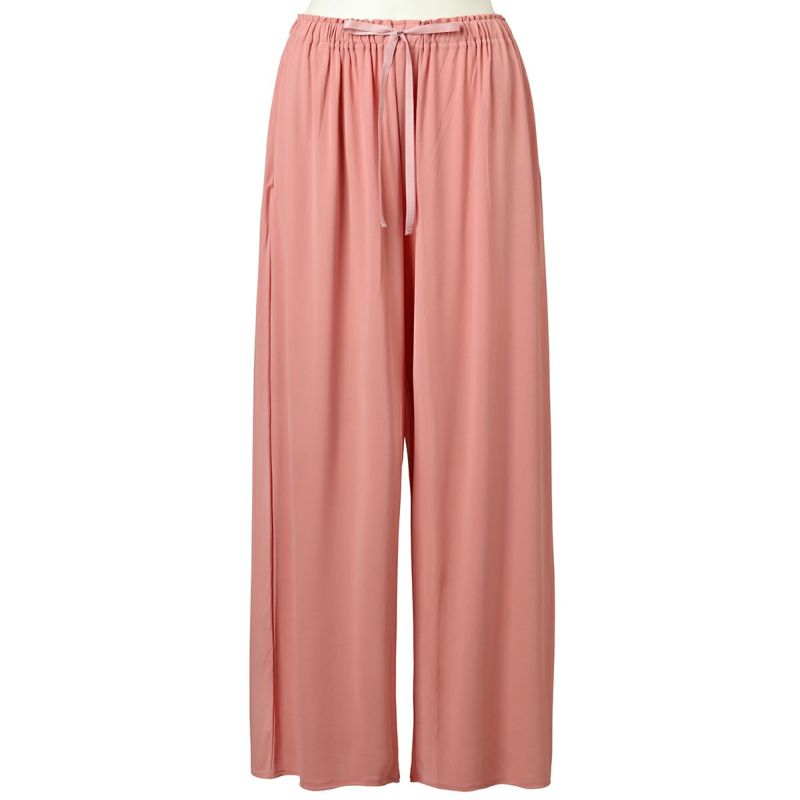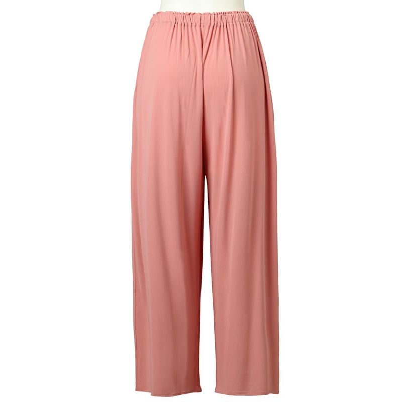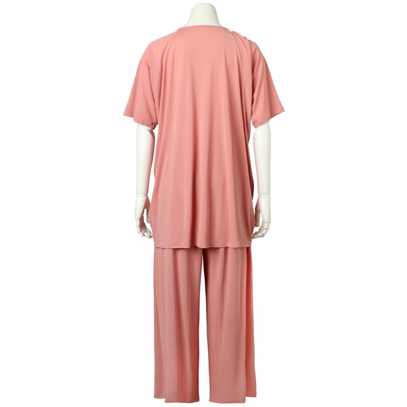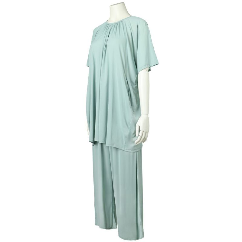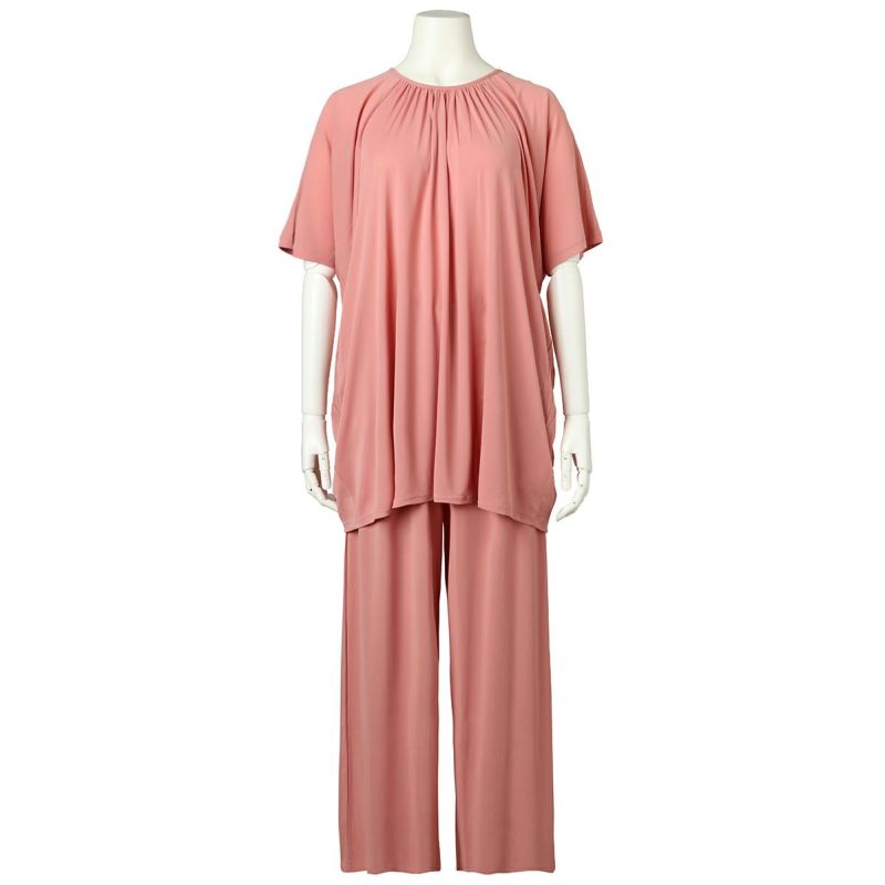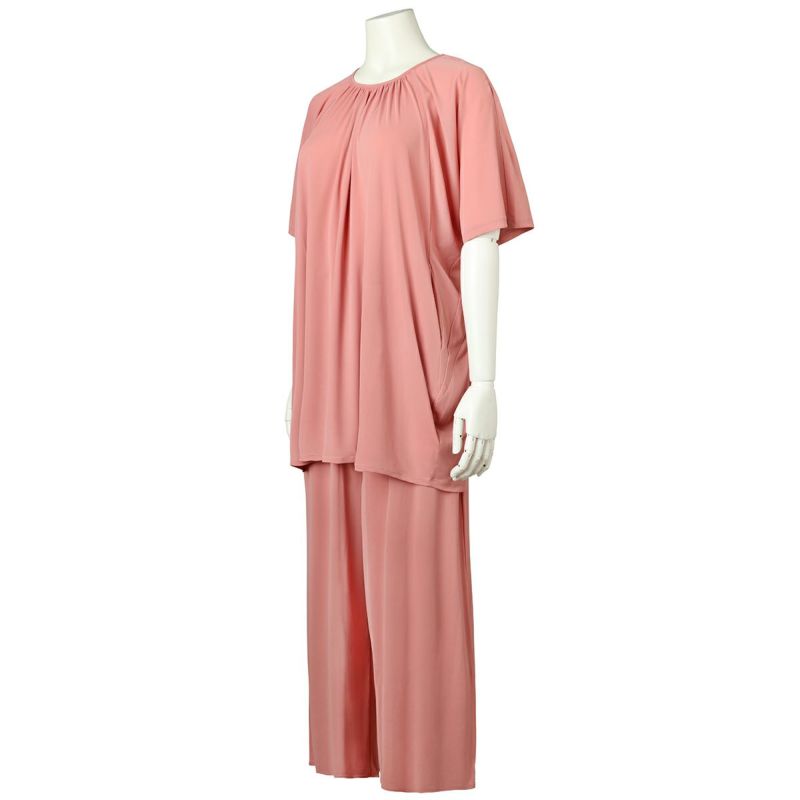 ラグランで楽に着れ、落ち感が美しいトップスとワイドなシルエットのボトムのセット。肌にべたッとしない着心地のため夏を気持ちよく過ごせます。トップスは長めの着丈なので気になるお腹まわりもカバーし、便利なポケット付きに。