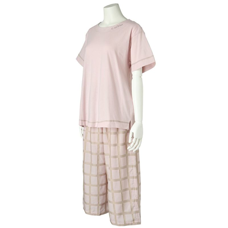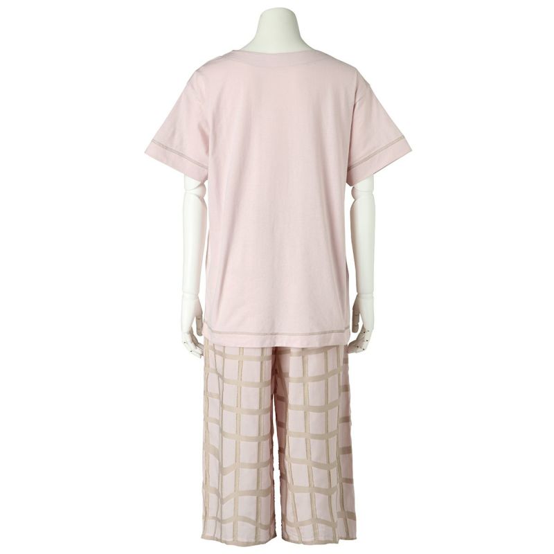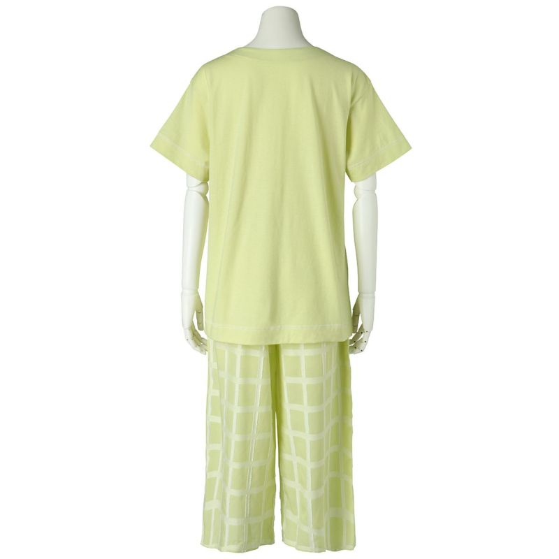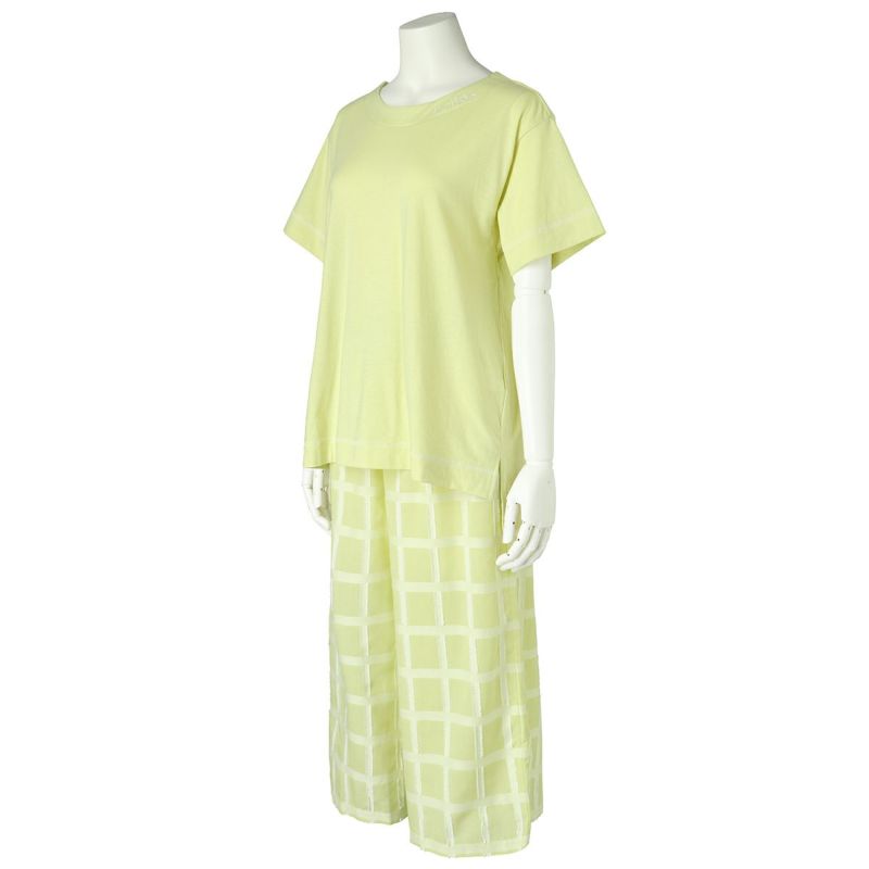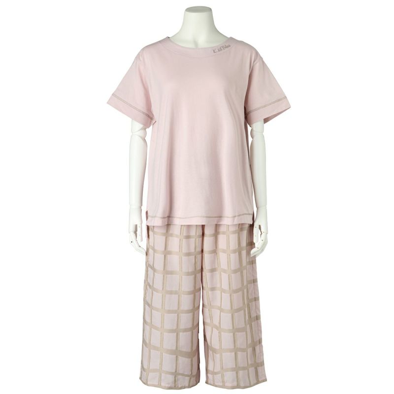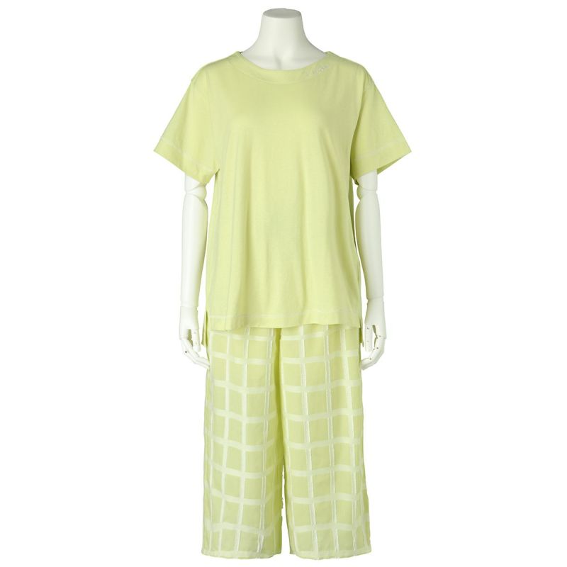綿天竺カットソーと布帛ボトムのセット。トップスはボックスシルエットでゆったりとした着用感。襟の刺繍がポイント。ボトムは涼やかな8分丈。ペアギフトにもおすすめ。