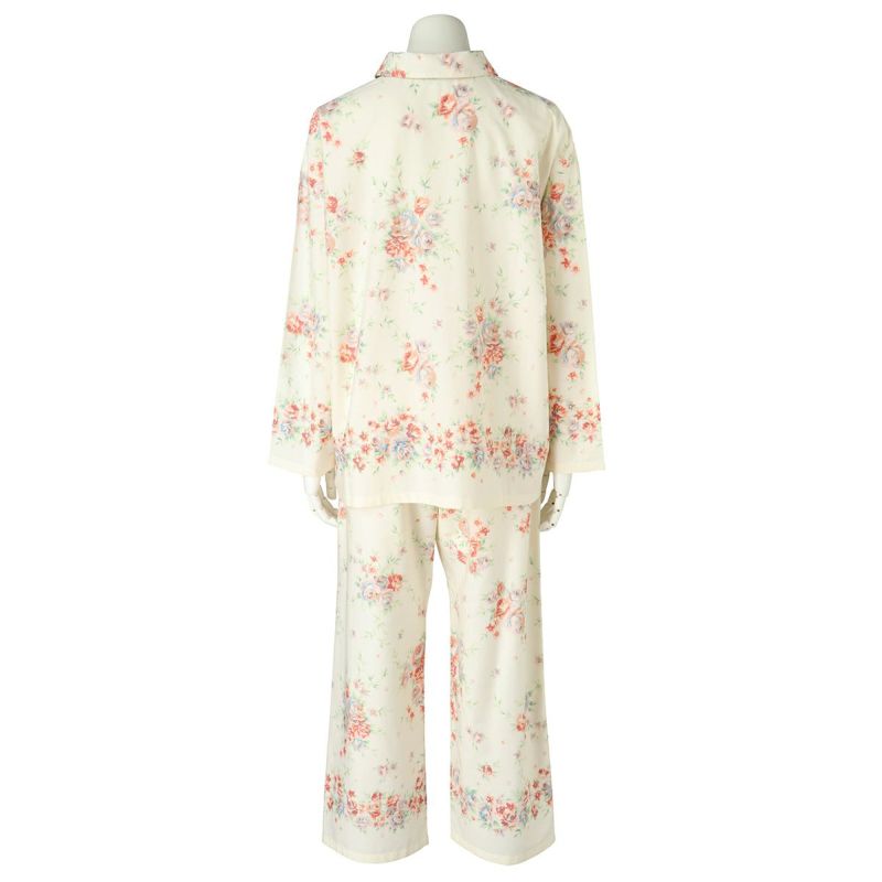 長袖パジャマは、襟付きの前開きデザイン。柄を活かしたシンプルなシルエット。裾や袖口にライン状に並んだブラッサムも美しい。
