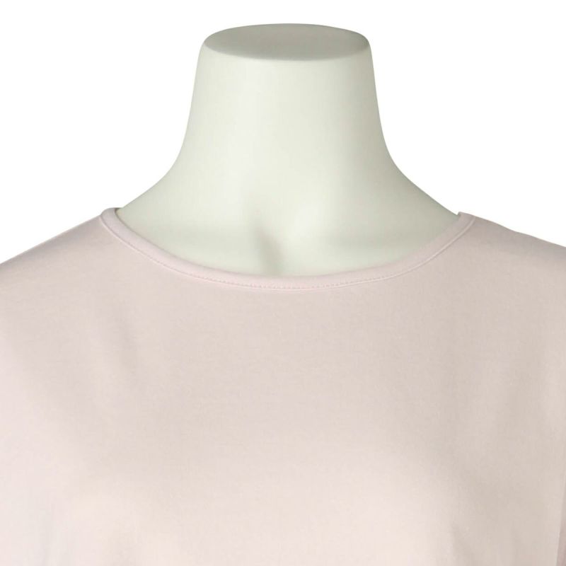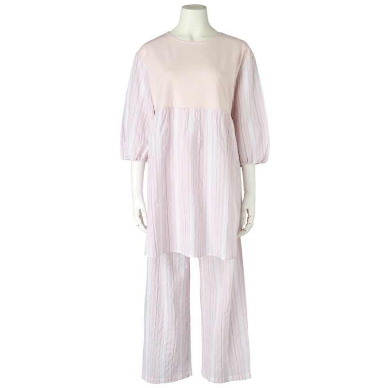 7分袖パジャマは、お尻が隠れる丈感のチュニックデザイン。ギャザーの袖はソフトなゴムを入れ、まくりやすい。前身頃に天竺生地を使用し、就寝時なども快適な着心地です。
