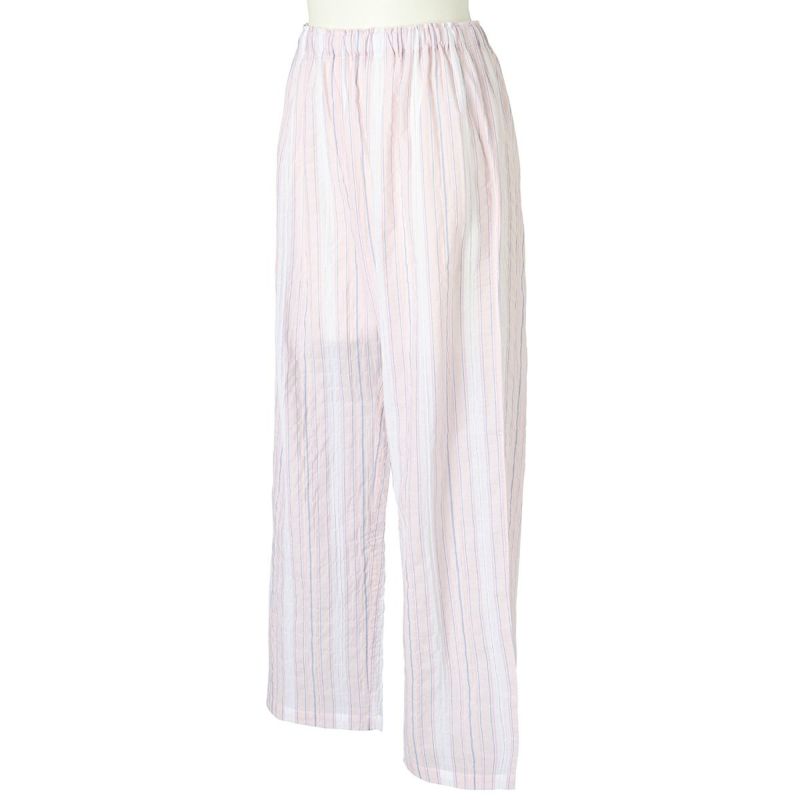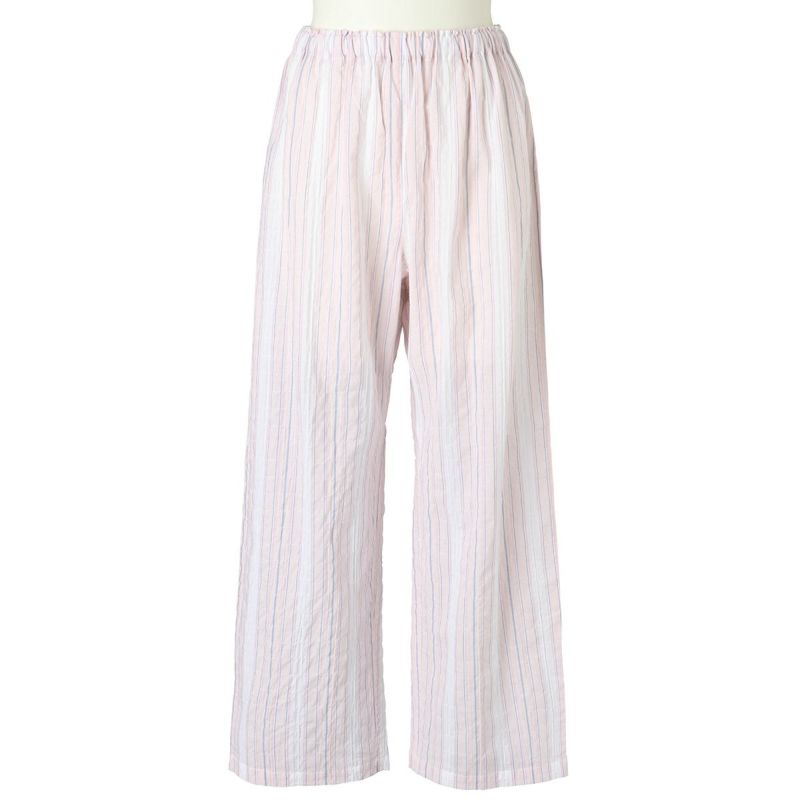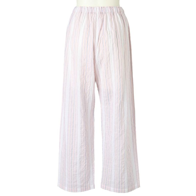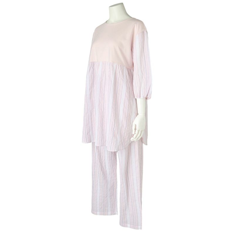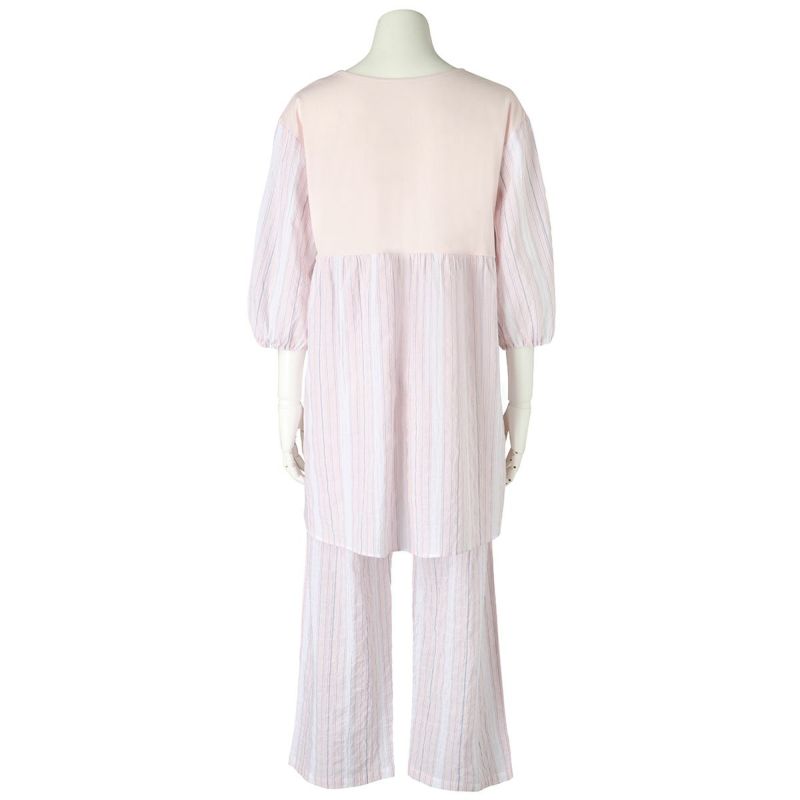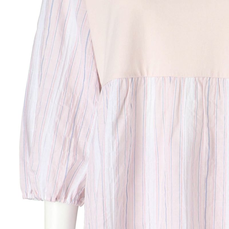 布帛のストライプに天竺生地を部分的に組み合わせた、身体の動きに馴染みやすいデザインのナイトウェア。ストライプの布帛部分は横糸にポリウレタンを入れた表面感があるさらっとした人気素材。