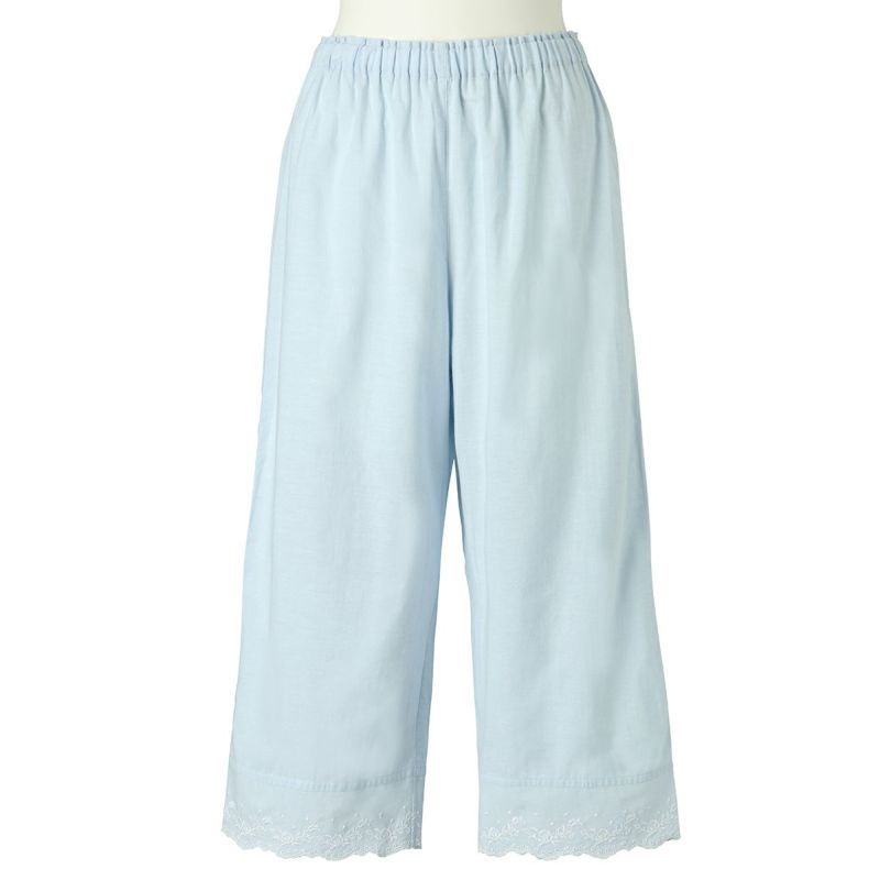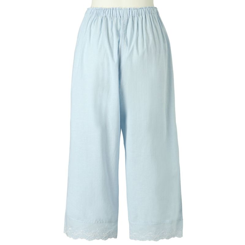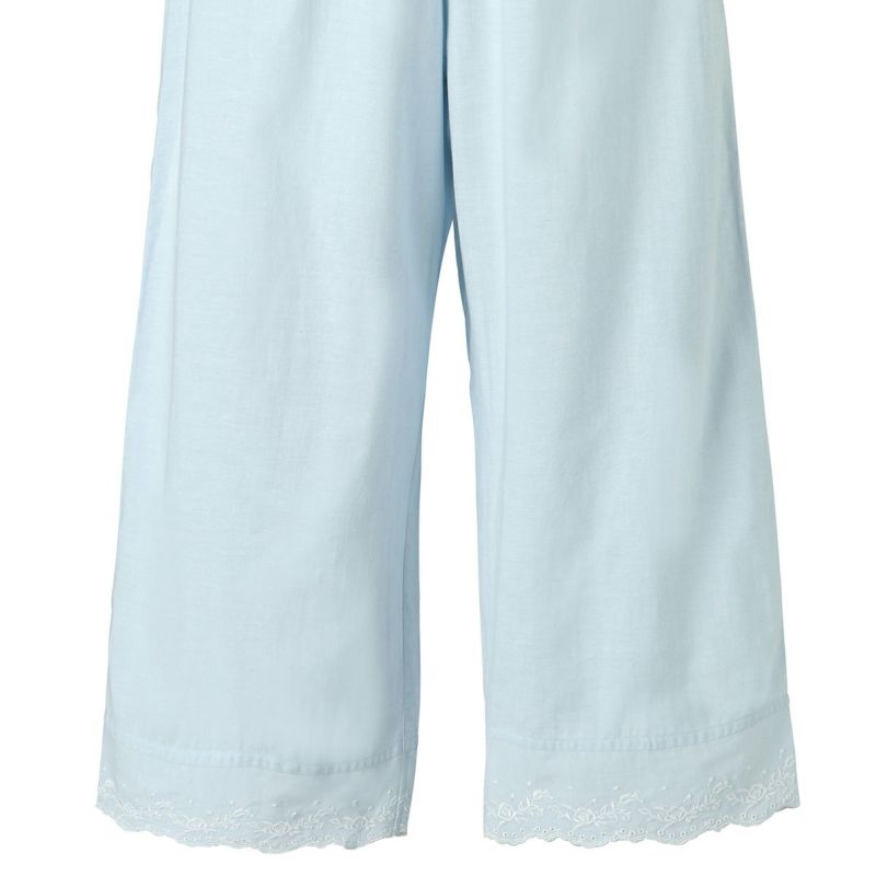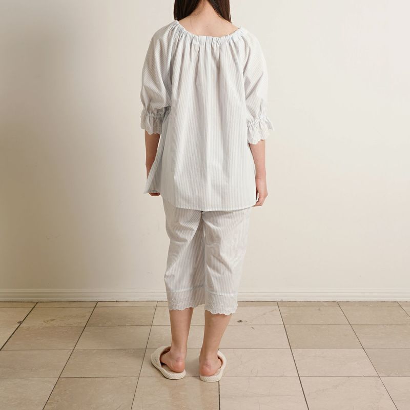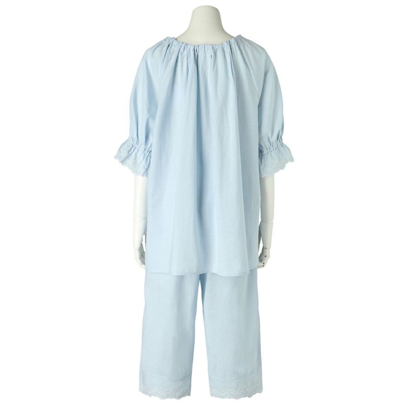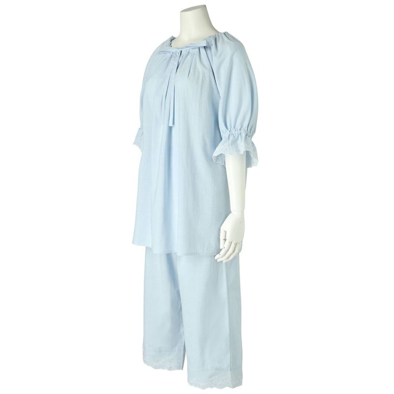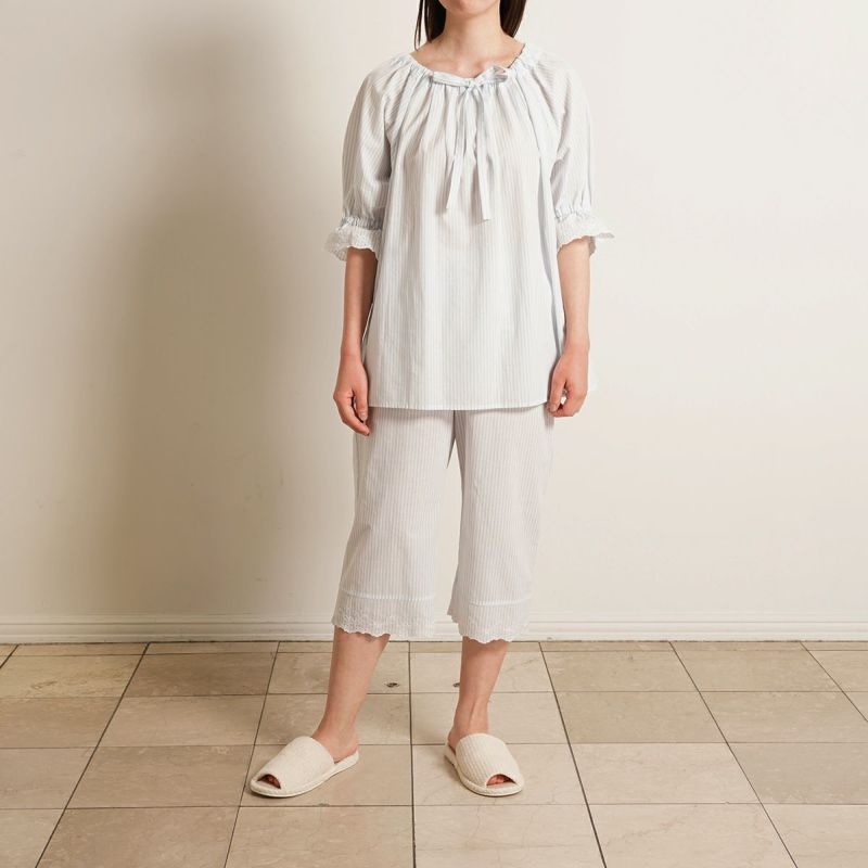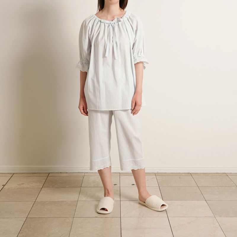 6分袖パジャマは、フェミニンなブラウス風デザイン。襟もとのフリルや袖口のギャザー使いなど愛らしいディティールが満載です。上の襟はフリルにしたエンブロイダイリーレースのハシゴ穴部分にリボンを通した手の込んだディティール。7分丈パンツは裾のエンブロイダリーレースの透け感も軽やか。首回りの開き具合はリボンで調整が可能です。